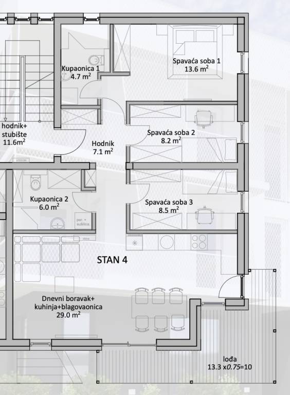 Sveti Ivan Zelina, četverosoban stan u modernoj novogradnji s ukupno šest stanova, smješten na izvrsnoj lokaciji u neposrednoj blizini centra.Stan oznake 4 na prvom katu zatvorene površine 77,2 m2, loggie 13,3 m2 (10) spremište 2,9 m2 (1,5), vanjsko parkirno mjesto 12,5 m2 (2,5) ukupno neto korisne površine 91,2 m2.Sastoji se od ulaznog pretprostora, prostranog dnevnog boravaka s kuhinjom i blagovaonicom te izlazom na loggiu, tri spavaće sobe i dvije moderno opremljene kupaonice.Investitor u ovoj fazi izgradnje nudi tri različite varijante tlocrta, što kupcu omogućuje maksimalnu prilagodbu prostoru.Izuzetno kvalitetno opremljen: troslojni parket natur, keramika prve klase, podžbukna miješalica za tuš kao i kvalitetna oprema u kupaonici, BOSCH dizalica topline, podno grijanje, BOSCH klima uređaj s WiFi modulom, portafon, CCTV zgrade, vanjska PVC stolarija s troslojnim staklom punjeno plinom, ulazna protuprovalna vrata u stanu, kvalitetna unutarnja stolarija i priprema za punionicu za EV.Sve prostorije imaju velik dotok prirodnog svjetla zbog otvora koji su visine 230 cm.Objekt je smješten na blagoj uzvisini te zbog specifičnog dizajna terase pruža prekrasan panoramski pogled. Nalazi se uz glavnu državnu cestu, okružen je zelenilom, a opet neposrednoj blizini centra i svih potrebnih sadržaja.Zgrada je projektirana s naglaskom na udobnost i funkcionalnost — idealno za obitelji, starije osobe ili sve koji cijene kvalitetu života i praktičnost.Sveti Ivan Zelina - mirna lokacija u zelenoj okolini, idealna za obitelj, okružena prirodom s brojnim mogućnostima za šetnje i biciklizam. Dobro povezana s urbanim sadržajem, školama, trgovinama i uslugama te je u blizini Zagreba.Planirano useljenje u ožujku 2027 godine.Lokacija i sadržaji:Osnovna škola Dragutin Domjanić, srednja škola, dječji vrtić, crkva, banke, pošta, trgovine, restorani, kafići, ljekarne, dom zdravlja, hitna služba, autobusna stanica te ostali sadržaji nalaze se u centru grada koji se nalazi na udaljenosti 350 m odnosno 5 minuta hoda.Dobra povezanost s glavnim prometnicama te samo 30-ak minuta vožnje do Zagreba. U neposrednoj blizini nalaze se trgovine svakodnevne potrošnje, pekare i restorani.Za sve ostale informacije stojimo na raspolaganju.... Više na eurovilla.hr, ID: 707127