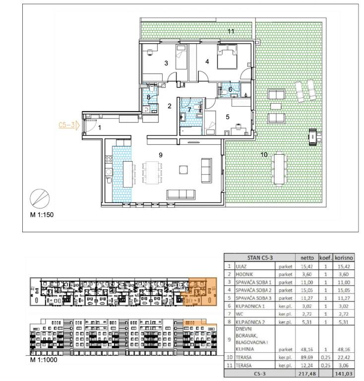 Četverosoban stan površine 141,03 m2 smješten na 5. katu.Stan C5-3 sastoji se od ulaza, 3 spavaće sobe, 2 kupaonice, gostinjskog wc-a, dnevnog boravka, kuhinje s blagovaonicom te 2 terase.Velika Gorica, projekt stambene novogradnje namijenjen stalnom stanovanju, koji obuhvaća 91 stambenu jedinicu. U sklopu zgrade osigurano je ukupno 182 garažnih i parkirnih mjesta, od čega je 28 garažnih mjesta smješteno u prizemlju, 97 garažnih i parkirnih mjesta u podzemnoj etaži te dodatnih 57 parkirnih mjesta na razini terena.Uz kupnju stana obavezna je kupnja garažnog mjesta na -1 etaži po cijeni od 25.000,00 EUR ili garažnog mjesta na 0 etaži po cijeni od 30.000,00 EUR zajedno s parkirnim garažnim mjestom po cijeni od 18.000,00 EUR ili vanjskim parkirnim mjestom po cijeni od 10.000,00 EUR. Dakle, garažno mjesto na -1 etaži ili garažno mjesto na 0 etaži + garažno parkirno mjesto ili vanjsko parkirno mjesto.Građevina je projektirana kao armiranobetonska konstrukcija, međusobno povezana zidovima i gredama, s punim armiranobetonskim stropnim pločama i ravnim krovom. Vertikalni konstruktivni sustav čine armiranobetonski zidovi debljine 20 cm izvedeni kroz sve etaže, dok horizontalni sustav čine armiranobetonske ploče debljine 20 cm.Pročelje je predviđeno s toplinskom izolacijom debljine 15 cm u ETICS sustavu, izvedenom od EPS-a, a u zonama požarnih prekida, u kontaktu sa stubištem i na podgledu prizemlja od mineralne vune iste debljine. Završna obrada izvodi se armiranom mrežicom, gletanjem i završnim slojem u boji i teksturi prema projektu. Vanjska stolarija predviđena je kao PVC, u tonu definiranom projektom.Krov je projektiran kao ravni neprohodni krov, a svi slojevi izvedeni su u skladu s projektom fizike zgrade. Unutarnji pregradni zidovi izvode se kao gipskartonski, debljine 10 do 20 cm, ovisno o namjeni prostora, uz primjenu potrebne zvučne izolacije gdje je to predviđeno. Zidne površine su završno obrađene soboslikarskim radovima u boji prema projektu.Podovi u stanovima izvode se kao plivajući sustav s toplinskom izolacijom od polistirena i cementnim estrihom. Završne podne obloge predviđene su prema namjeni prostora: keramika u sanitarijama, kuhinjama i na vanjskim površinama, a troslojni hrastov parket u dnevnim boravcima, blagovaonicama, ulaznim prostorima i spavaćim sobama. U ponudi su tri varijante keramičkih pločica.Grijanje je riješeno plinskim etažnim podnim sustavom. Stanovi su opremljeni klima uređajima marke Bosch, PVC stolarijom s električnim roletama, troslojnim hrastovim parketom te sobnim vratima proizvođača RV Križevci. Ulazna vrata u stanove su protuprovalna, proizvođača Kolnoa sa sustavom zaključavanja Multilock.Useljenje 05/27Za sva pitanja Vam stojimo na raspolaganju.... Više na eurovilla.hr, ID: 727347