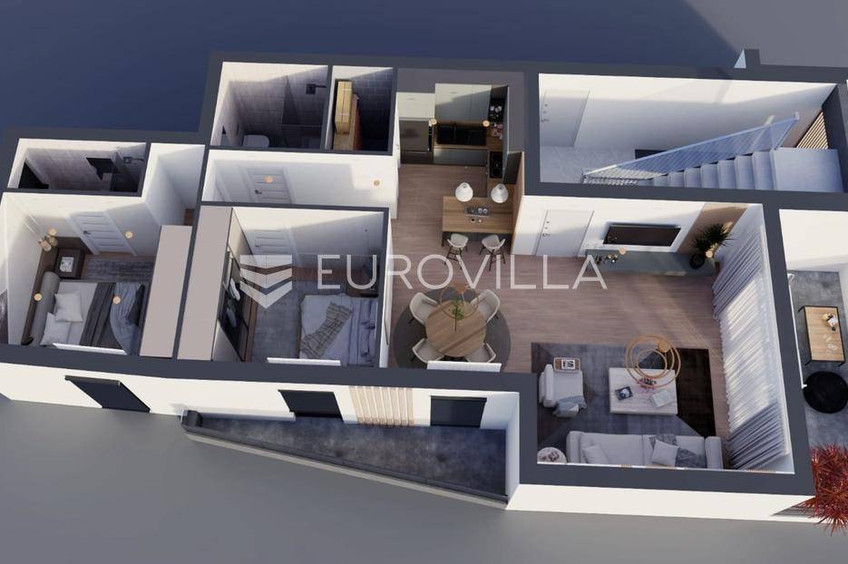Komforan, dvosoban stan na drugom katu, ukupne korisne površine 90,5 m2.Sastoji se od dvije spavaće sobe od kojih je jedna s vlastitom kupaonicom, kuhinje, blagovaonicom i dnevnog boravka otvorenog tipa, glavne kupaonice, hodnika i ostave te loggie ispred dnevnog boravka i balkona.Zatvorena stambena korisna površina stana iznosi 71,7 m2, dok je loggia površine 12,6 m2, a balkon 6,2 m2.Uz kupnju stana obvezna je kupnja dva garažna parkirna mjesta i ostave (6 m2) u podrumu po cijeni od 50.000 EUR.Orijentacija je jug-zapad što omogućava dosta svjetla i obilje sunca, te dodatno daje na komforu življenja u nekretnini.Visoko kvalitetna izrada i korištena oprema od čega izdvajamo Inverter klima uređaj u dnevnom boravku i spavaćim sobama, podno grijanje u kupaonici te antracit PVC prozore s podizno kliznom stijenkom.Nekretnina će biti izvedena u rangu A energetskog certifikata sukladno standardima (energetska učinkovitost koja zadovoljava visoke standarde).Investitor projekta izgradnje s tradicijom i iskustvom 40 godina u građenju.Planirani završetak radova kraj 12./2025. godine.Za više informacija stojimo Vam na raspolaganju.... Više na eurovilla.hr, ID: 807616