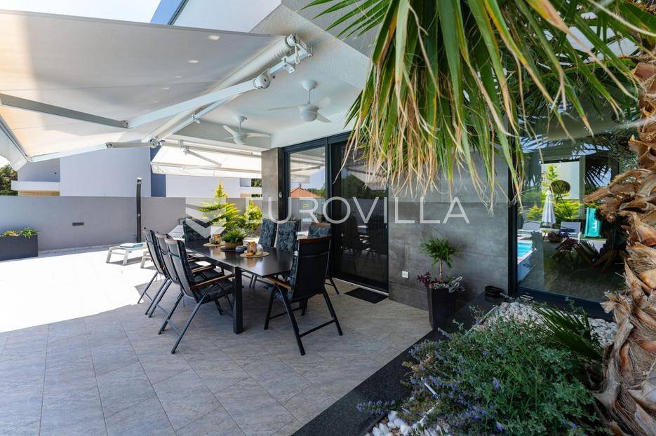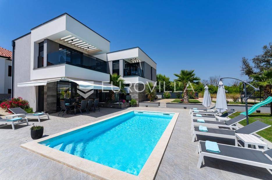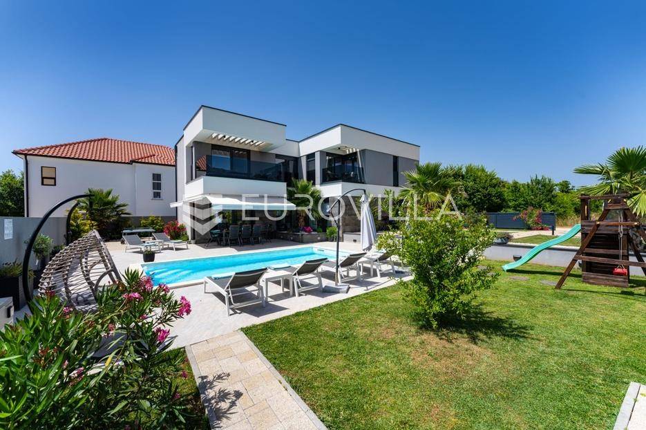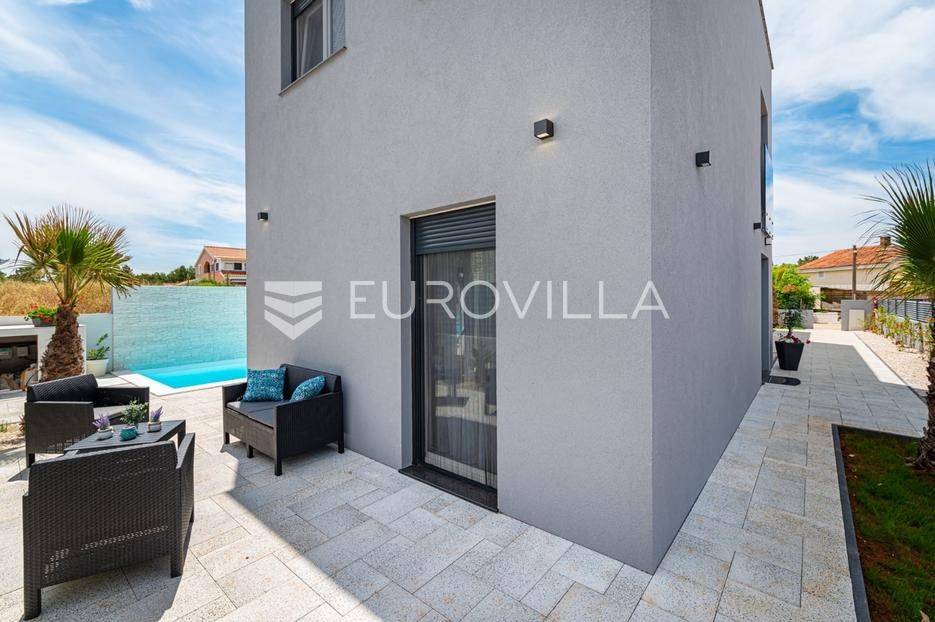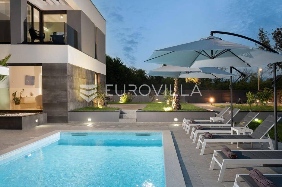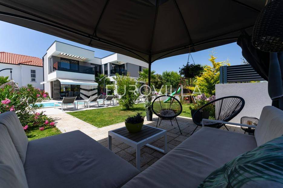Zadar, Zaton, kuća s bazenom nalazi se na površini zemljišta od 730 m2.Prizemlje kuće sastoji se od ulaznog prostora, gostinjskog wc-a, spremišta, spavaće sobe i pripadajuće kupaonice, kuhinje, blagovaonice i dnevnog boravka, površina prizemlja iznosi 98,19 m2.Gornja etaža sastoji se od hodnika, tri spavaće sobe s pripadajućim kupaonicama i nenatkrivenim terasama.U prekrasno uređenom vrtu s automatskim navodnjavanjem okoliša, nalazi se i grijani bazen te sunčalište, kao i prostor za blagovanje.Kuća je kompletno i moderno uređena i kao takva se prodaje.Idealna je za obiteljski život, ali i kao investicija u turizmu budući da već ima uhodan posao.Udaljenost od mora iznosi 400 metara.Više informacija na upit.... Više na eurovilla.hr, ID: 869049