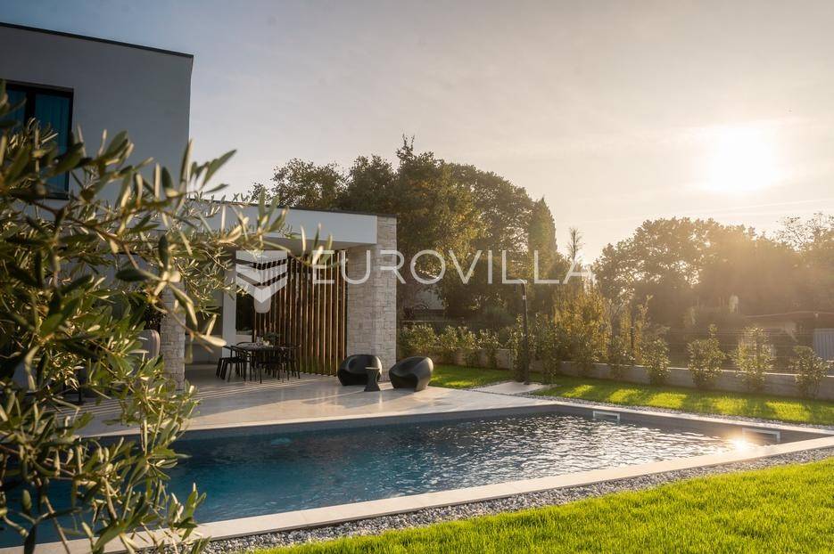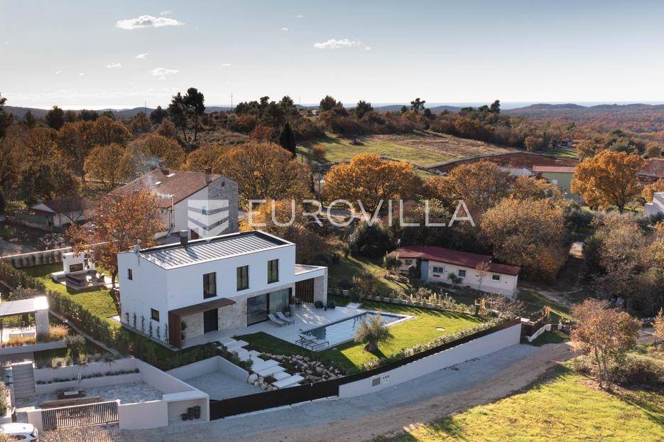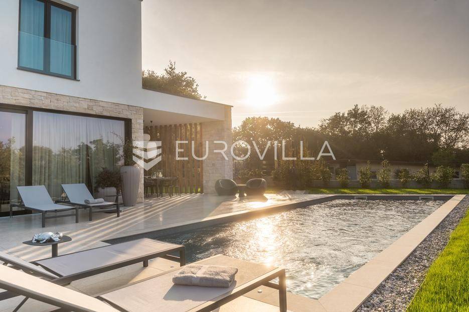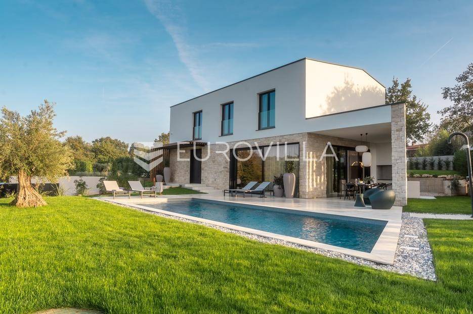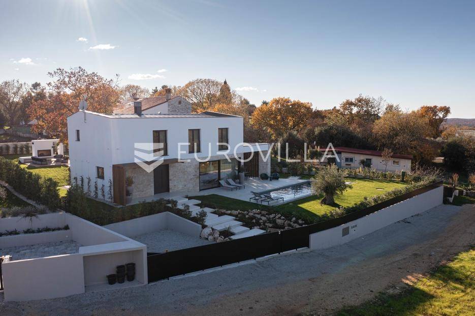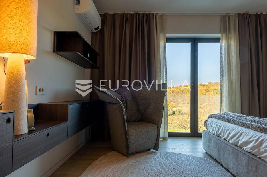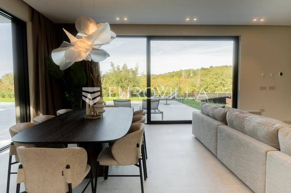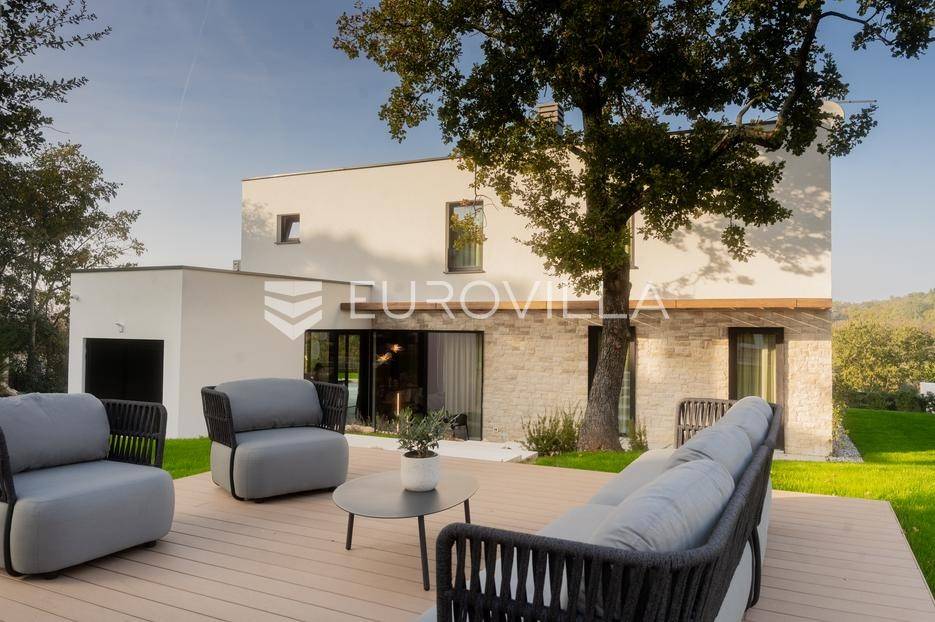 Istra - Marasi. Na prodaju je moderna, luksuzna i vrhunski izvedena samostojeća vila od 225 m², smještena na zemljištu od 1000 m².Tlocrt je funkcionalno osmišljen na dvije etaže.U prizemlju se nalaze ulazni hodnik, gospodarska prostorija, WC te prostor predviđen za saunu ili fitness. Prostrani dnevni boravak s kuhinjom i blagovaonicom izlazi na natkrivenu terasu.Na katu se nalaze tri udobne spavaće sobe, svaka s vlastitom kupaonicom, što osigurava maksimalnu privatnost i komfor.Vila je građena s naglaskom na kvalitetu i dugotrajnost - korišteni su vrhunski materijali i oprema. Posebno se ističu aluminijska stolarija, podno grijanje putem dizalice topline, klima uređaji u svim prostorijama, parket i keramika prvoklasne kvalitete te dizajnerski namještaj renomiranih talijanskih brandova. Visina stropa od 3 m dodatno naglašava osjećaj prostranosti. Kuhinja je potpuno opremljena aparatima Miele, Liebherr i Faber.Okućnica je jednako impresivna - uređena je mediteranskim biljem, s lounge zonom i kaminom, bazenom površine 37 m² s masažnim mlaznicama i rasvjetom, kao i terasom s roštiljem, sudoperom i radnom pločom. Poseban detalj su atraktivne dizajnerske betonske stepenice koje vode kroz dvorište.Lokacija vile pruža potpunu privatnost - nalazi se na rubu građevinske zone, s otvorenim pogledima na maslinike i voćnjake, dok se s gornje etaže proteže pogled sve do mora.Ova nekretnina je pravi izbor za one koji traže luksuz, udobnost i mir u istarskom okruženju.Preporuka agencije. Za sve upite stojimo na raspolaganju.... Više na eurovilla.hr, ID: 879063