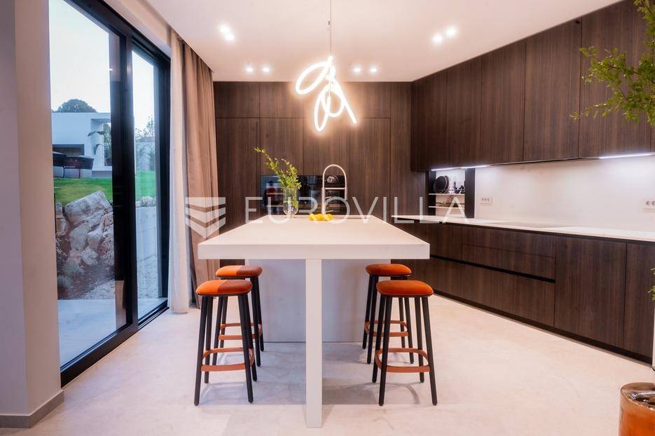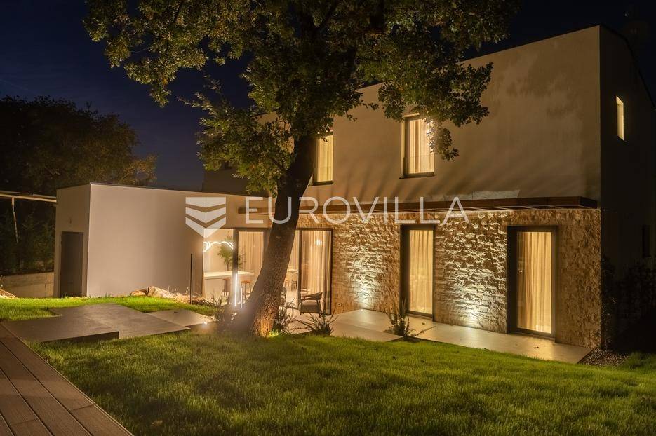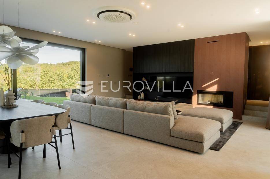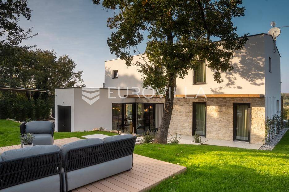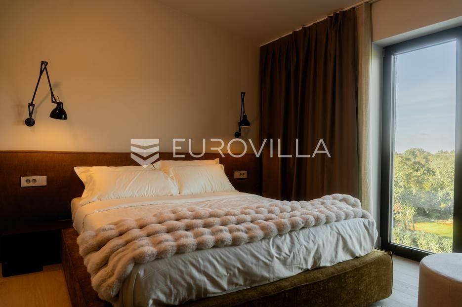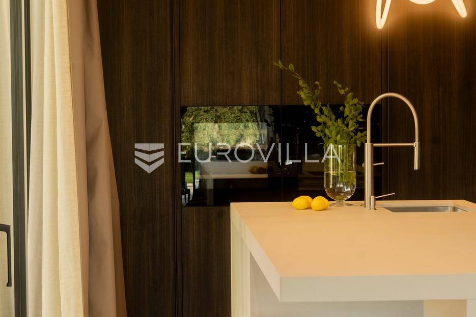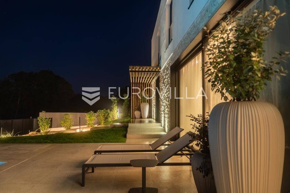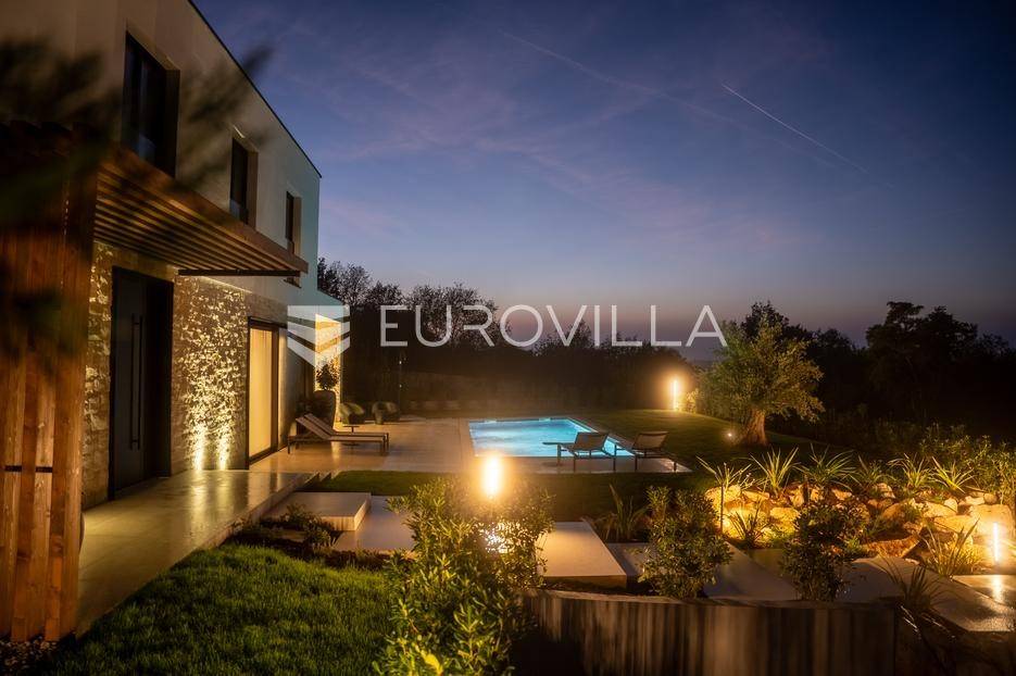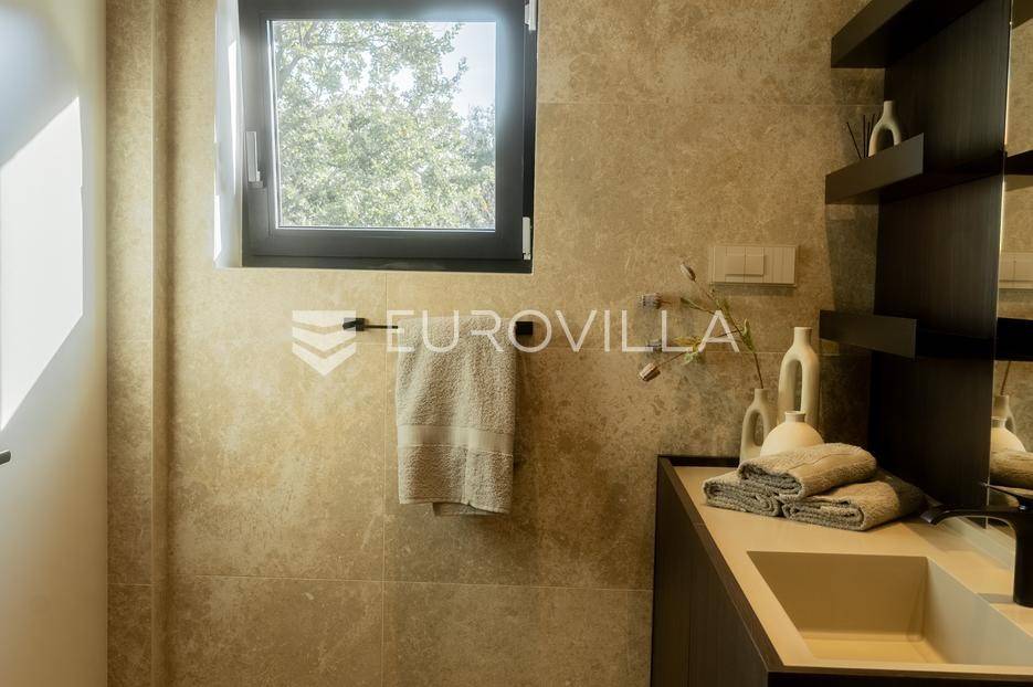 Istra - Marasi. Na prodaju je moderna, luksuzna i vrhunski izvedena samostojeća vila od 225 m², smještena na zemljištu od 1000 m².Tlocrt je funkcionalno osmišljen na dvije etaže.U prizemlju se nalaze ulazni hodnik, gospodarska prostorija, WC te prostor predviđen za saunu ili fitness. Prostrani dnevni boravak s kuhinjom i blagovaonicom izlazi na natkrivenu terasu.Na katu se nalaze tri udobne spavaće sobe, svaka s vlastitom kupaonicom, što osigurava maksimalnu privatnost i komfor.Vila je građena s naglaskom na kvalitetu i dugotrajnost - korišteni su vrhunski materijali i oprema. Posebno se ističu aluminijska stolarija, podno grijanje putem dizalice topline, klima uređaji u svim prostorijama, parket i keramika prvoklasne kvalitete te dizajnerski namještaj renomiranih talijanskih brandova. Visina stropa od 3 m dodatno naglašava osjećaj prostranosti. Kuhinja je potpuno opremljena aparatima Miele, Liebherr i Faber.Okućnica je jednako impresivna - uređena je mediteranskim biljem, s lounge zonom i kaminom, bazenom površine 37 m² s masažnim mlaznicama i rasvjetom, kao i terasom s roštiljem, sudoperom i radnom pločom. Poseban detalj su atraktivne dizajnerske betonske stepenice koje vode kroz dvorište.Lokacija vile pruža potpunu privatnost - nalazi se na rubu građevinske zone, s otvorenim pogledima na maslinike i voćnjake, dok se s gornje etaže proteže pogled sve do mora.Ova nekretnina je pravi izbor za one koji traže luksuz, udobnost i mir u istarskom okruženju.Preporuka agencije. Za sve upite stojimo na raspolaganju.... Više na eurovilla.hr, ID: 879063