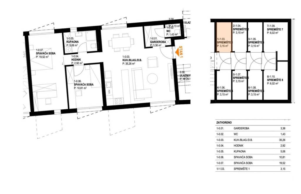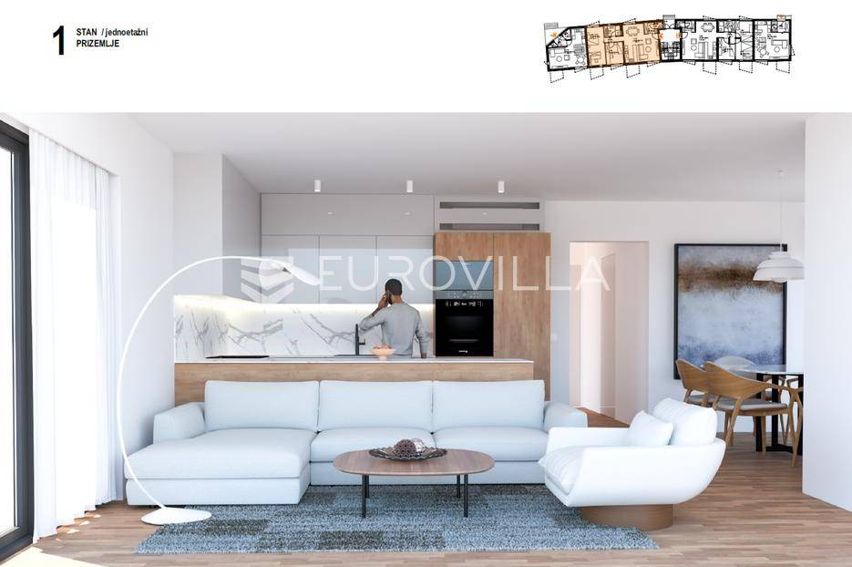 Ludbreg, Centar, moderan trosoban stan, ukupno netto površine 79,96 m2.Stan površine 78,38 m² smješten u prizemlju, sastoji od garderobe s WC-om, kuhinje, blagovaonice i dnevnog boravka u open space konceptu, hodnika, dvije spavaće sobe, kupaonice i spremišta u podrumu 3,15 m².Projekt novogradnje u centru Ludbrega sastoji se od 8 modernih stanova. Stanovi se prostiru na tri etaže (podrum, prizemlje, 2 kata), a sama građevina pruža dvostranu orijentaciju stanova (sjeveroistok i jugozapad), što osigurava optimalnu količinu prirodne svjetlosti. Useljenje planirano za proljeće 2027. godine.Zgrada je projektirana s armiranobetonskim sustavom debljine 20 cm i vrhunskom toplinskom izolacijom od mineralne vune, koja jamči izuzetnu energetsku učinkovitost i udobnost prostora.Stanovi su opremljeni:dizalicama toplinevelikim staklenim stijenkama s troslojnim staklima punjenim argonomprotuprovalnim i protupožarnim ulaznim vratimazavršne podne obloge bit će izvedene od parketa i keramike, ovisno o namjeni prostorijeOvaj stan idealan je za obitelj koji traže moderan, energetski učinkovit stan u blizini svih sadržaja centra Ludbrega.Za više informacija i dogovor o razgledu, slobodno nas kontaktirajte!... Više na eurovilla.hr, ID: 906474