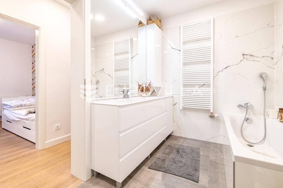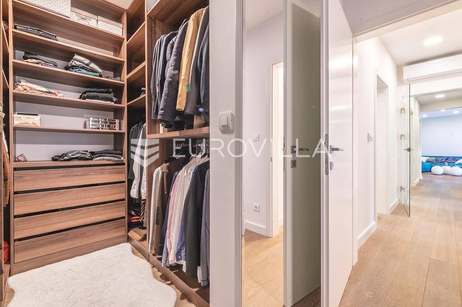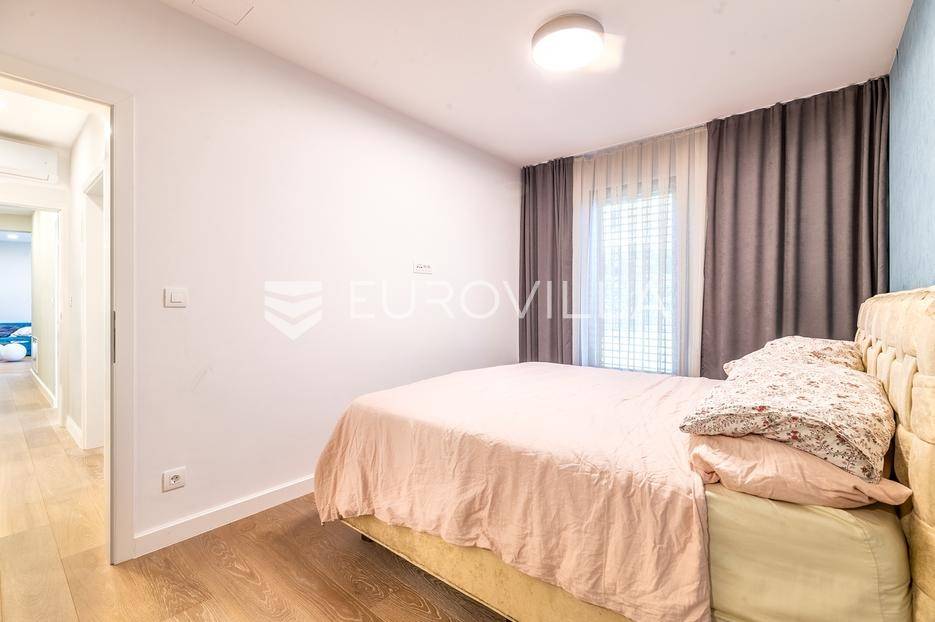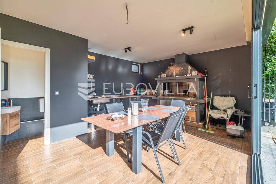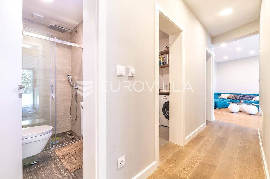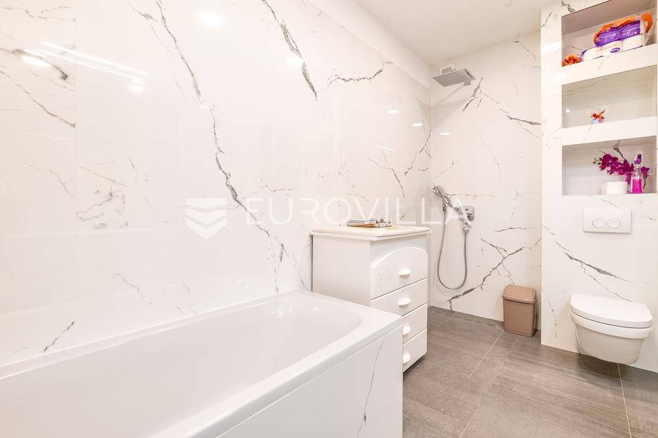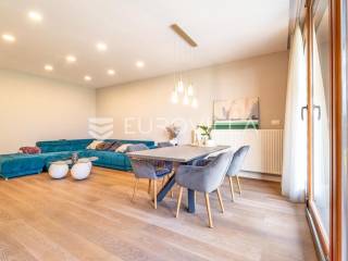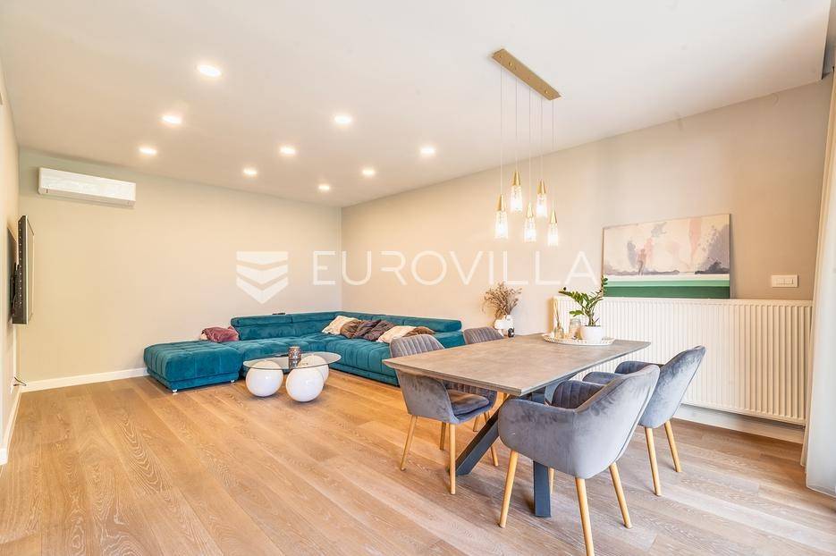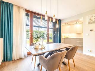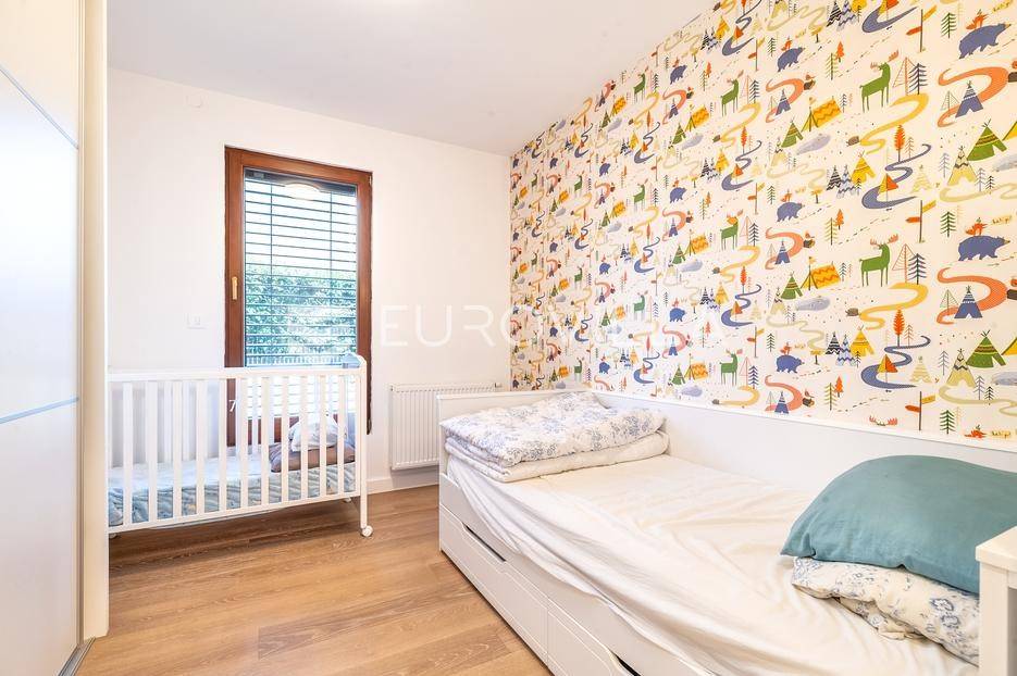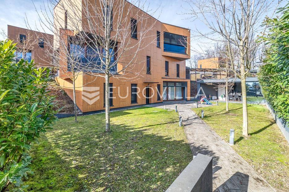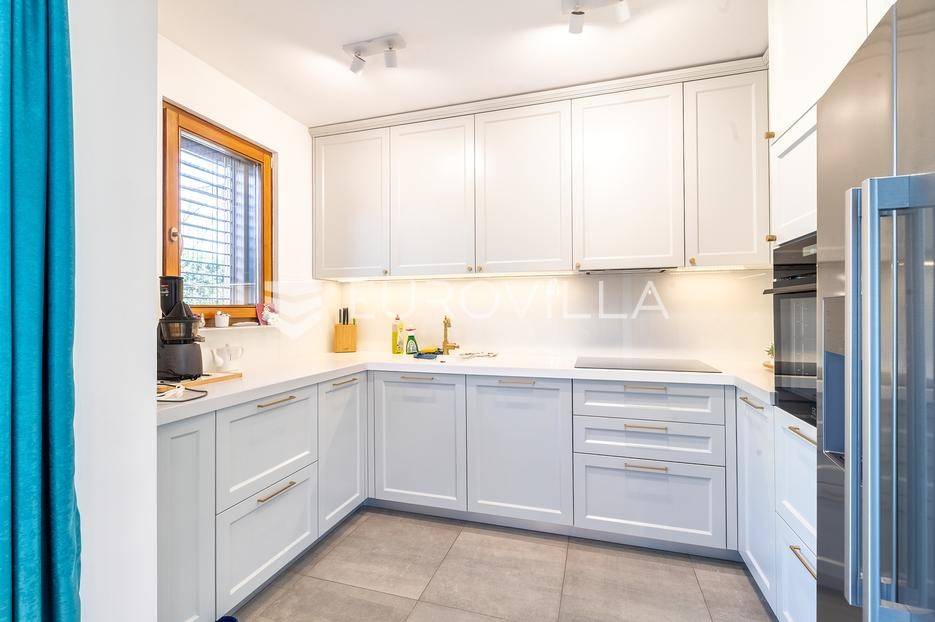 Zagreb, Maksimir, Gorice, luksuzan trosoban stan ukupne površine 150 m2, s velikim vrtom, garažom i dva vanjska parkirna mjesta. Nalazi se na prekrasnoj i izuzetno mirnoj lokaciji, uvučen od glavne ceste s pogledom na zelenilo. Okružen prekrasnim novoizgrađenim stambenim vilama. Zatvorene stambene površine 94 m2.Sastoji se od ulaznog hodnika, dnevnog boravka s kuhinjom i blagovaonicom koji izlazi na vrtnu terasu i vrt, spavaće sobe s walk-in garderobom, dječje spavaće sobe, kupaonice s kadom i tušem, manje kupaonice s tušem, spremišta i vešeraja.Pripada mu vrt površine 245,2 m2 (24,5 m2) koji ima vlastito navodnjavanje i modernu klimatiziranu vrtnu kućicu površine 30 m2 s kliznim staklenim stijenama, kaminom, kuhinjom i toaletom, nenatkrivene terase površine 33,34 m2 (8,33 m2), dva nenatkrivena vanjska parkirna mjesta površine ukupno 41 m2 (10,06 m2), smetlarnik i garaža površine 15,12 m2 (7,6 m2).Fasada je ventilirajuća s 12 cm kamene vune, te specijalnim pločama pričvršćenim pop-nitnama za potkonstrukciju, vrlo kvalitetna gradnja, etažno plinsko grijanje, klimatiziran, energetski certifikat A, orijentacija istok-jug, smart home.Odlična prometna povezanost, samo nekoliko min do strogog centra grada, a u neposrednoj blizini nalazi se internacionalna francusko njemačka škola na Fratrovcu.Za sve ostale upite nas slobodno kontaktirajte.... Više na eurovilla.hr, ID: 934573