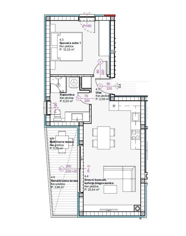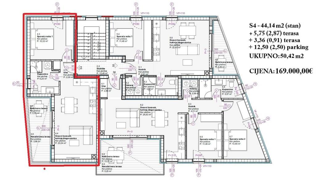 Apartment S4 – located on the second floor, has 50.42 m2 of net usable area, and consists of: entrance, bedroom, bathroom, kitchen, dining room and living room, covered terrace and uncovered terrace. 1 parking space in front of the building. Price: 169,000 €