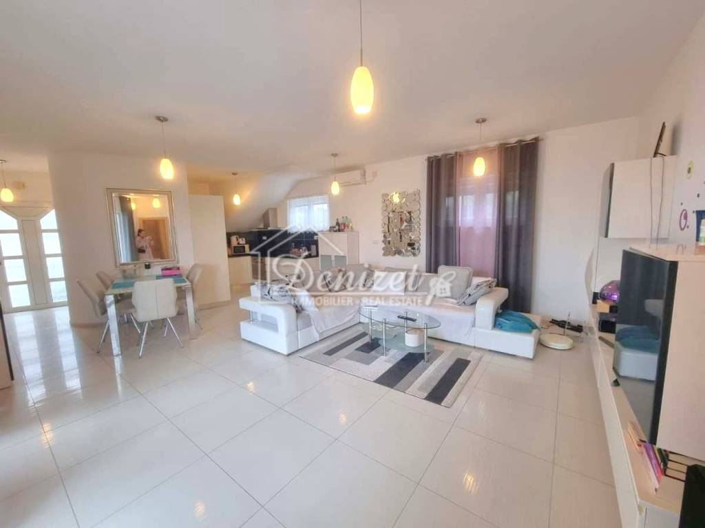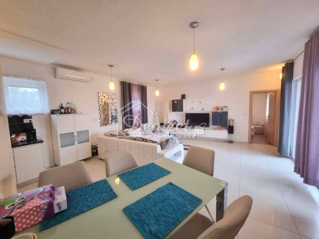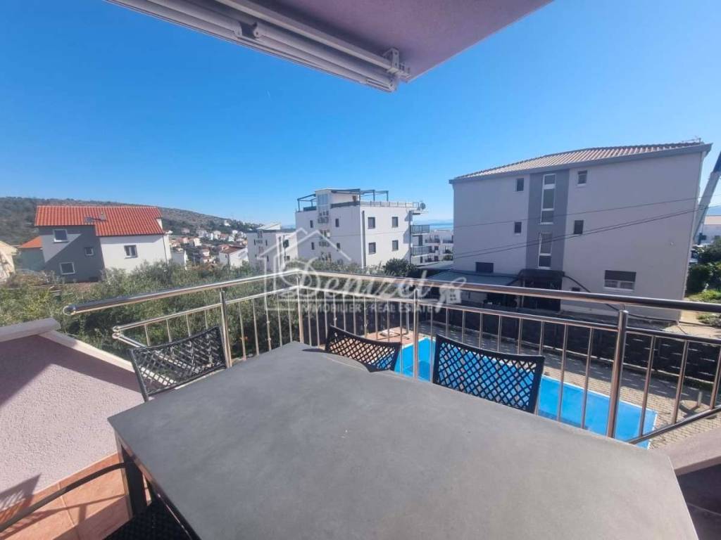 The apartment consists of a living room, kitchen, dining area, hallway, three bedrooms, and two bathrooms, with a total living area of 81.20 m². The living room opens onto a covered terrace of 9.96 m² with a partial sea view. It also includes one outdoor parking space. In front of the building, there is a swimming pool, sunbathing area, outdoor barbecue, and dining space available for all residents. The apartment is fully furnished and equipped, ready for immediate move-in. Its spaciousness, airiness, warmth, and comfort make it an ideal choice for a family or as an investment property on the Adriatic coast. It is located on the attractive southern side of the island of Čiovo, just 350 m from the sea and the beach. The center of the settlement and all necessary amenities are nearby, while the town of Trogir is only 4 km away, and Split Airport is 9 km away.