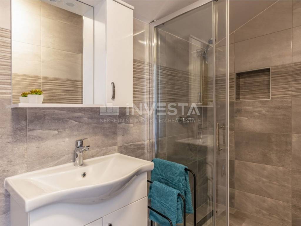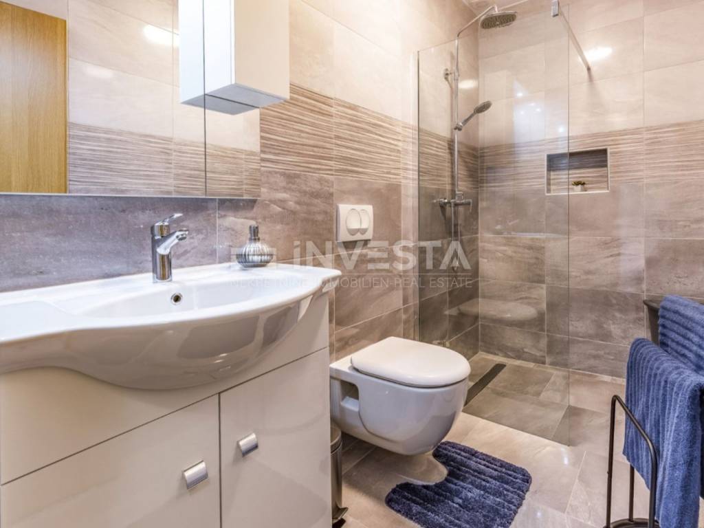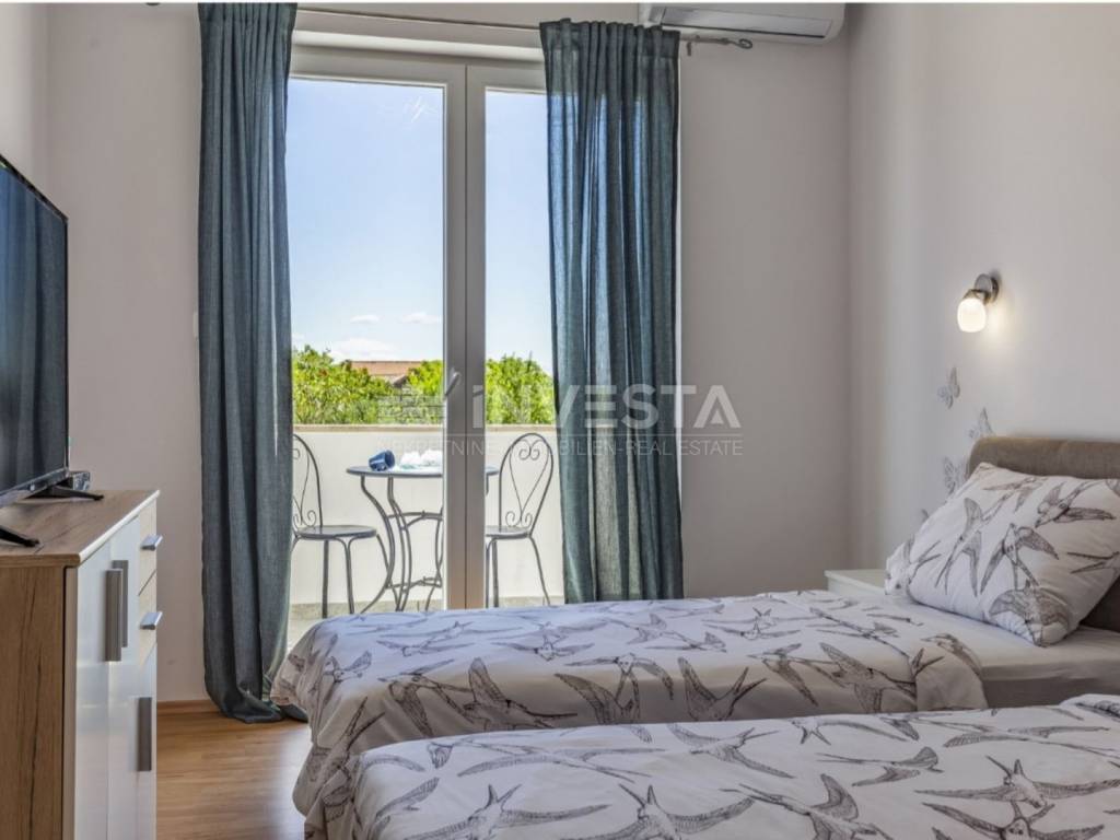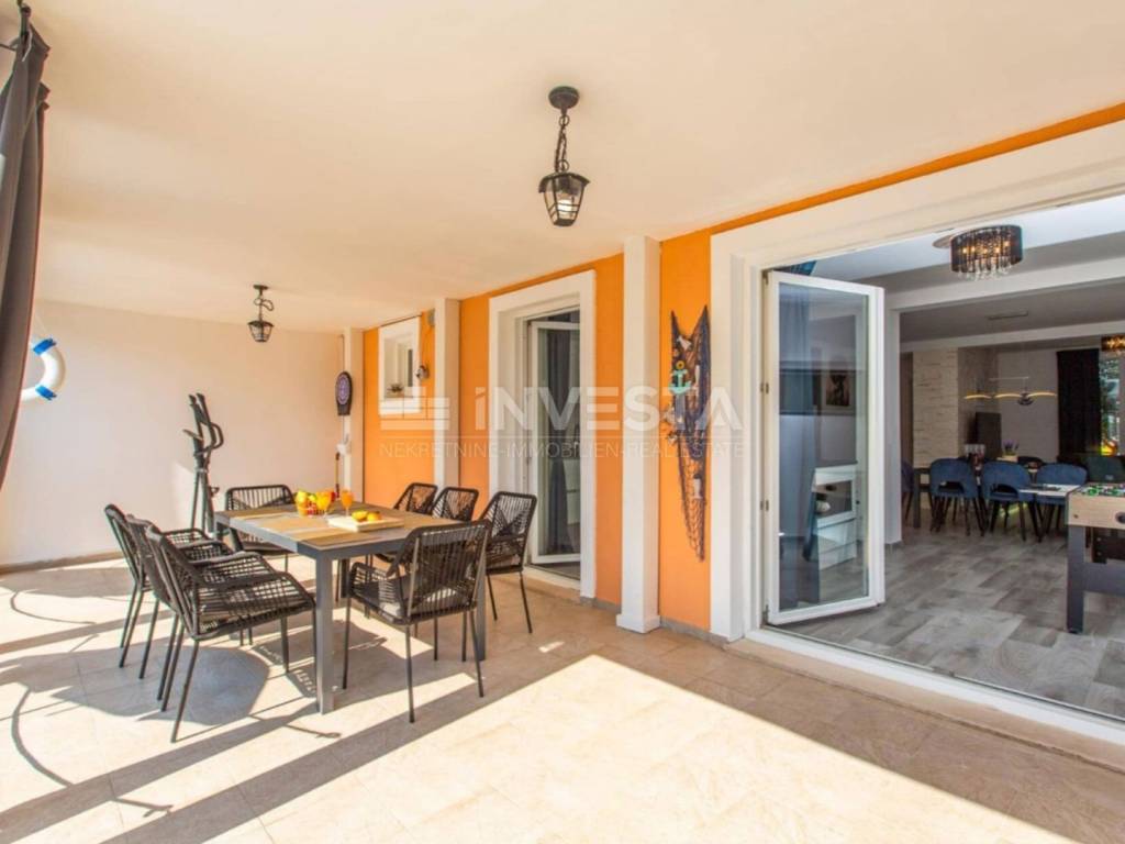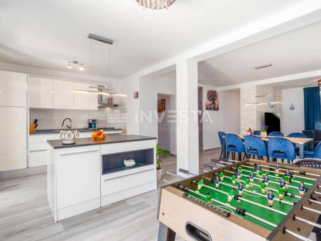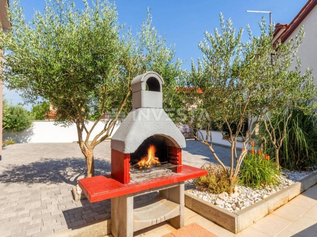 On the 369 m² plot, there is a 32 m² swimming pool, sunbathing area, outdoor shower, and a covered area for socializing and barbecues. In front of the house, there are four parking spaces, plus an additional space in the 20 m² garage.
