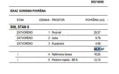 Basic characteristics: Apartment area: 44.31 m (maximum use of the floor plan) Terrace: Spacious covered terrace of 16.62 m ideal for enjoying summer evenings. Parking: Private parking space (12.15 m) included in the price. Location: Quiet street, only 300 meters of easy walk to the crystal clear sea.