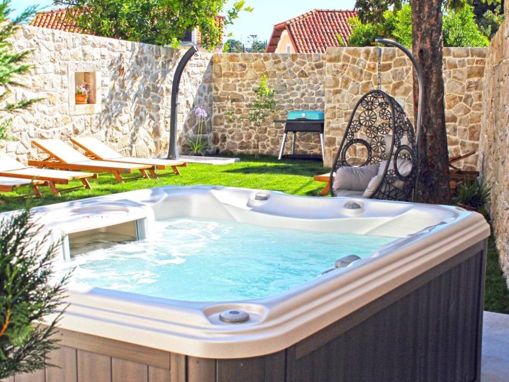 Outdoor living is equally impressive as the interior. The garden features a jacuzzi, sun loungers, a covered terrace, and an outdoor shower. The outdoor kitchen with a gas grill allows for a full Mediterranean lifestyle outdoors.