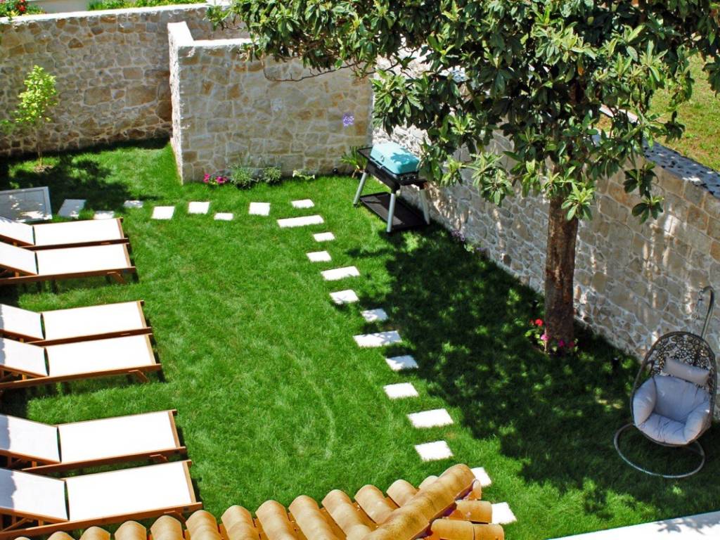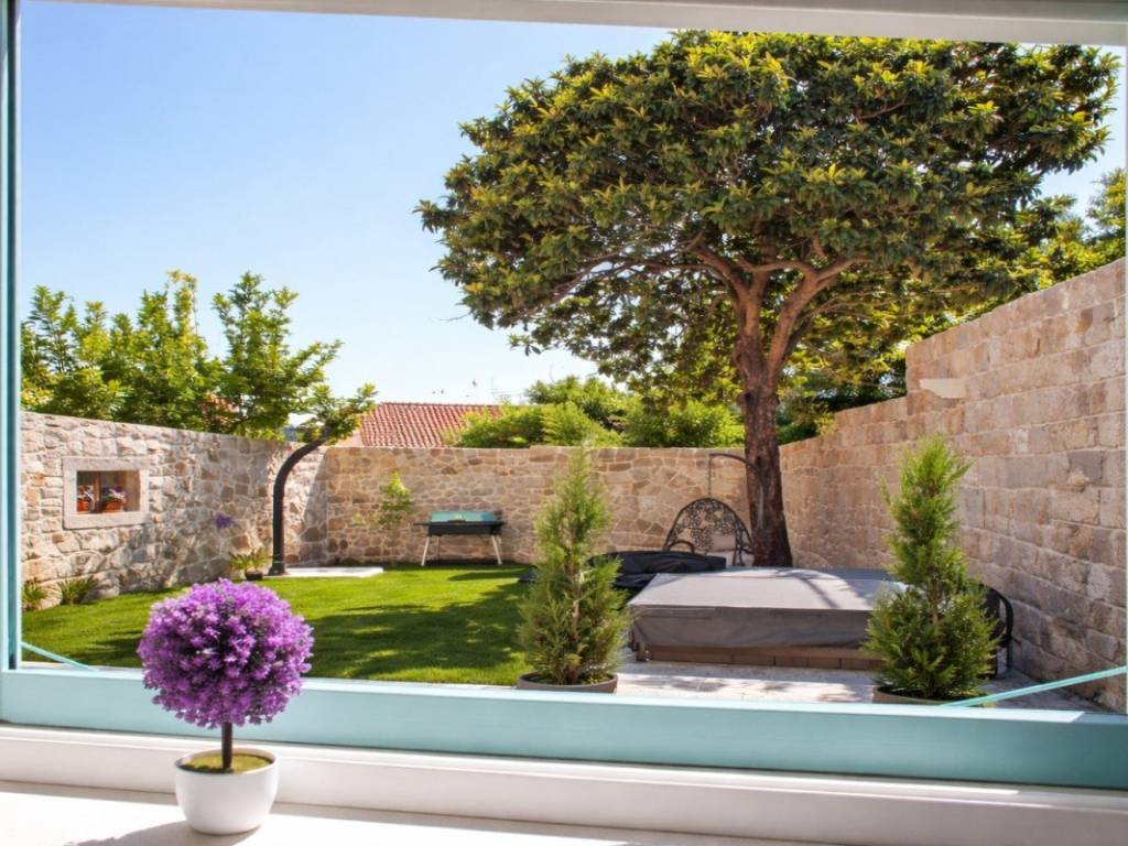 At first sight, it is clear that the villa embodies everything a typical Mediterranean home should have. The combination of white stone and warm wood dominates both the exterior and interior. Authentic wooden shutters, characteristic of the Mediterranean, further highlight its original charm. Although nestled among other stone houses in the heart of the town, the villa enjoys a remarkable level of privacy thanks to its high stone fence and carefully landscaped garden.
