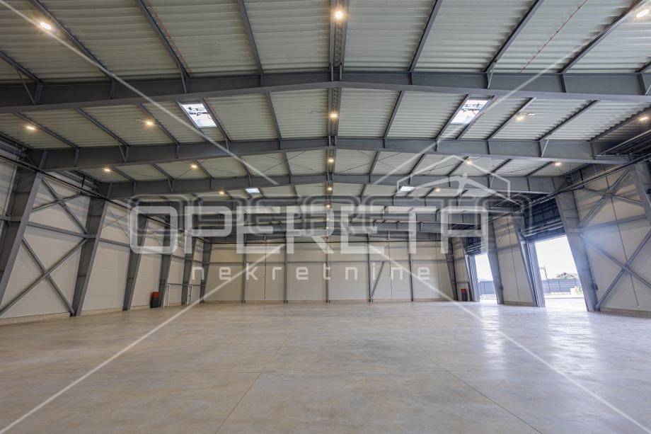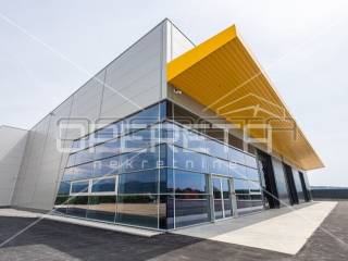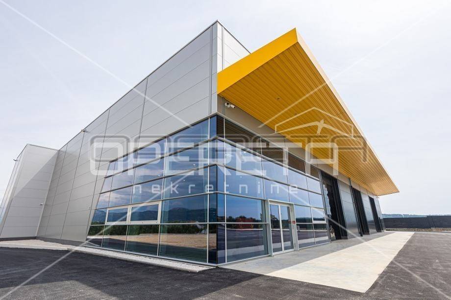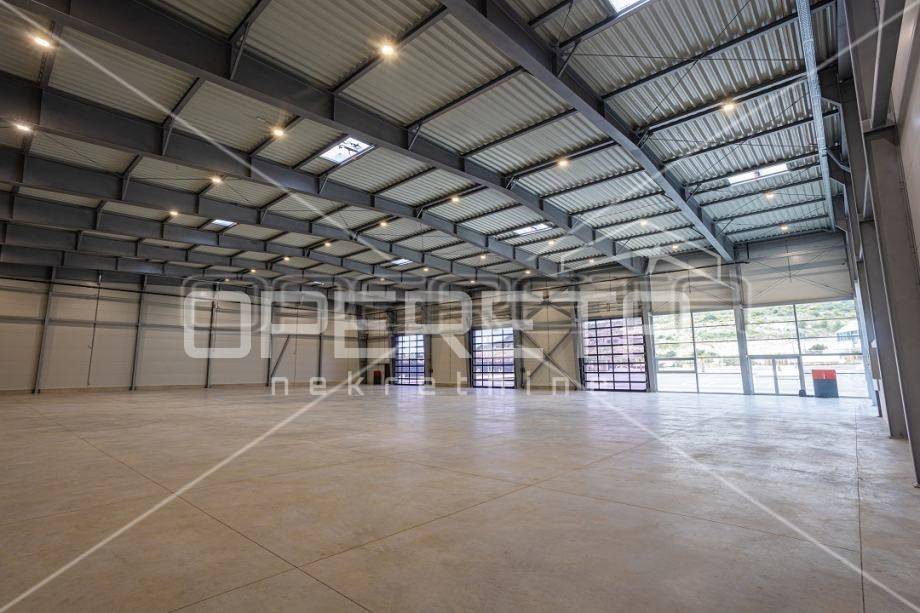 FOR RENT, NEWLY BUILT COMMERCIAL AND SALES WAREHOUSE, TROGIR, PLANO, 800 M2. A newly built commercial and sales warehouse is for rent near Split airport and in the immediate vicinity of Trogir. The property is well connected by road in all directions because it is located along the main roads. The area of the hall itself is 1600 m2, and it is located on a plot of 7100 m2. There is also the possibility of renting only half of the hall in the amount of 800 m2. Parking for 50 cars is provided in the yard. The hall is equipped with a video surveillance system, sanitary facilities and industrial electricity. There are 3 large doors H: 526 cm, W: 470 cm. There is also the possibility of arranging office space in the hall itself in accordance with the agreement with the owner. VAT is calculated on the stated price.