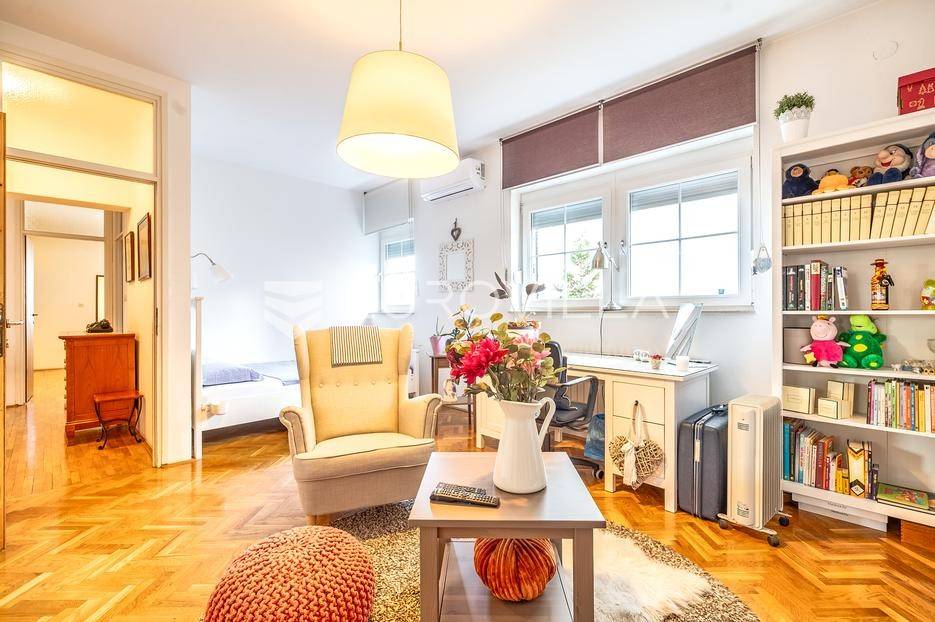 Pantovčak – peterosoban stan s vrtom, terasom, garažom i parking mjestom u jednoj od najljepših gradskih ulicaNa jednoj od najpoželjnijih rezidencijalnih lokacija u Zagrebu smješten je ovaj ugodan stan koja pruža spoj privatnosti, mira i blizine samog centra grada.Stan je pozicioniran u drugom redu od glavne ulice, što osigurava dodatnu tišinu i mir.Nekretnina se prostire na tri etaže i nudi funkcionalan raspored prostora prilagođen ugodnom obiteljskom životu.Ulazni dio stana s dvorišne strane sastoji se od dnevnog boravka s blagovaonicom i kuhinjom otvorenog tlocrta, ostave (špajze), radne sobe, vešeraja, kupaonice, gostinjskog WC-a te ugodne terase idealne za boravak na otvorenom.Unutarnje stepenice vode na kat gdje se nalazi privatni dio s tri spavaće sobe i kupaonicom, dok jedna od soba ima izlaz na balkon.U suterenu se nalazi garsonijera površine 18,84 m² koja može služiti kao gostinjska soba ili radni prostor. U nastavku se nalazi vrt površine oko 50 m² i pogled na zelenilo.Stan ima garažu i jedno vanjsko parkirno mjesto.Redovito je održavan, a prije pet godina izvršene su obnove koje uključuju zamjenu instalacija u kupaonici, novi parket u dnevnom boravku i blagovaonici te ugradnju novih prozora u cijeloj kući.Ova nekretnina predstavlja izvrsnu priliku za miran i kvalitetan obiteljski život u jednoj od najljepših zagrebačkih rezidencijalnih zona, a svega nekoliko minuta vožnje od Britanskog trga i svih sadržaja centra grada.Rok iseljenja: 45 dana.Ostale informacije na upit.... Više na eurovilla.hr, ID: 306353