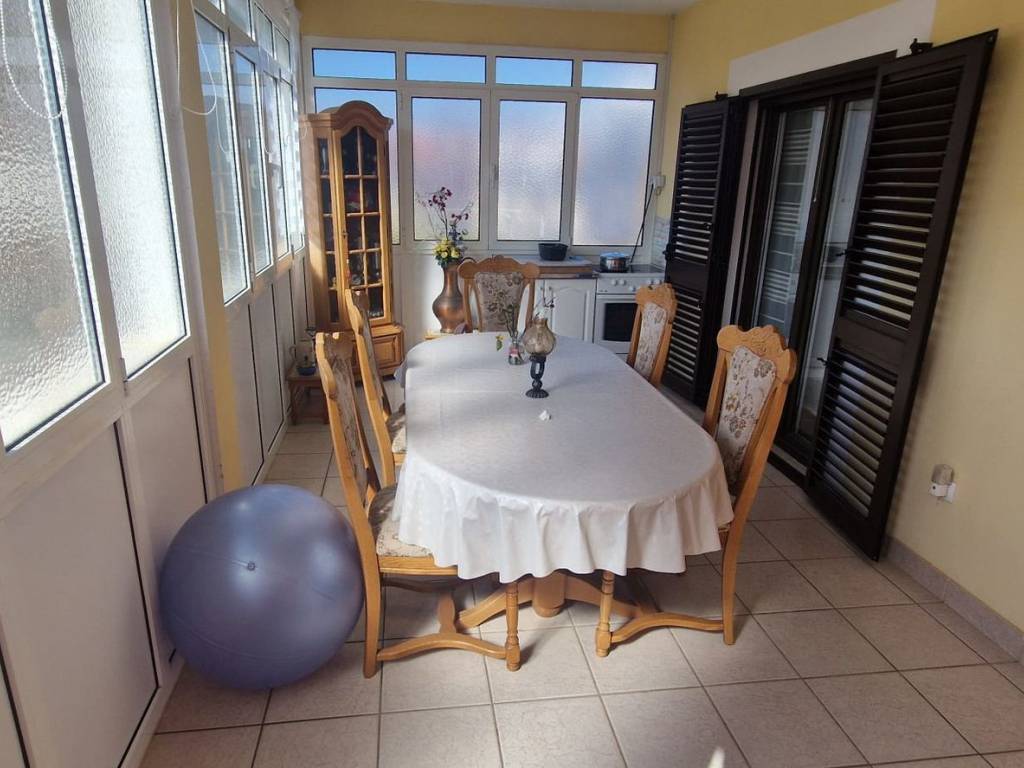 The ground floor features an apartment with a kitchen, dining room, living room, two bedrooms, a bathroom, and a large enclosed terrace.