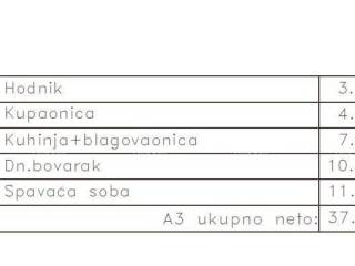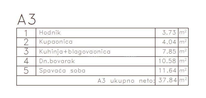 APARTMENT - A3 (ground floor, 1 bedroom) Hallway: 3.73 m2 Bathroom: 4.04 m2 Kitchen + dining area: 7.85 m2 Living room: 10.58 m2 Bedroom: 11.64 m2 Total net area: 37.84 m2 The property includes a parking space, included in the price.