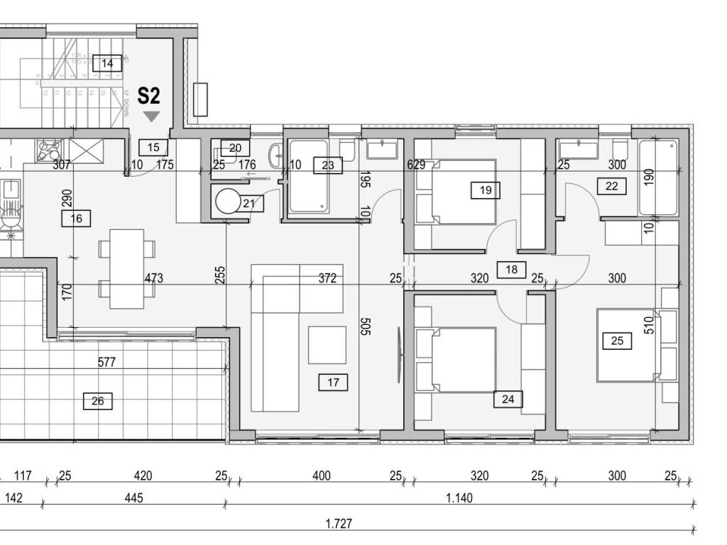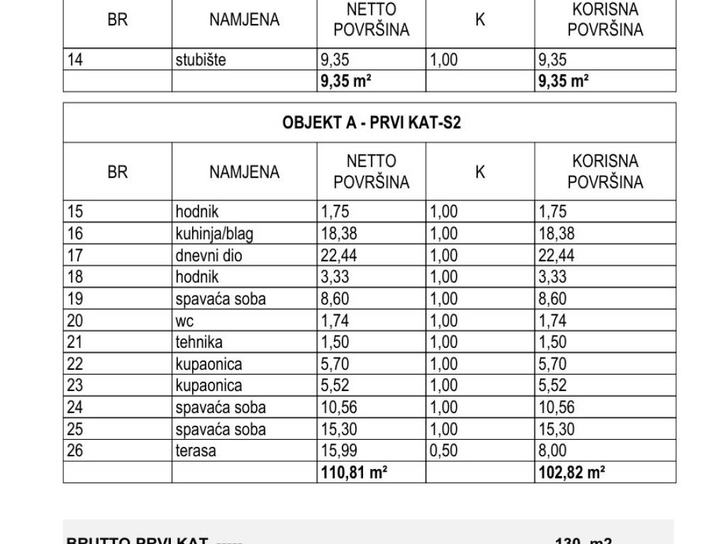 Stan na prvom katu, ukupne površine 101,78 m2, sastoji se od ulaznog prostora, hodnika, spremišta, tri spavaće sobe (8,60m2, 10,56m2 i 15,30m2), 2 kupaonice (5,70m2 i 5,52m2), odvojenog WC-a, kuhinje, blagovaonice i dnevnog boravka (40 m2) s izlazom na natkrivenu terasu površine 13,70 m2.