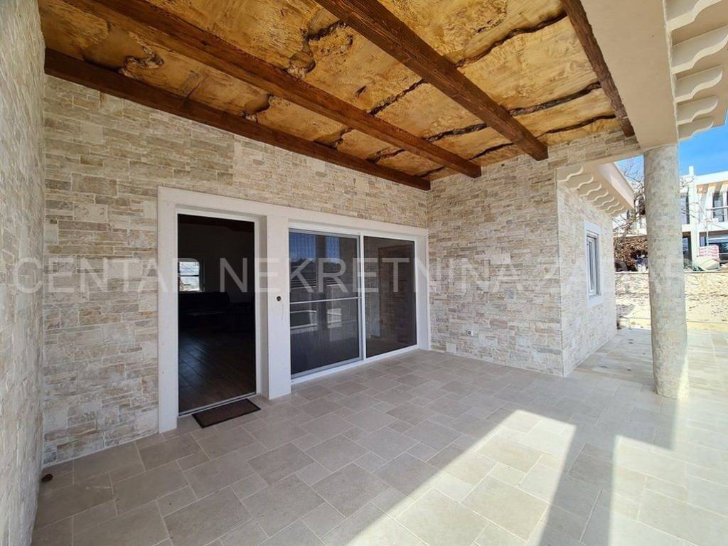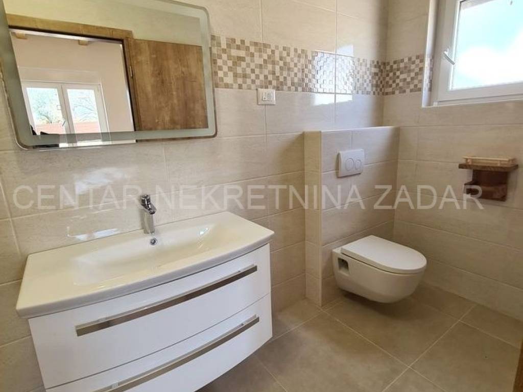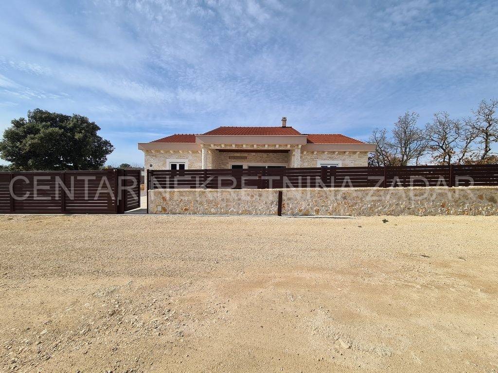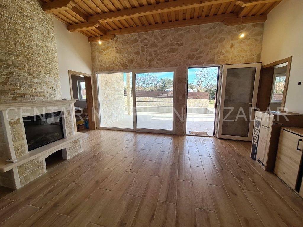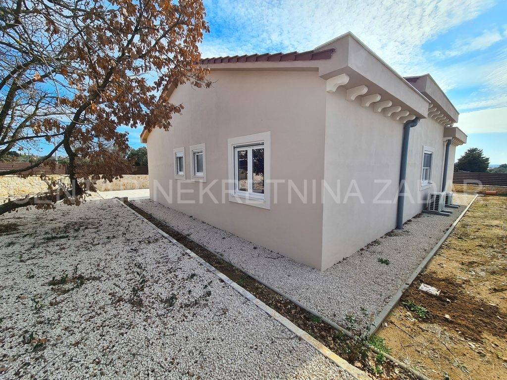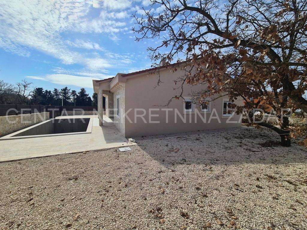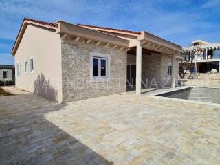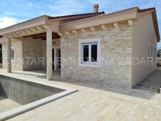A new house with a swimming pool is for sale in Vrsi, built on a plot of 507 m. The living area is 131 m. In the house there are a kitchen with a dining area and a living room, three bedrooms with bathrooms, an additional toilet and a laundry room. The living room is separated from the covered terrace by a large glass wall.
