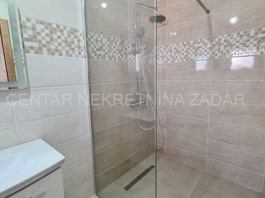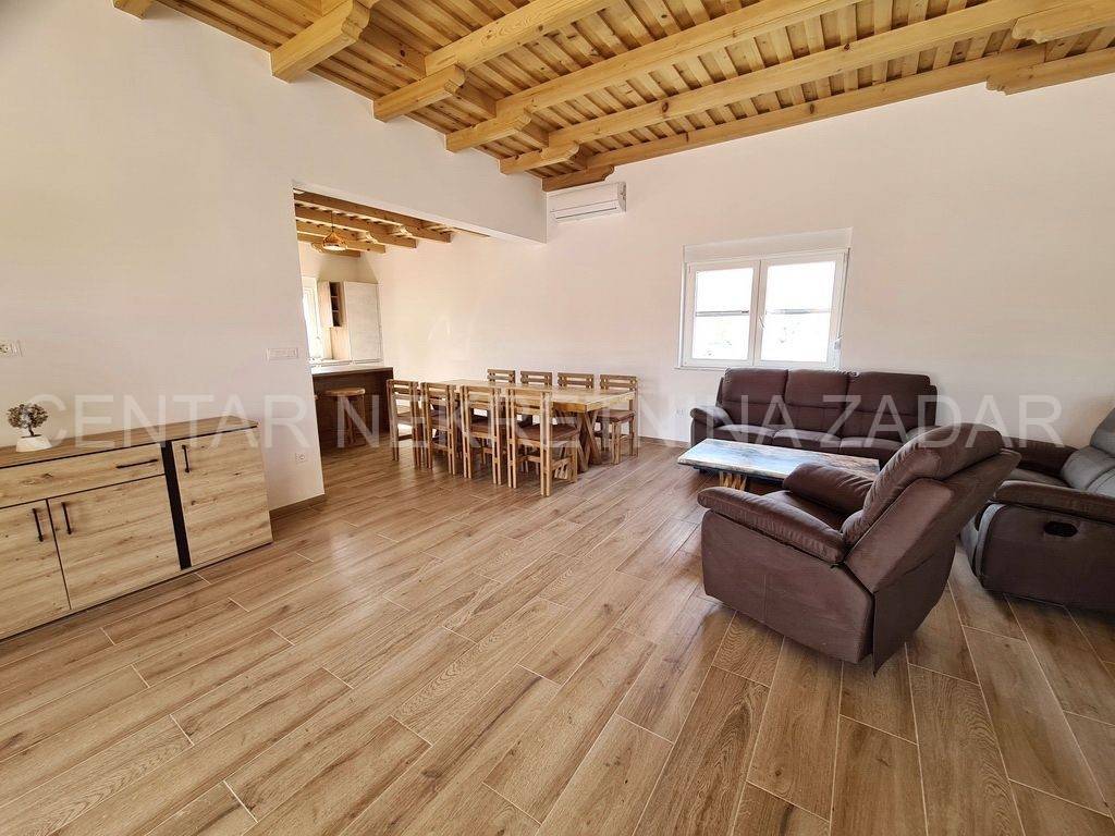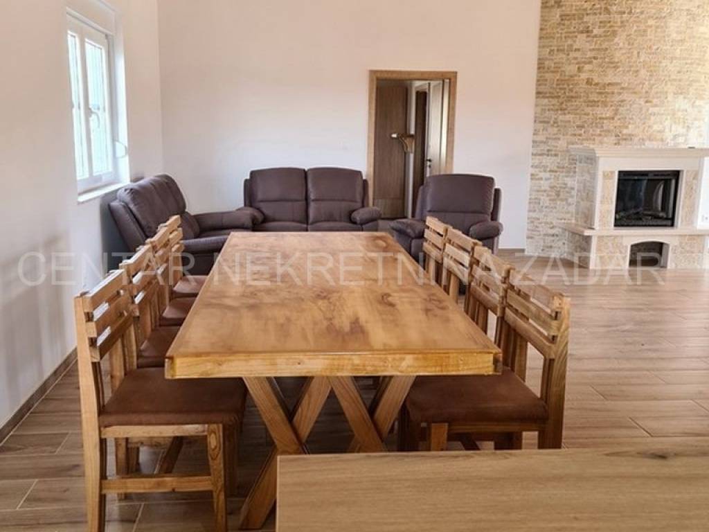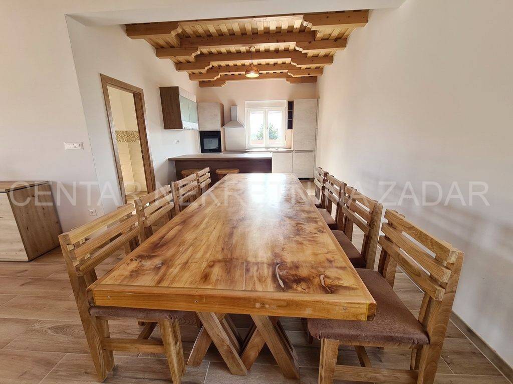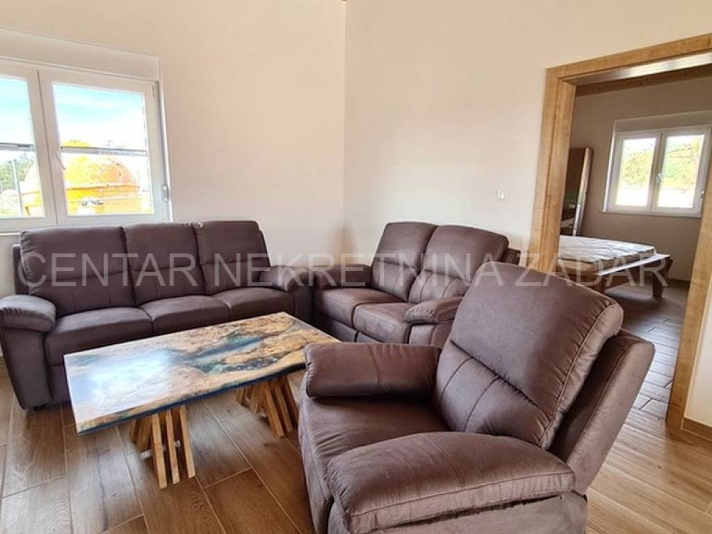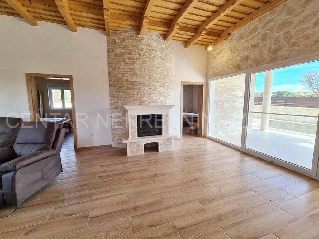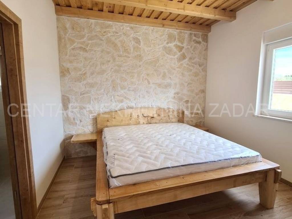 A new house with a swimming pool is for sale in Vrsi, built on a plot of 507 m. The living area is 131 m. In the house there are a kitchen with a dining area and a living room, three bedrooms with bathrooms, an additional toilet and a laundry room. The living room is separated from the covered terrace by a large glass wall.