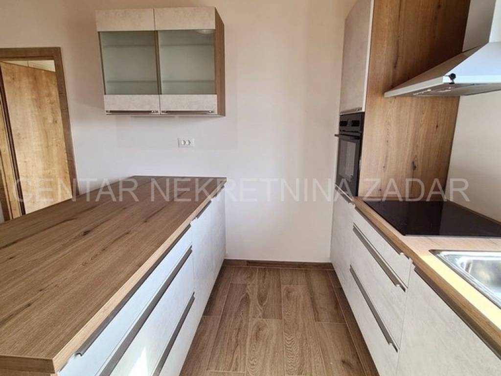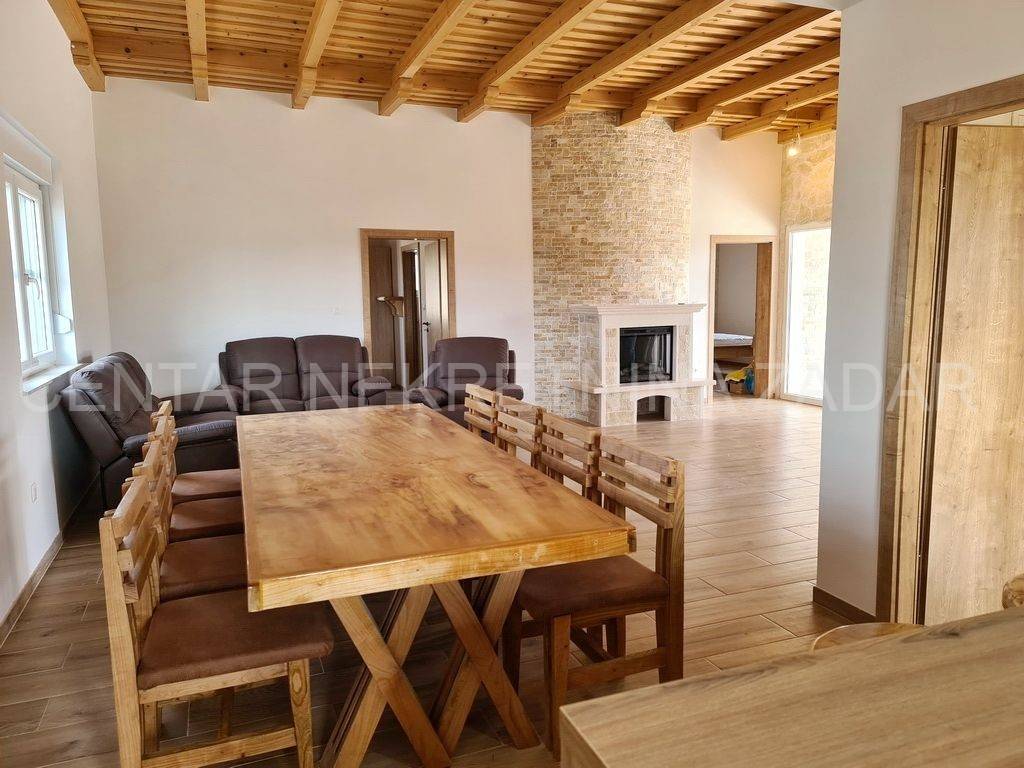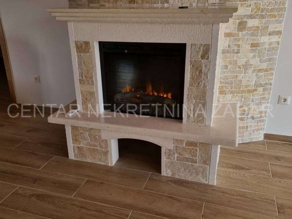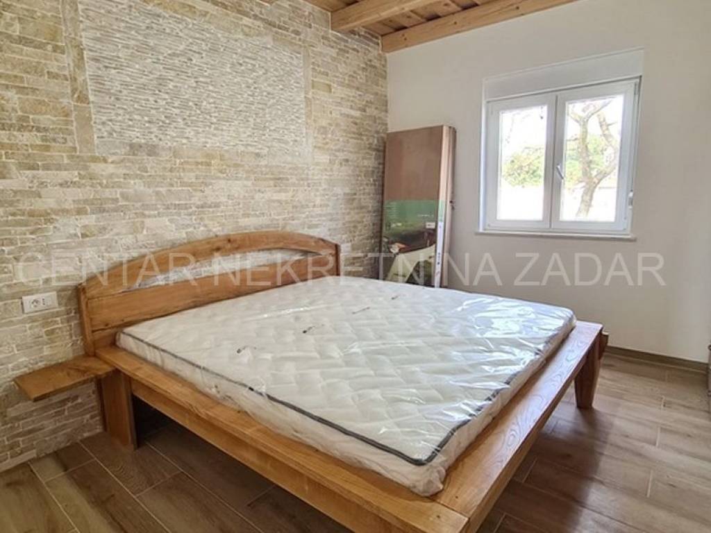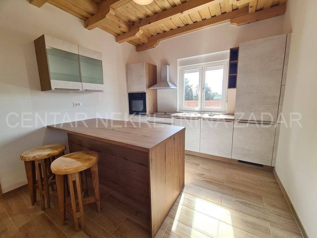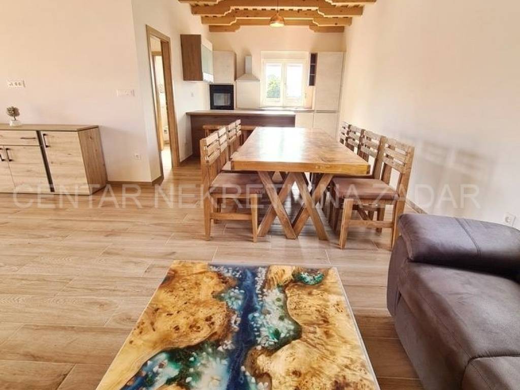 A new house with a swimming pool is for sale in Vrsi, built on a plot of 507 m. The living area is 131 m. In the house there are a kitchen with a dining area and a living room, three bedrooms with bathrooms, an additional toilet and a laundry room. The living room is separated from the covered terrace by a large glass wall.