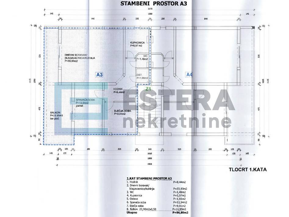 Apartman oznake A3 ima ukupnu stambenu površinu 86,89 m2, a odlikuje ga funkcionalan raspored prostorija i prostrani balkon idealan za opuštanje.