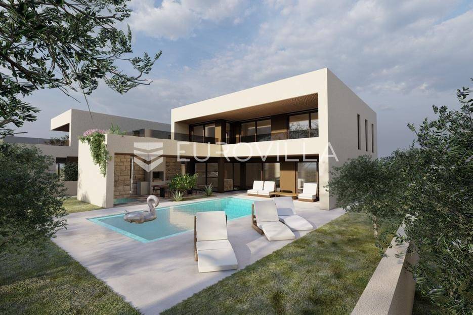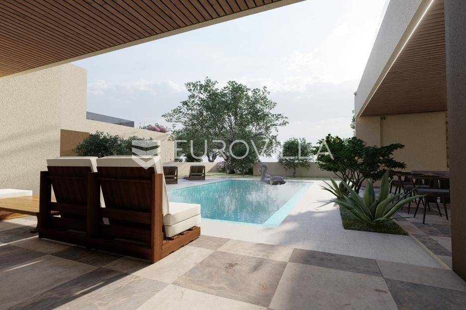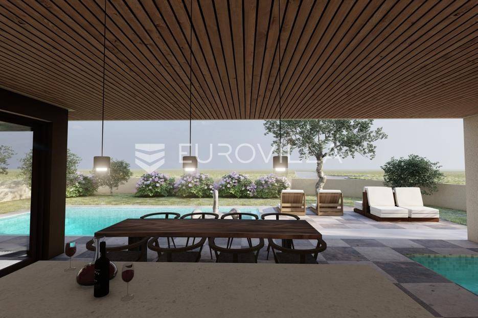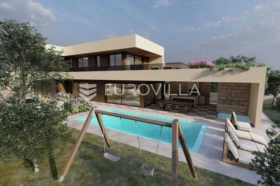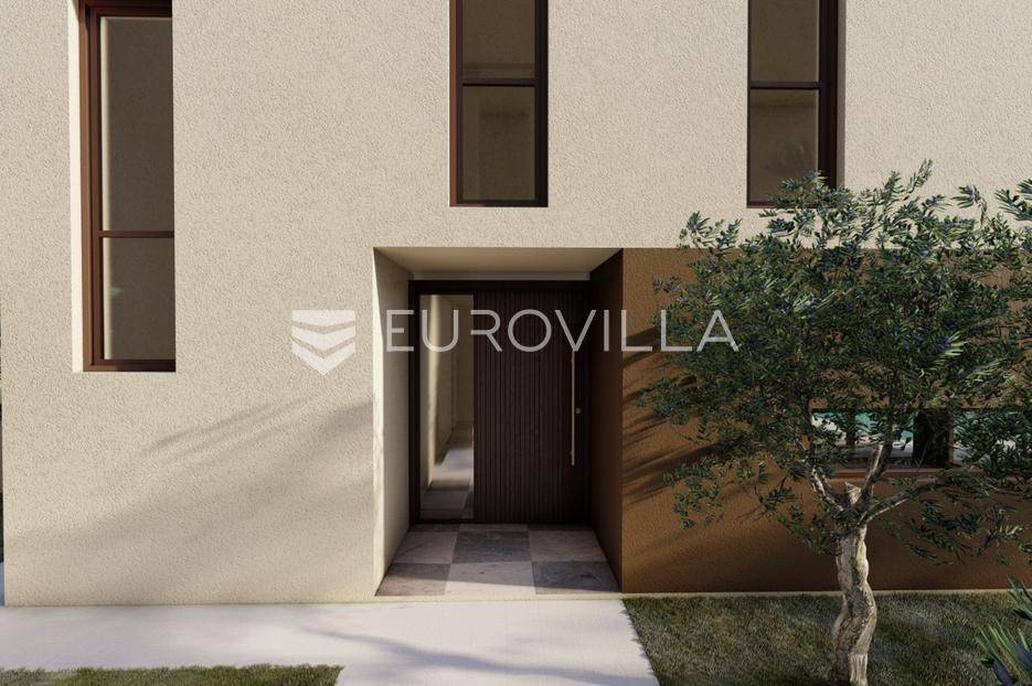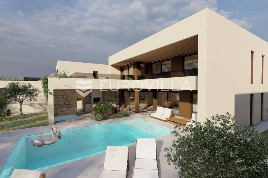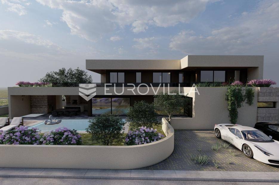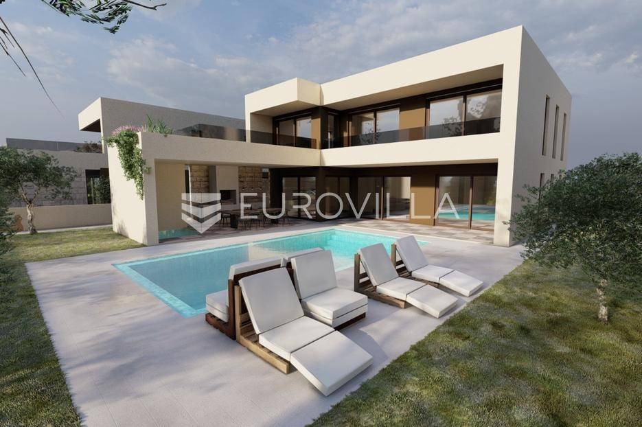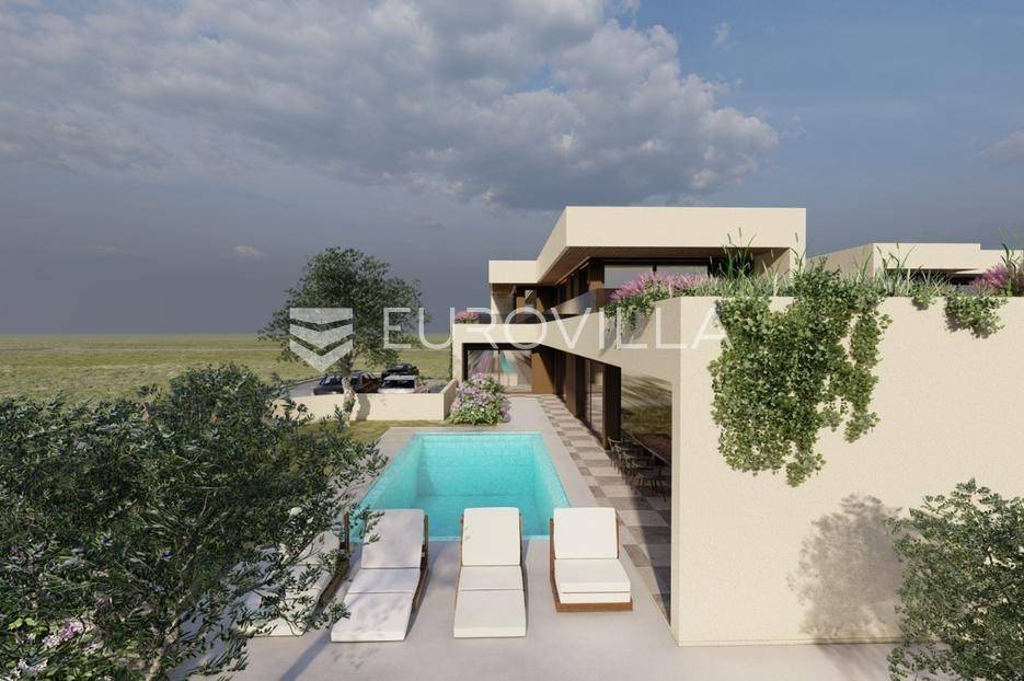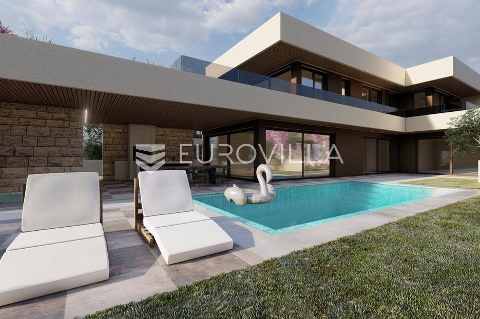 U mirnom i zelenom dijelu mjesta Murvica, svega nekoliko minuta vožnje od Zadra i mora, smješten je projekt moderne vile vrhunske arhitekture koji savršeno spaja suvremeni dizajn, funkcionalnost i mediteranski način života.Vila je projektirana na parceli površine približno 639 m², dok ukupna bruto razvijena površina objekta iznosi približno 240–250 m². Prostor je pažljivo osmišljen kako bi pružio maksimalnu privatnost i otvorenost prema vanjskim zonama boravka.U prizemlju se nalazi impresivan open space dnevni prostor s kuhinjom i blagovaonicom površine oko 60 m², s velikim staklenim stijenkama koje prostor prirodno povezuju s natkrivenom terasom i vrtom.Dodatno se u prizemlju nalaze:ulazni prostorgarderobagostinjski WCvešeraj / ostavaVanjski dio vile zamišljen je kao privatna zona odmora s:bazenom dimenzija približno 3,5 × 8 mprostranom natkrivenom ljetnom kuhinjom i blagovaonicomwellness zonom sa saunom i jacuzzijemuređenim vrtom i zelenim površinamaNa katu su smještene prostrane spavaće sobe s pripadajućim kupaonicama i garderobama, s izlazima na natkrivene i nenatkrivene terase koje pružaju pogled na okolni krajolik i zelenilo.Dodatne značajkemoderna arhitektura ravnih linijavelike staklene stijene i puno prirodnog svjetlauređene zelene površine oko objektaviše parkirnih mjesta na parcelimirna i diskretna lokacija u blizini ZadraProjekt predstavlja izvrsnu kombinaciju suvremenog dizajna, privatnosti i komfora te je idealan za cjelogodišnji boravak ili luksuzni mediteranski odmor.Za dodane informacije i obilazak lokacije stojimo na rapolaganju... Više na eurovilla.hr, ID: 805396