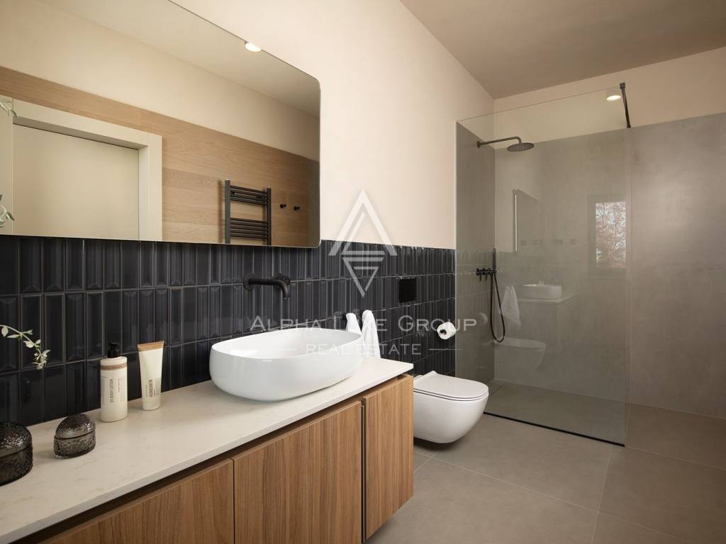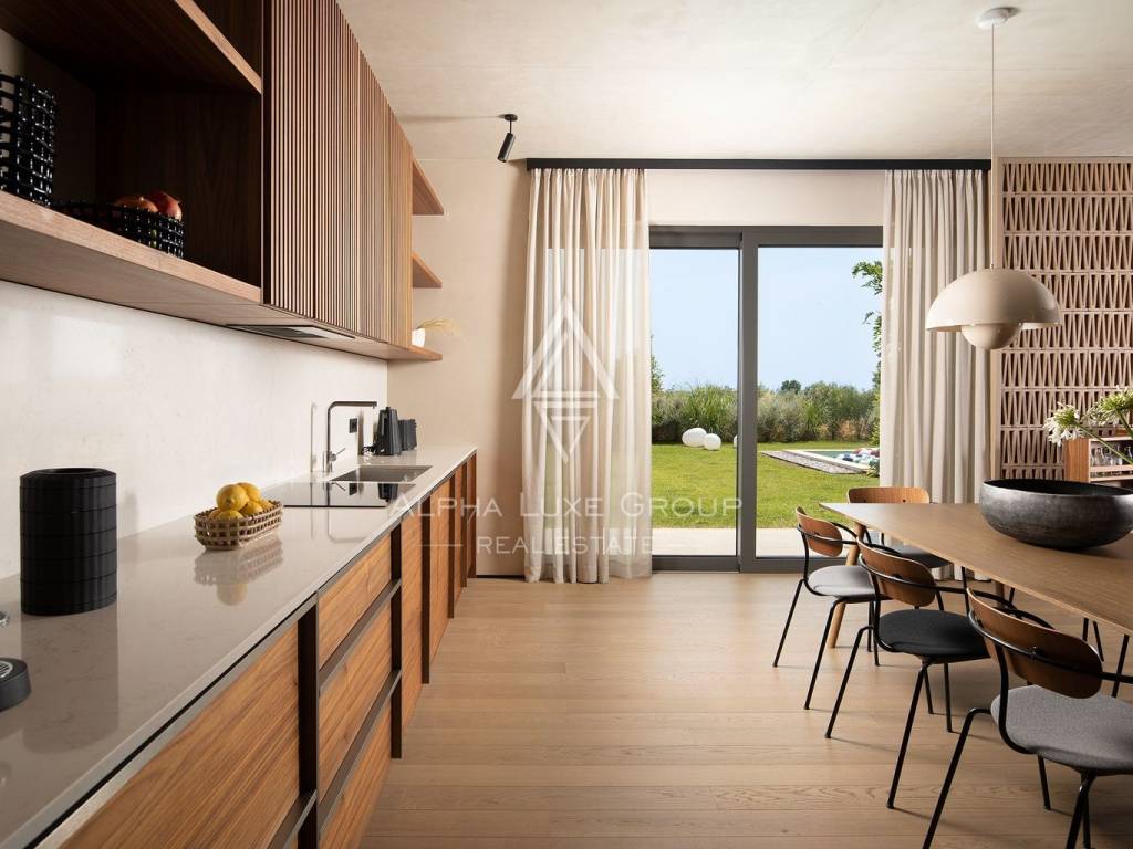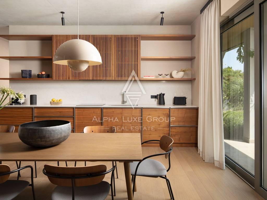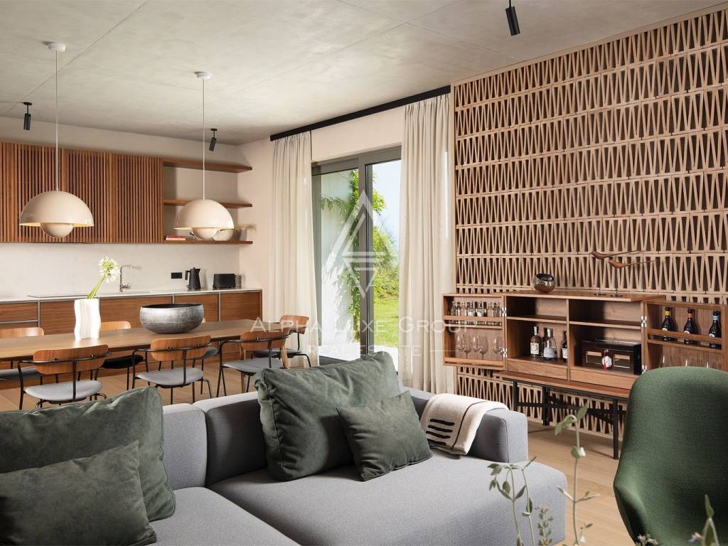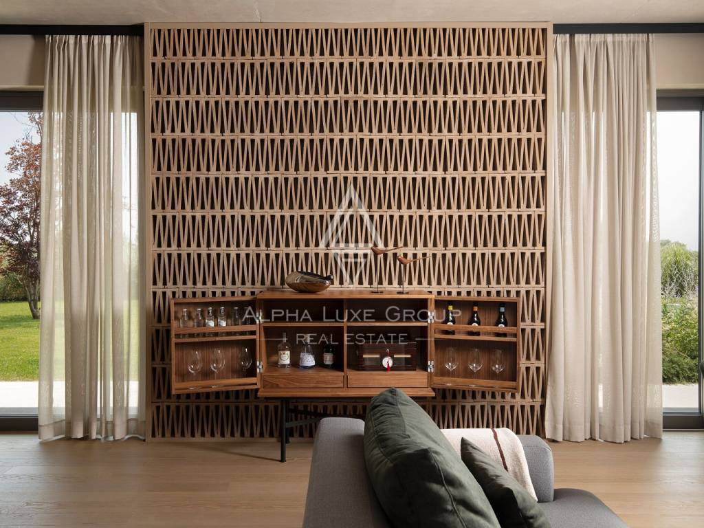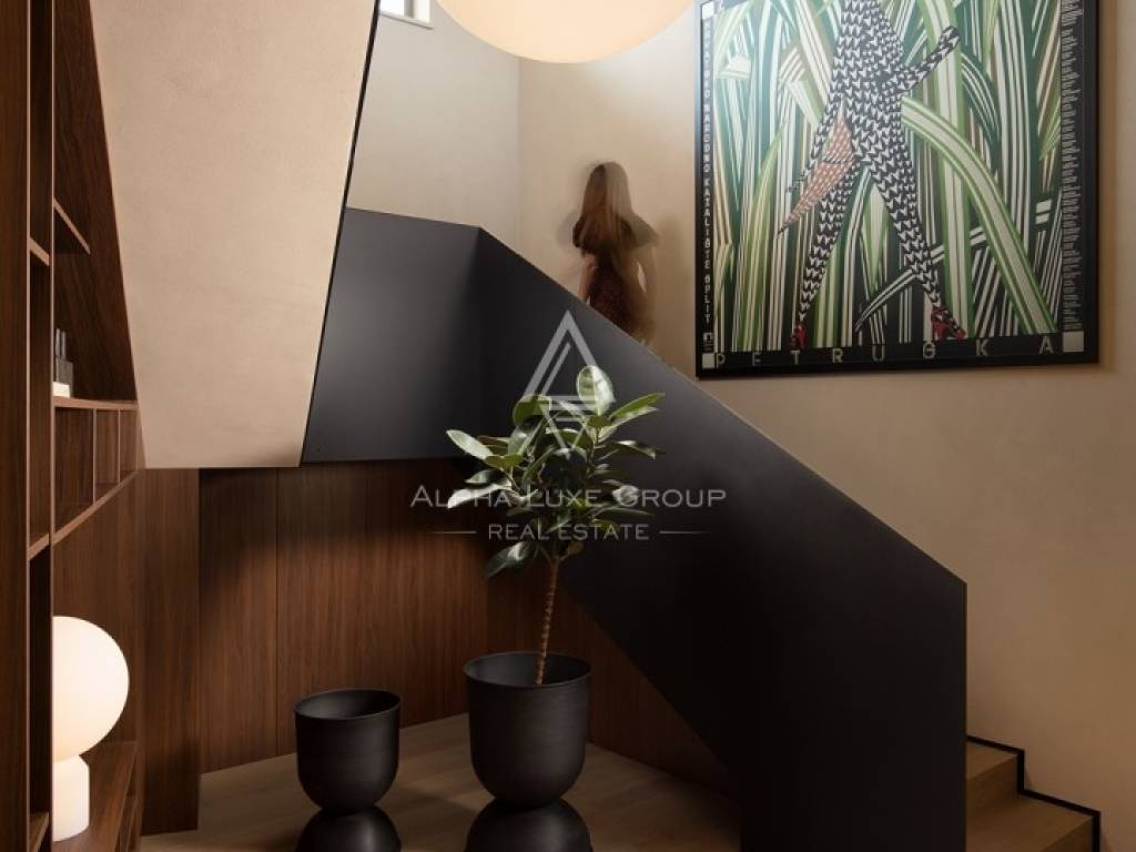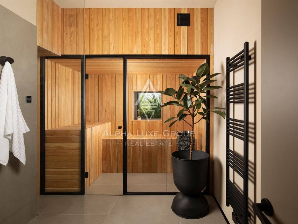 The ground floor is designed as a spacious open-concept living area, which combines a living room, a fully equipped kitchen and a dining room. This area leads to a covered terrace and a garden with a swimming pool, creating a natural transition between indoor and outdoor spaces. On the same floor there is a bedroom with a private bathroom, a sauna with an additional shower and a 25 m² wine cellar.