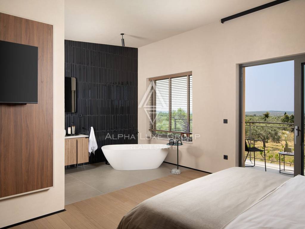 Upstairs is the master bedroom with its own bathroom, along with two additional bedrooms and a shared bathroom. All bedrooms have access to a spacious terrace with a lounge area, which offers a beautiful view of the surrounding landscape and the sea.