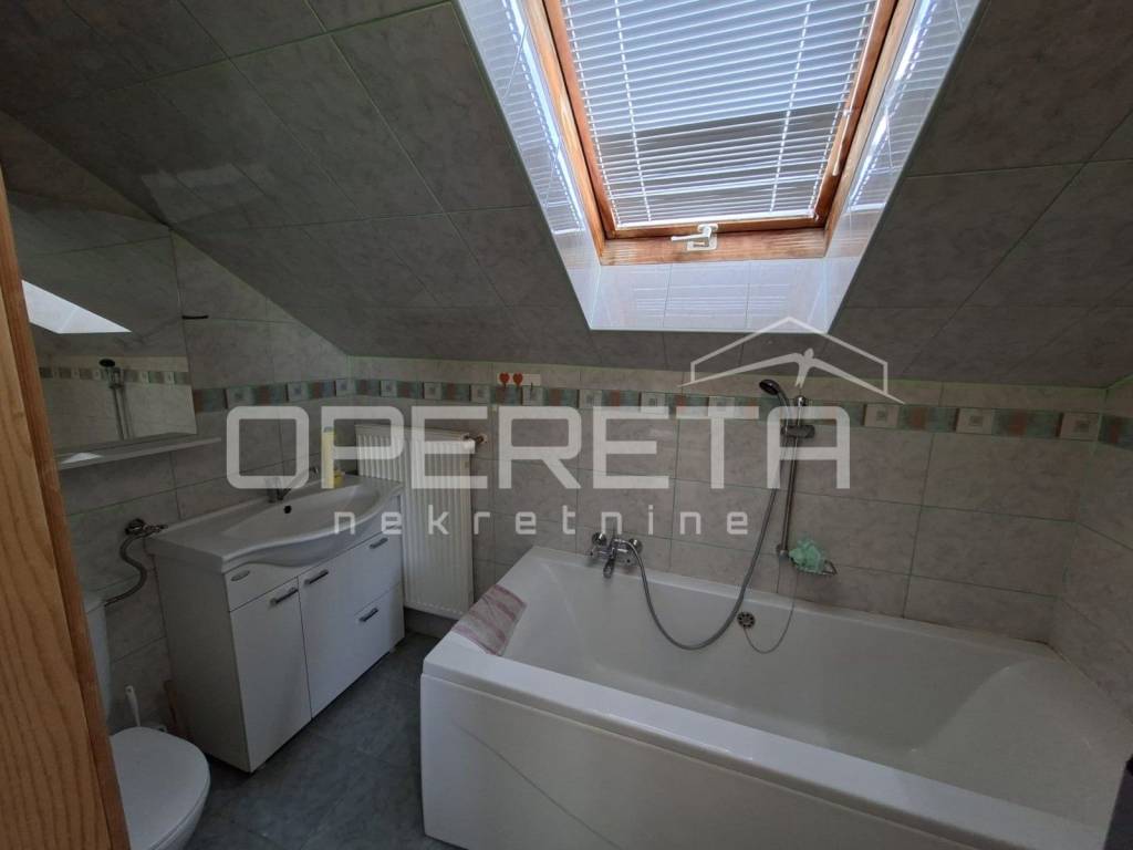 Kat, povezan unutarnjim stubištem, sadrži prostranu spavaću sobu s vlastitom garderobom te dodatnu kupaonicu.