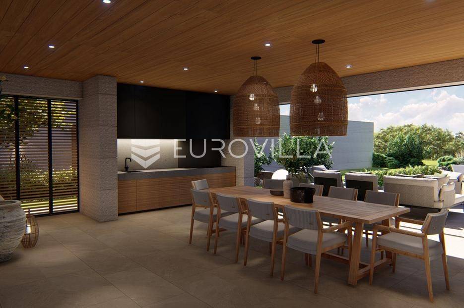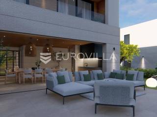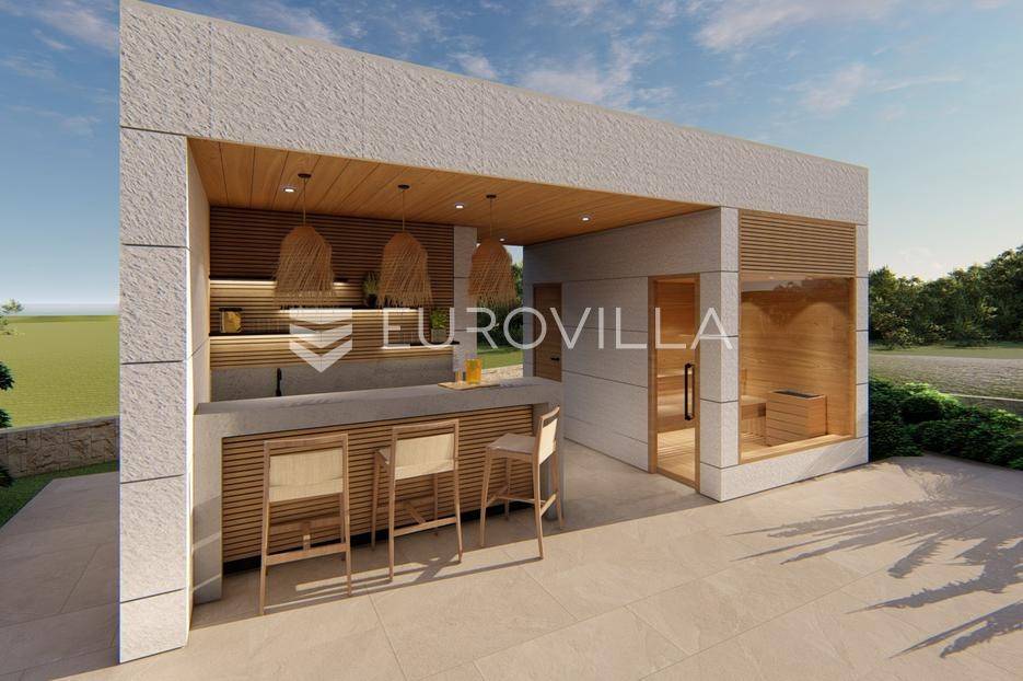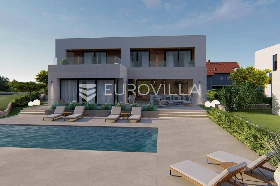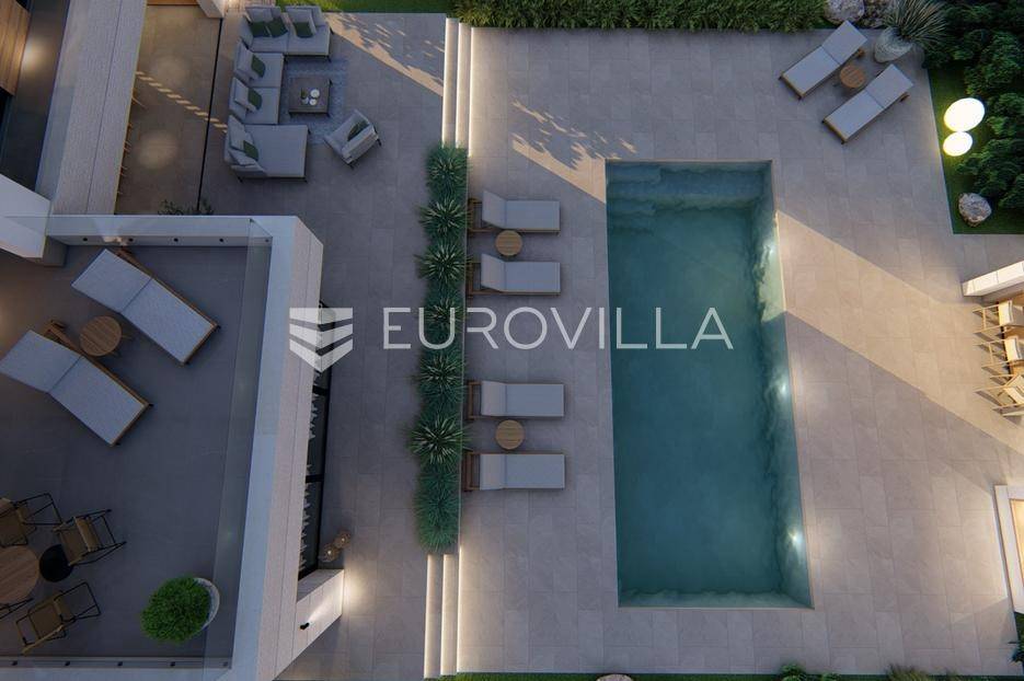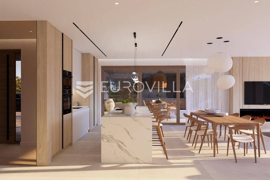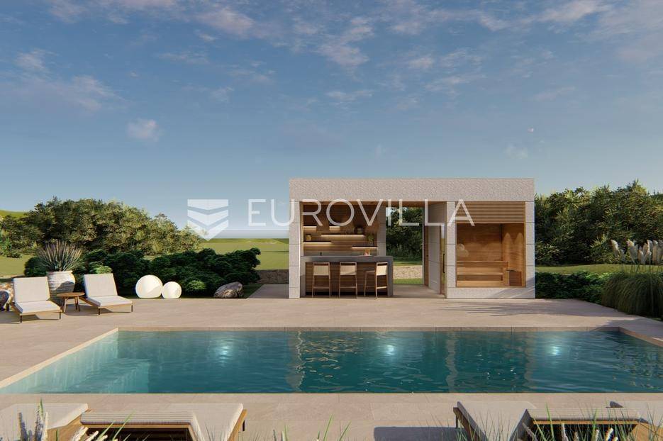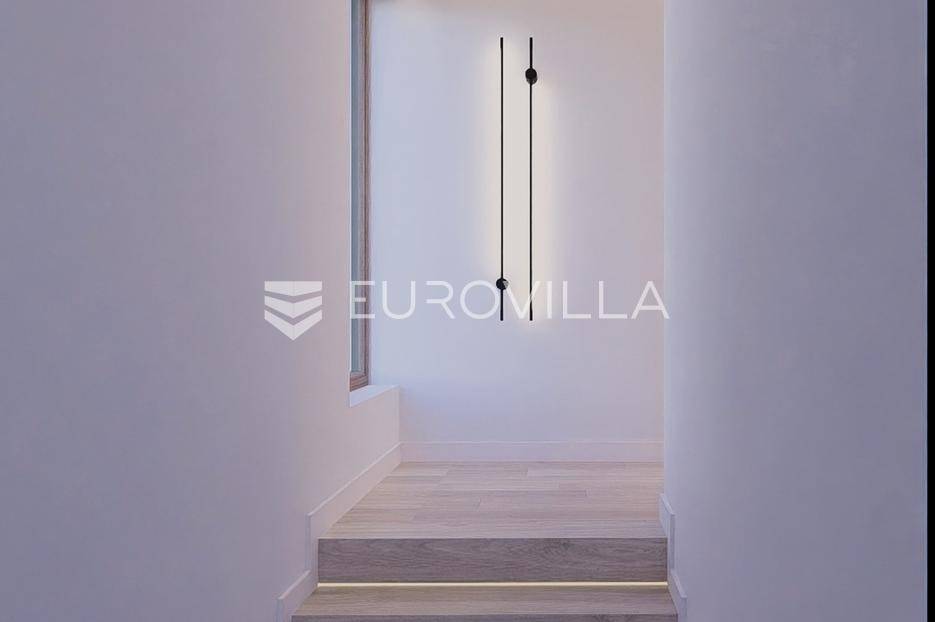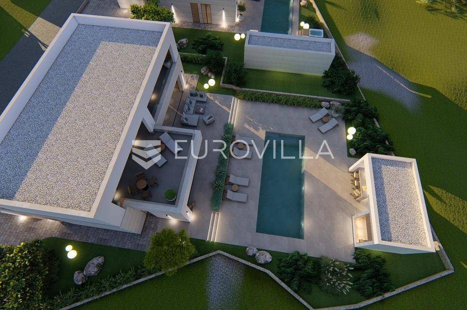 Primošten, moderna vila s bazenom i pogledom na more površine 314,1 m². Trenutačno je u izgradnji, te je planiran završetak do ljeta ove godine.Izgrađena na 2 etaže na parceli od 898 m². Sastoji se od prizemlja u kojem se nalazi dnevni boravak s kuhinjom i blagovaonicom, jedna spavaća soba s privatnom kupaonicom, toaleta i spremišta. Dnevni boravak se otvara na prostranu natkrivenu terasu s roštiljem. U dvorištu pokraj grijanog bazena nalazi se i pomoćni objekt u kojem je sauna, toalet i natkrivena terasa. Unutarnjim stepenicama dolazimo na kat gdje se nalaze još 3 spavaće sobe, od kojih svaka ima privatnu kupaonicu. Svaka spavaća sobe ima izlaz na lođu, te s lođe na veliku terasu.Vila je jako kvalitetno građena, te su korišteni vrhunski materijali. Na podovima je keramika u prizemlju i na terasama, a na katu je parket. Opremljena je podnim grijanjem u boravku, kuhinji i kupaonicama. Stolarija je drvo-aluminij, a fasada je kamena. Na krovu se nalazi fotonaponska elektrana, a cijelom kućom se daljinski upravlja preko smarthome sustava.Oko vile se prostire lijep vrt, te prostor za sunčanje. Pokraj vile nalaze se 4 parkirna mjesta, od kojih su dva natkrivena. Mikrolokacija vile je odlična, na jako mirnom mjestu, te je udaljenost od mora 1650 metara.Sve ostale informacije na upit.... Više na eurovilla.hr, ID: 554016