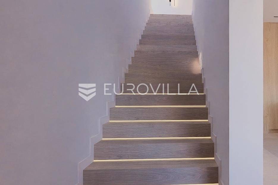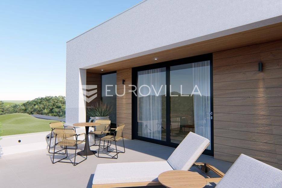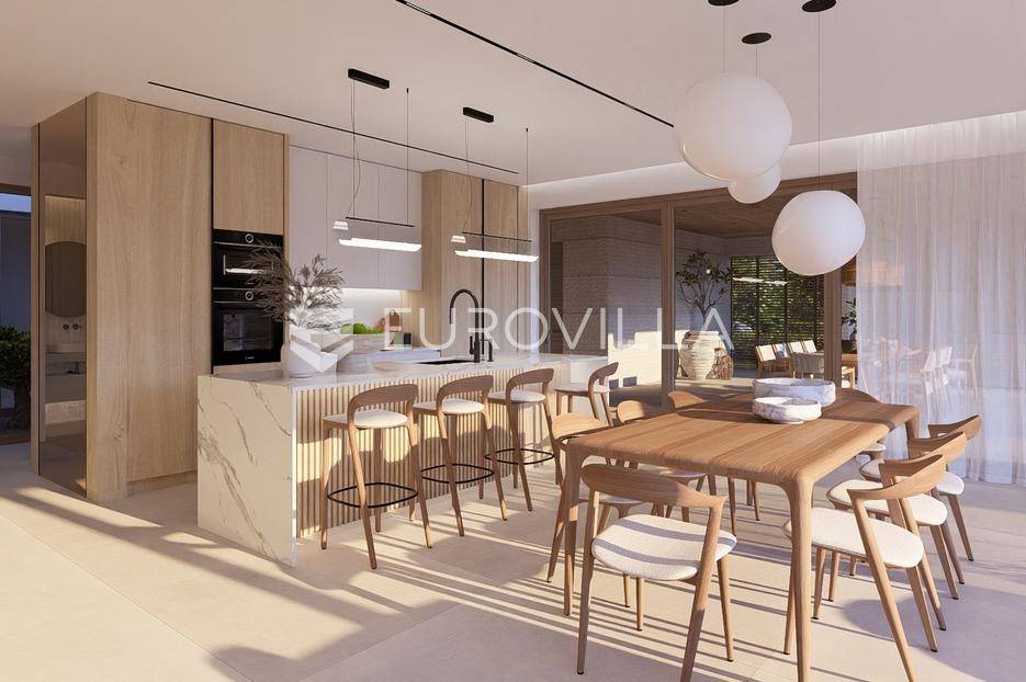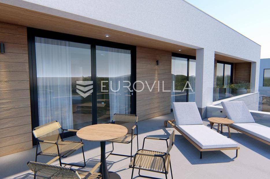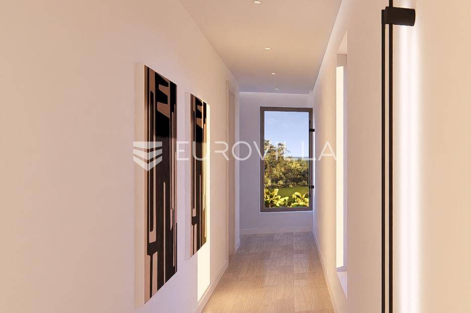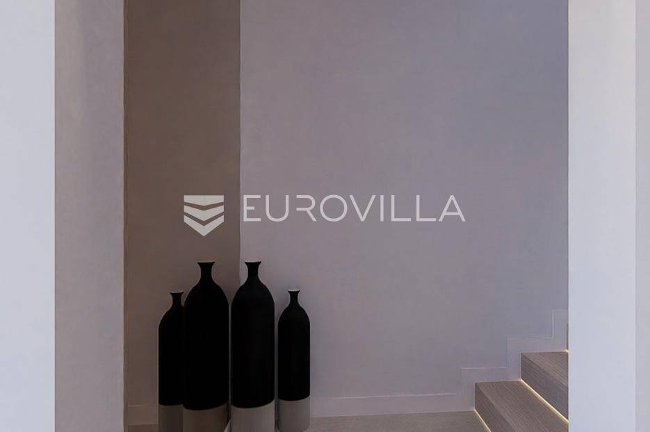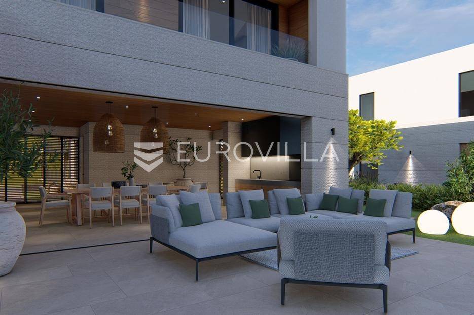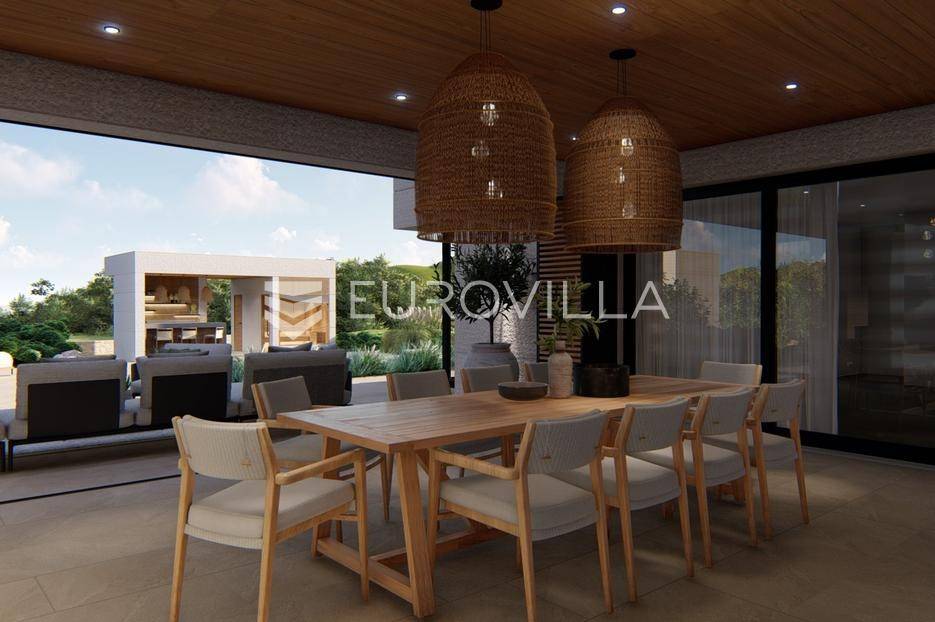 Primošten, moderna vila s bazenom i pogledom na more površine 314,1 m². Trenutačno je u izgradnji, te je planiran završetak do ljeta ove godine.Izgrađena na 2 etaže na parceli od 898 m². Sastoji se od prizemlja u kojem se nalazi dnevni boravak s kuhinjom i blagovaonicom, jedna spavaća soba s privatnom kupaonicom, toaleta i spremišta. Dnevni boravak se otvara na prostranu natkrivenu terasu s roštiljem. U dvorištu pokraj grijanog bazena nalazi se i pomoćni objekt u kojem je sauna, toalet i natkrivena terasa. Unutarnjim stepenicama dolazimo na kat gdje se nalaze još 3 spavaće sobe, od kojih svaka ima privatnu kupaonicu. Svaka spavaća sobe ima izlaz na lođu, te s lođe na veliku terasu.Vila je jako kvalitetno građena, te su korišteni vrhunski materijali. Na podovima je keramika u prizemlju i na terasama, a na katu je parket. Opremljena je podnim grijanjem u boravku, kuhinji i kupaonicama. Stolarija je drvo-aluminij, a fasada je kamena. Na krovu se nalazi fotonaponska elektrana, a cijelom kućom se daljinski upravlja preko smarthome sustava.Oko vile se prostire lijep vrt, te prostor za sunčanje. Pokraj vile nalaze se 4 parkirna mjesta, od kojih su dva natkrivena. Mikrolokacija vile je odlična, na jako mirnom mjestu, te je udaljenost od mora 1650 metara.Sve ostale informacije na upit.... Više na eurovilla.hr, ID: 554016