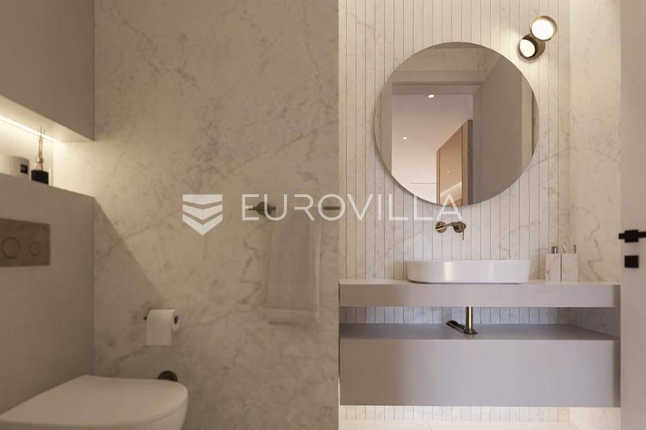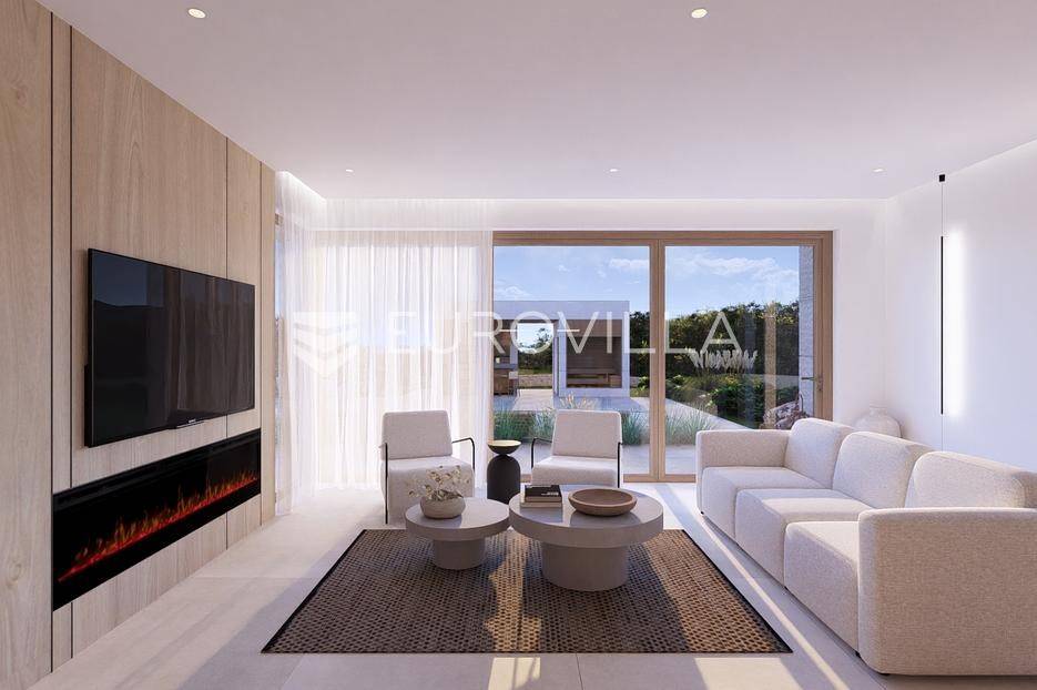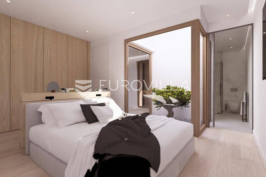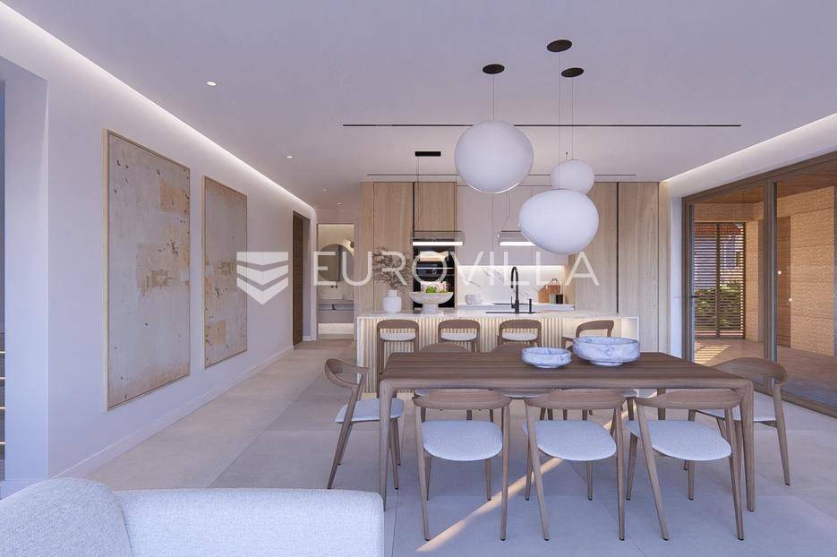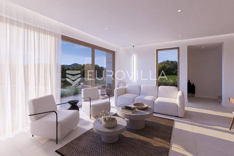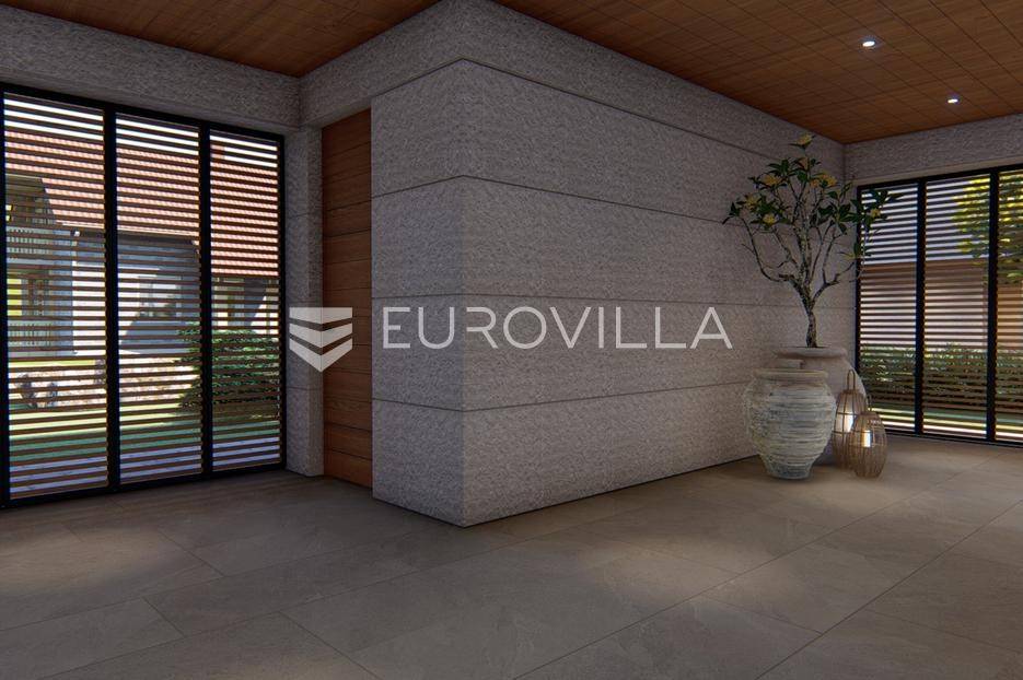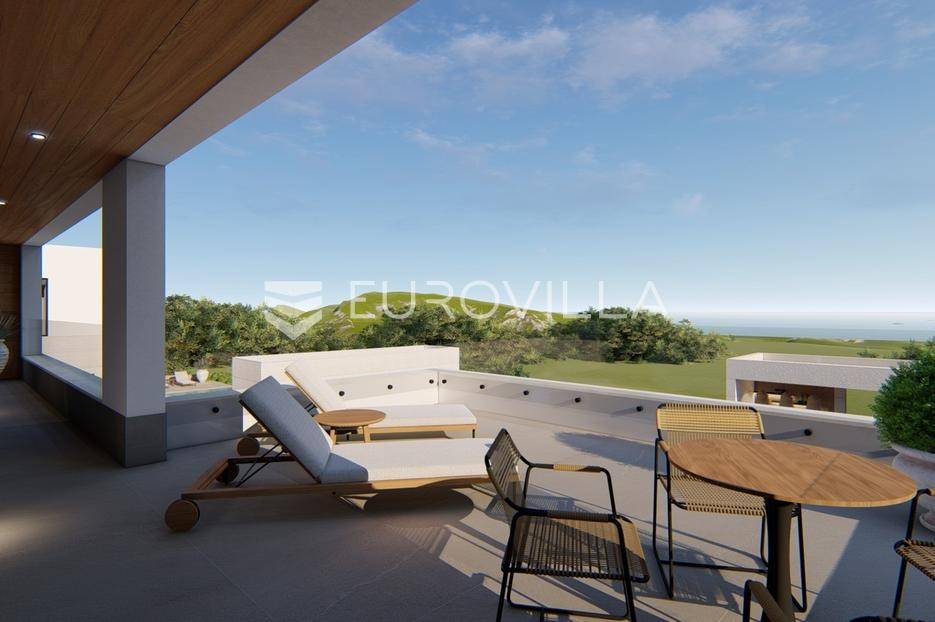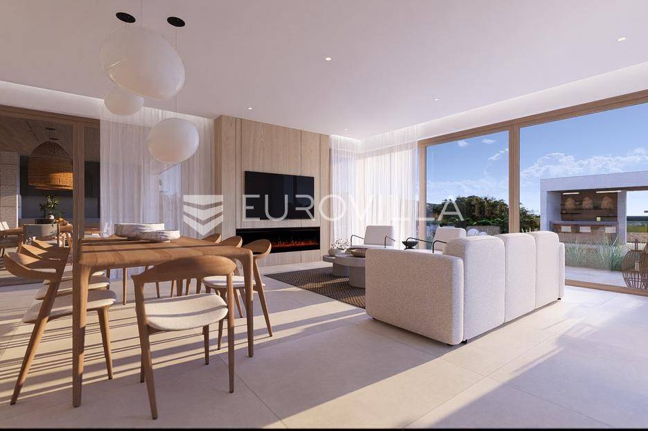 Primošten, moderna vila s bazenom i pogledom na more površine 314,1 m². Trenutačno je u izgradnji, te je planiran završetak do ljeta ove godine.Izgrađena na 2 etaže na parceli od 898 m². Sastoji se od prizemlja u kojem se nalazi dnevni boravak s kuhinjom i blagovaonicom, jedna spavaća soba s privatnom kupaonicom, toaleta i spremišta. Dnevni boravak se otvara na prostranu natkrivenu terasu s roštiljem. U dvorištu pokraj grijanog bazena nalazi se i pomoćni objekt u kojem je sauna, toalet i natkrivena terasa. Unutarnjim stepenicama dolazimo na kat gdje se nalaze još 3 spavaće sobe, od kojih svaka ima privatnu kupaonicu. Svaka spavaća sobe ima izlaz na lođu, te s lođe na veliku terasu.Vila je jako kvalitetno građena, te su korišteni vrhunski materijali. Na podovima je keramika u prizemlju i na terasama, a na katu je parket. Opremljena je podnim grijanjem u boravku, kuhinji i kupaonicama. Stolarija je drvo-aluminij, a fasada je kamena. Na krovu se nalazi fotonaponska elektrana, a cijelom kućom se daljinski upravlja preko smarthome sustava.Oko vile se prostire lijep vrt, te prostor za sunčanje. Pokraj vile nalaze se 4 parkirna mjesta, od kojih su dva natkrivena. Mikrolokacija vile je odlična, na jako mirnom mjestu, te je udaljenost od mora 1650 metara.Sve ostale informacije na upit.... Više na eurovilla.hr, ID: 554016