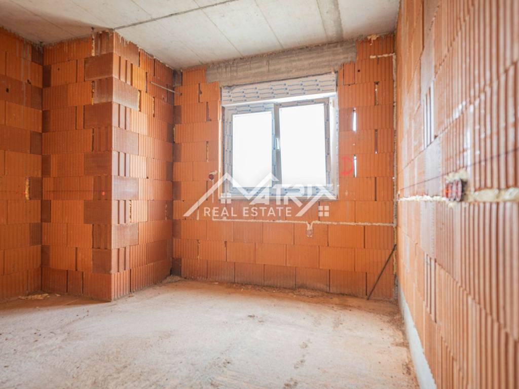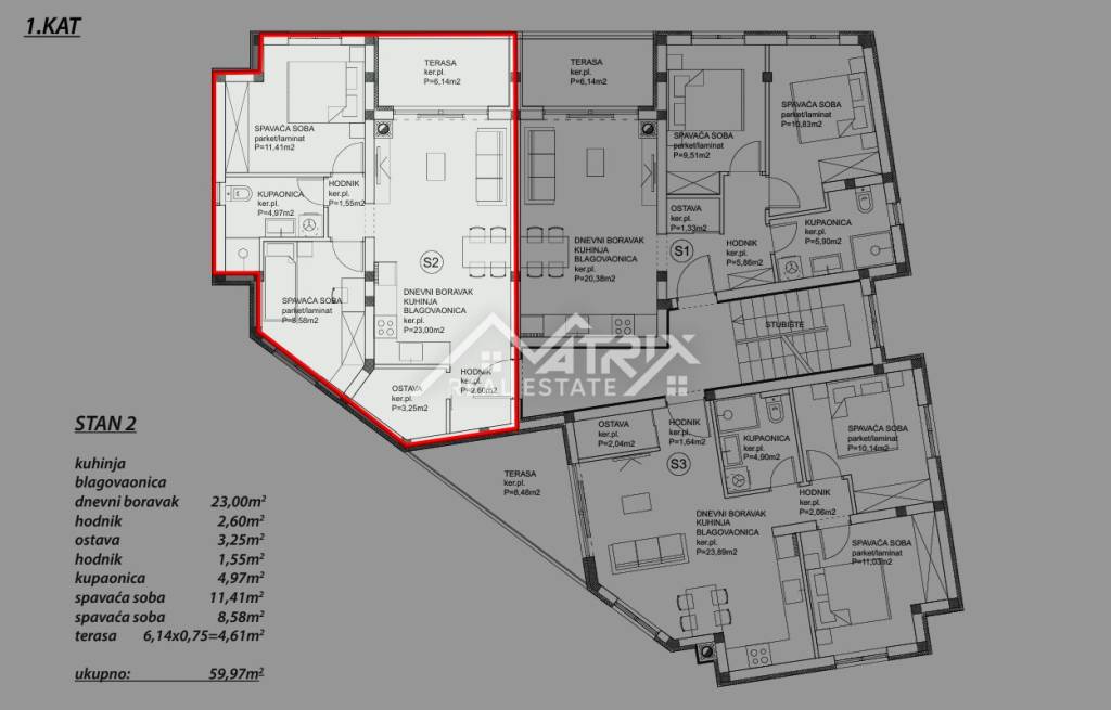 The layout is functional and makes excellent use of the space. The living area features an open-plan kitchen, dining area and living room measuring 23.00 m², with access to a terrace (calculated area 4.61 m²). The sleeping area includes two bedrooms: a larger one of 11.41 m² and a second bedroom of 8.58 m², ideal as a children’s room, home office or guest room. The apartment also includes a 4.97 m² bathroom, a 3.25 m² storage room, and two hallways measuring 2.60 m² and 1.55 m², ensuring a clear separation between day and night zones. The total apartment area is 59.97 m².