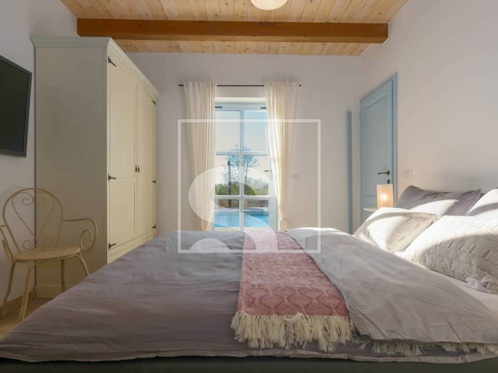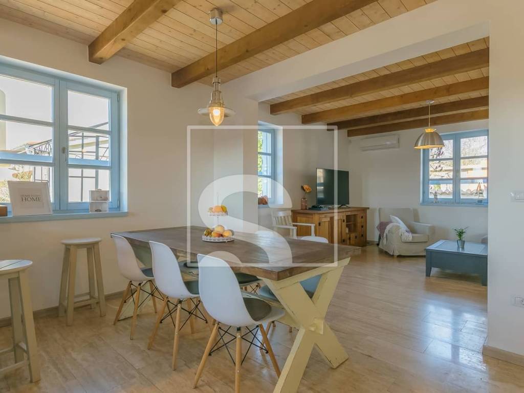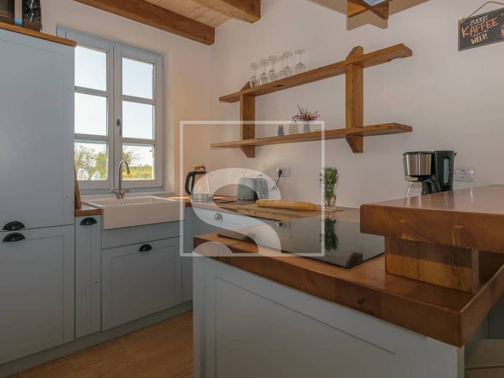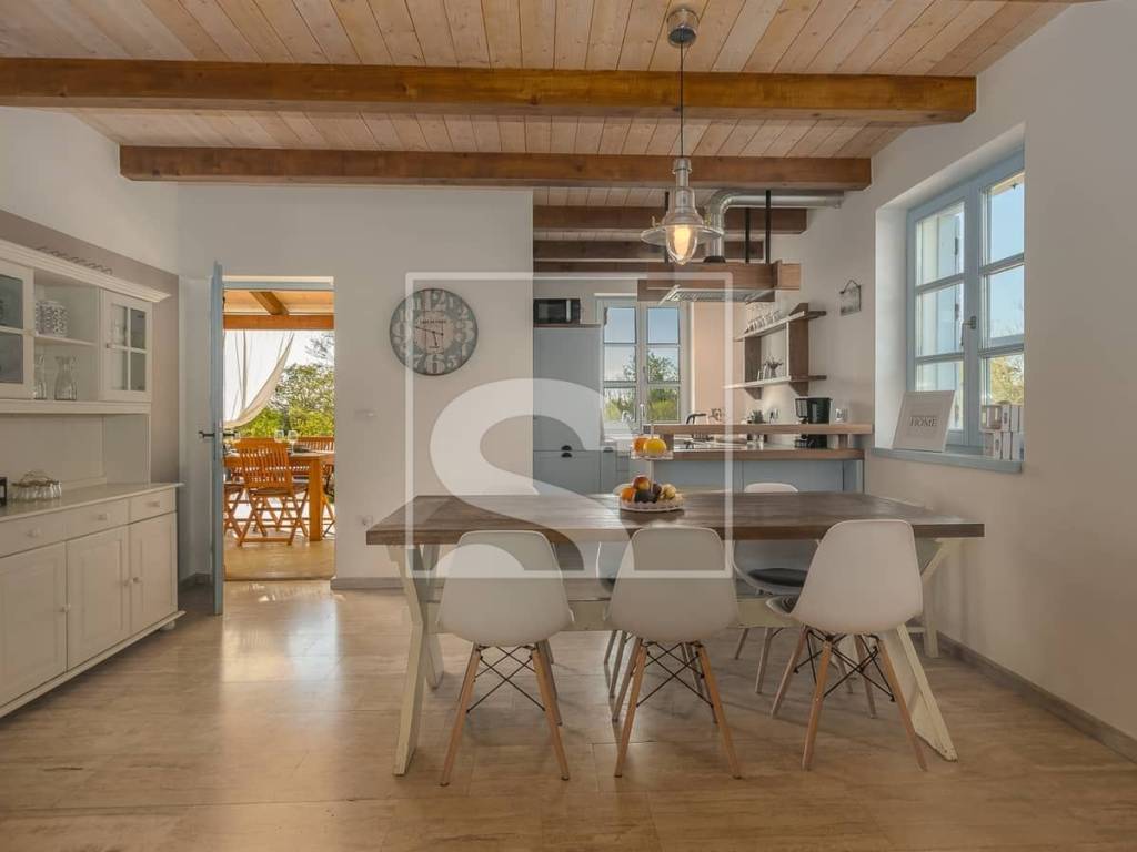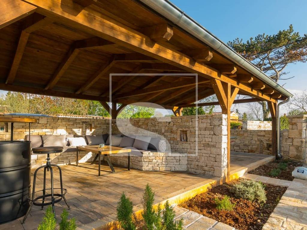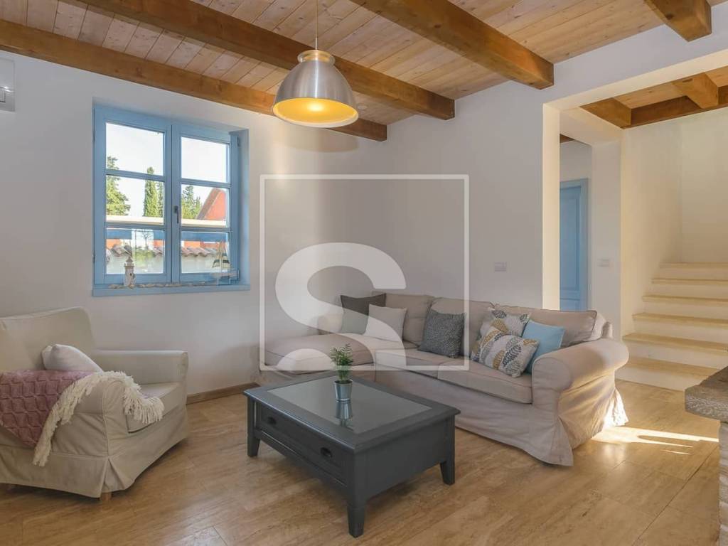 The villa extends over 178 m² of living space, situated on a beautifully landscaped 750 m² plot. At first glance, it captivates with its timeless architecture where stone and wood blend harmoniously, creating a warm and welcoming atmosphere. The interior is further enhanced by ceilings defined by decorative wooden beams, emphasizing the authentic Istrian character of the property. The interior is spacious, functional, and filled with natural light, with every detail carefully designed to provide maximum comfort and a true sense of home.