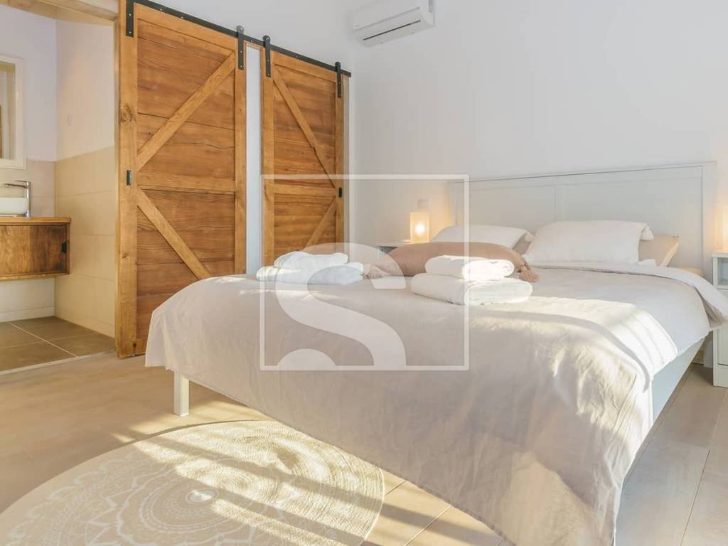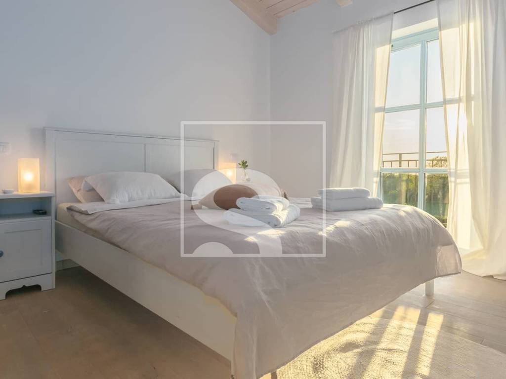 The exterior of the villa is equally impressive. At the center of the garden there is a swimming pool with a sunbathing area, equipped with a saltwater system (salinator) that allows for more natural and comfortable water maintenance. A covered lounge area is perfect for enjoying warm summer days. The landscaped garden is fully enclosed by a traditional stone wall, further emphasizing the authentic character of the property while ensuring privacy and security.