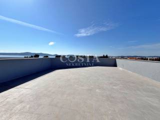 A penthouse under construction is for sale in Sukošan near Zadar. The apartment with a living area of ​​67.92 m2 is located on the second floor of a smaller residential building with six units. It consists of a spacious living room, kitchen and dining room, two bedrooms, bathroom, additional toilet, hallway, hallway and a loggia of an additional 22.87 m2. The apartment also has a spacious roof terrace with an impressive sea view of an additional 63.22 m2, and an outdoor parking space. The total usable area of ​​the apartment, including the annexes, is 173.52 m2 (K.V. 111.4 m2).