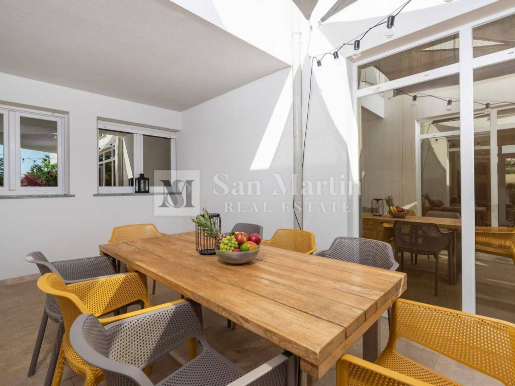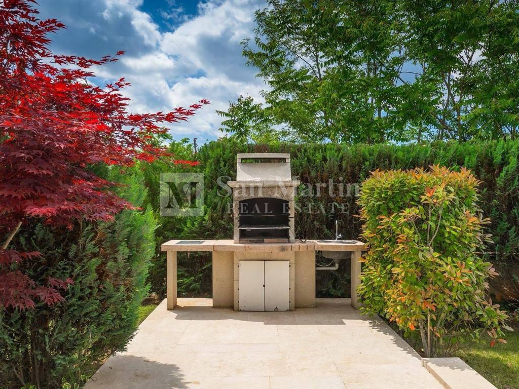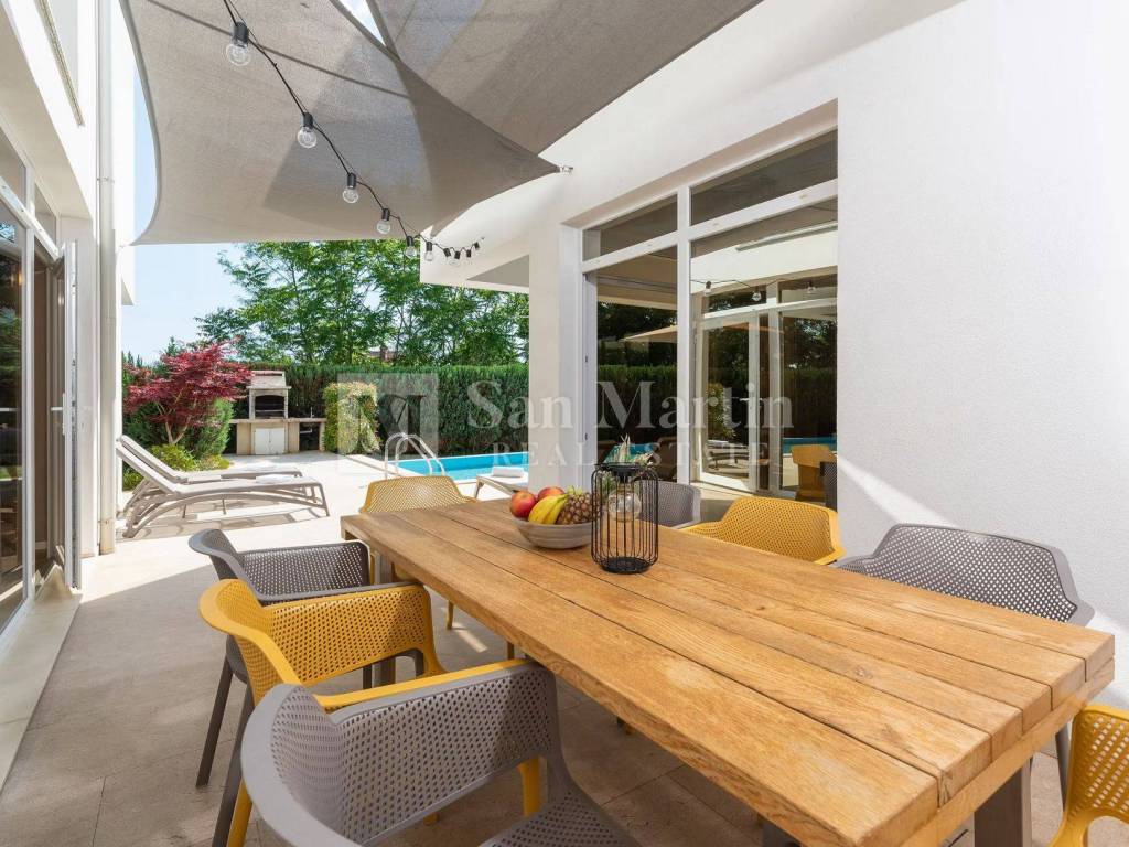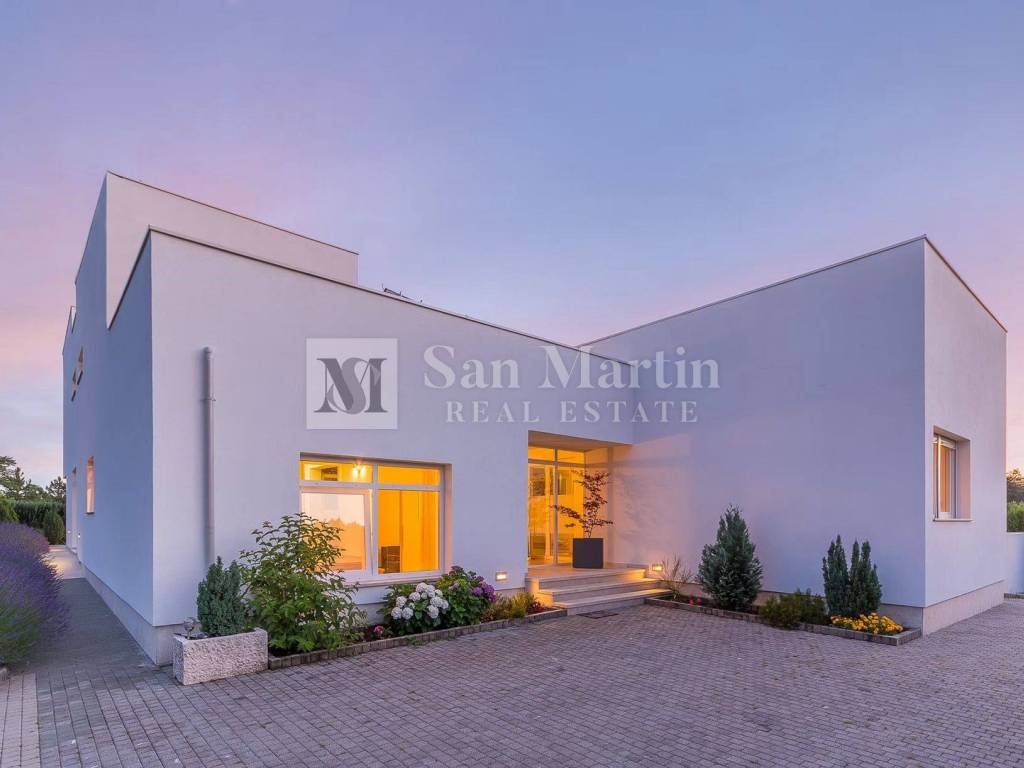 The villa has four bedrooms, five bathrooms and an additional guest toilet, and is sold fully furnished and equipped. The quality of construction is confirmed by the reinforced concrete structure, stone flooring and carefully selected materials. A system with a heat pump, underfloor heating and air conditioning ensures a pleasant temperature throughout the year, while a solar system participates in the preparation of hot water. The smart management system allows you to control the house via your mobile device.