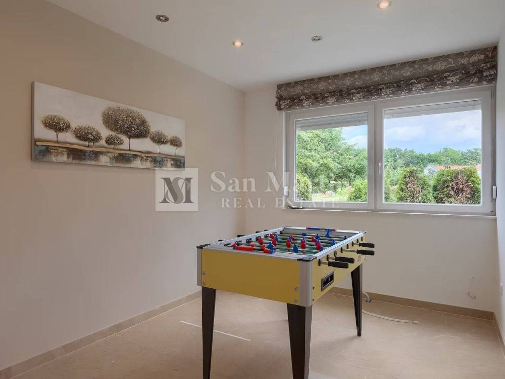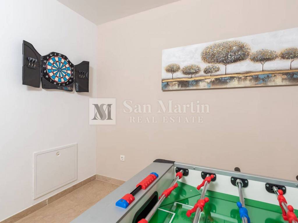For relaxation, there is a 28 m heated indoor pool with an infrared sauna and a 32 m outdoor pool with heating. The villa also offers a space for socializing and recreation, including table tennis, table football, darts and a spacious garden with a place to play and relax.