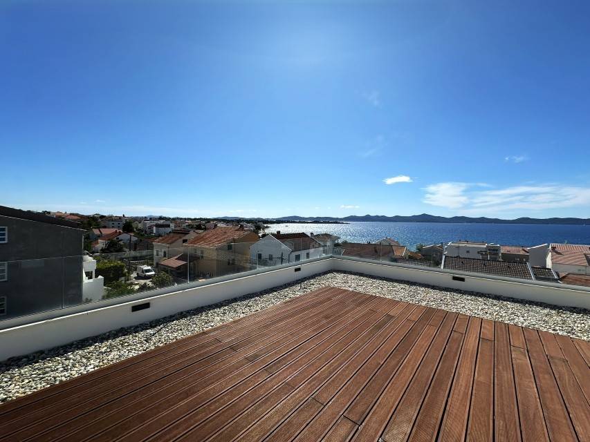 Penthouse under construction is for sale, just 150 m from the sea, in the prestigious Zadar neighbourhood Diklo. The move-in is planned for July 2024. In addition to the excellent layout of the rooms and sea view, this property offers high-quality equipment: video surveillance, security doors, thermal facade, underfloor heating, electric shutters and an insect net, and it also has two parking spaces. Penthouse A3 in building A, with an area of 115 m2, consists of an entrance area with storage that leads to three spacious bedrooms, a bathroom and a laundry room. The open-concept kitchen, dining room and living room extend onto a covered terrace of 11 m2. The special attraction of this penthouse is the spacious roof terrace of approx. 60m2, which offers a spectacular view of the sea. The property is located in a quiet part of Zadar, ideal for enjoyment and rest, known for its beautiful beaches and luxurious villas. Whether you enjoy traditional Dalmatian cuisine or soak up the sun on the beach, the city district of Diklo offers numerous opportunities for relaxation and enjoyment. Zadar is surrounded by historic walls, treasures from the ancient, medieval and renaissance periods, as well as numerous contemporary architectural achievements such as the first Sea Organ and the Salutation to the Sun installation. Zadar is also connected to the highway to Zagreb, and since it has an airport, it is practically connected by sea, road and air to all of Europe and the world. Contact our agent and schedule your tour. Note: Renderings are used in the ad.