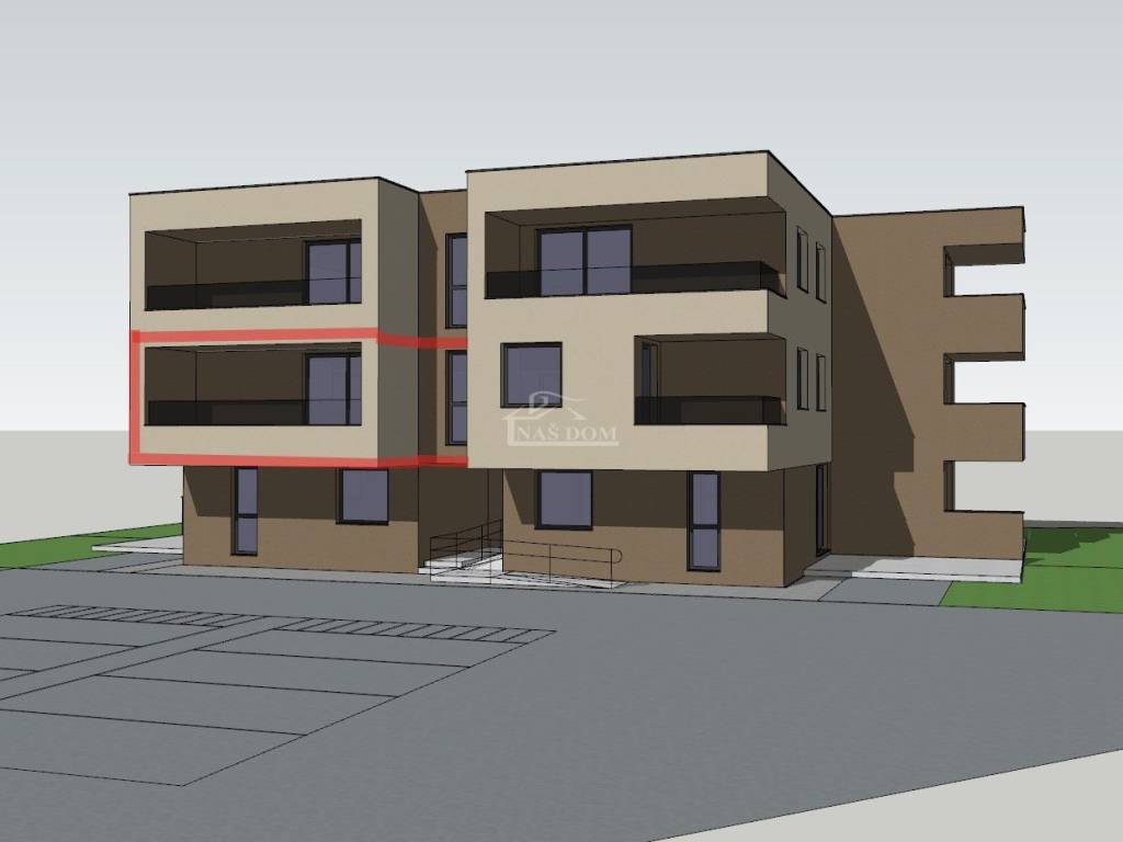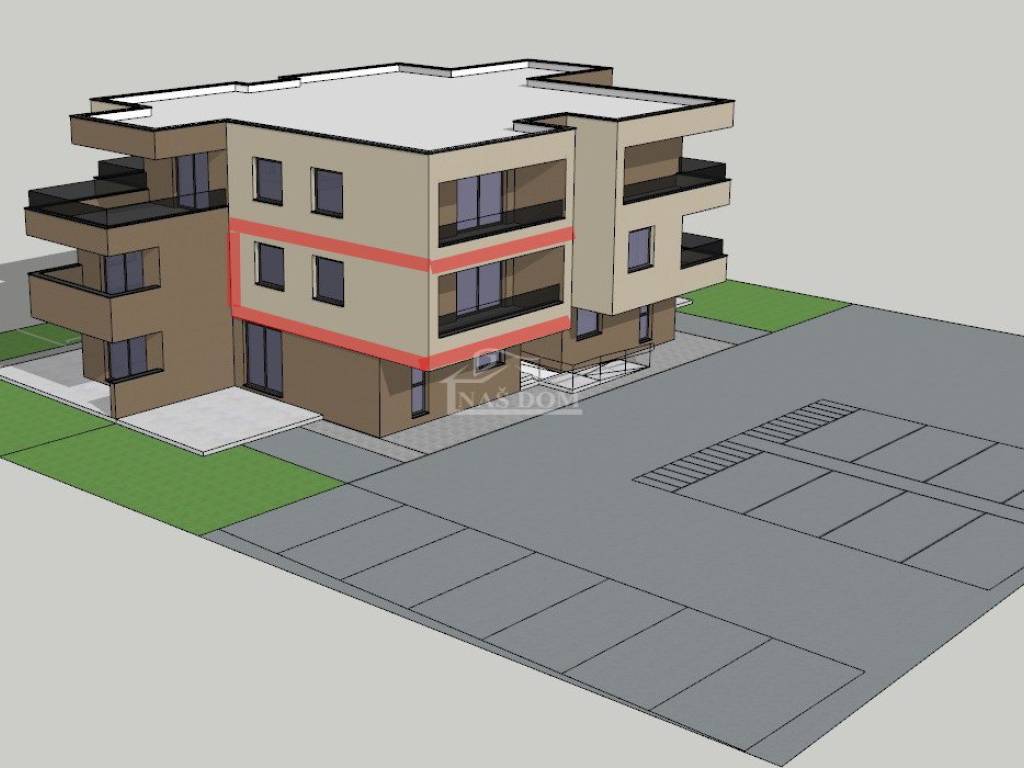 Apartment with garden S1 on the ground floor with an area of 81.69 m2, consisting of: living room, bathroom, hallway, room 1, room 2, terrace, balcony, and garden of 136 m2 plus two parking spaces in the building’s courtyard = €228,000.00, VAT included in the price