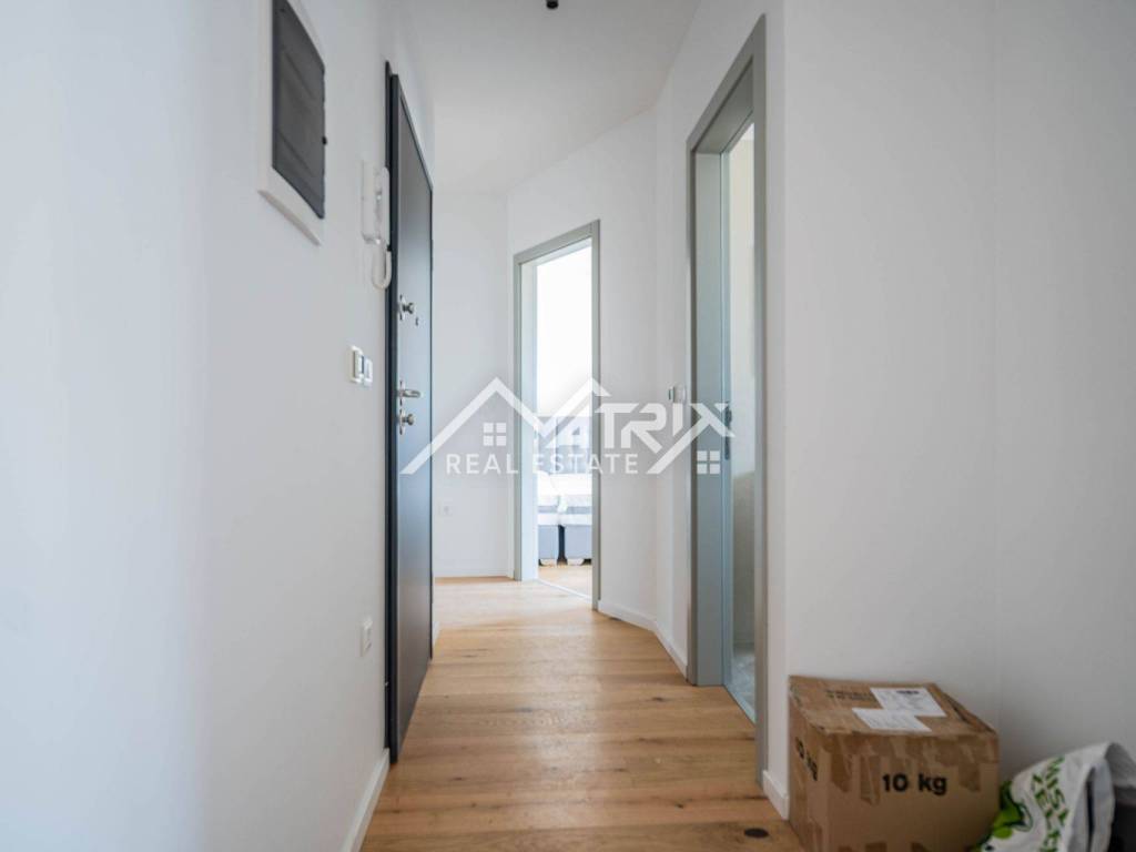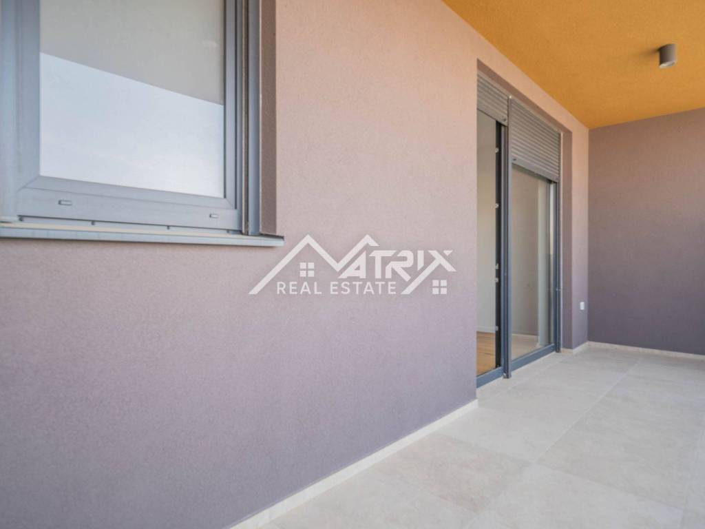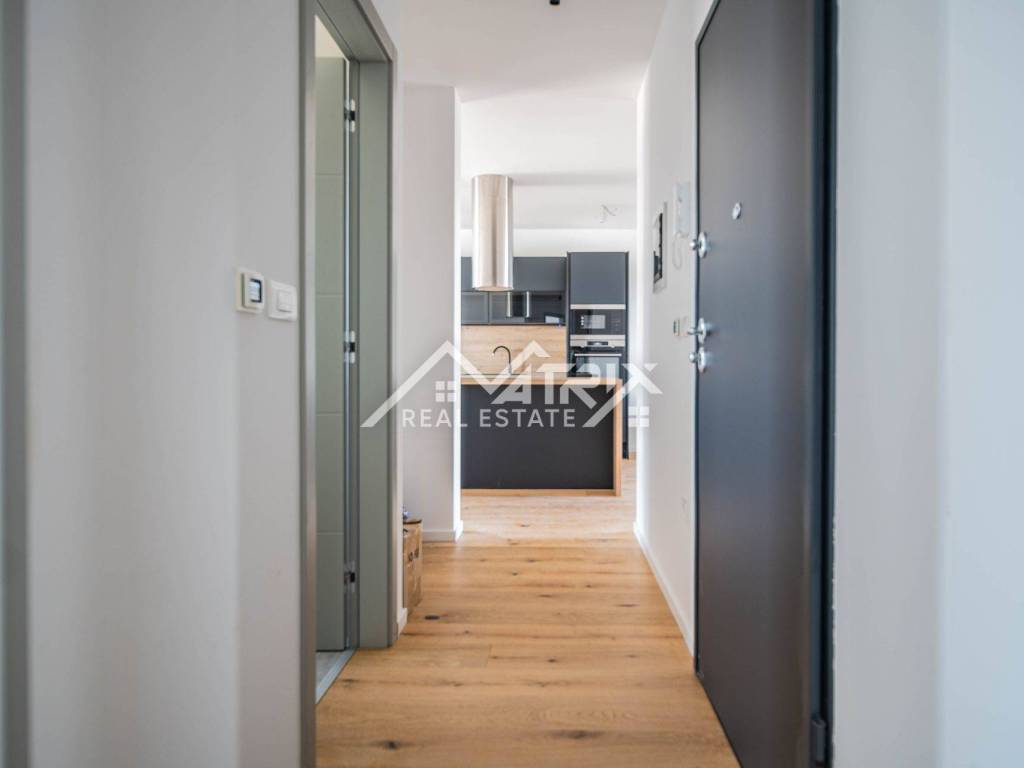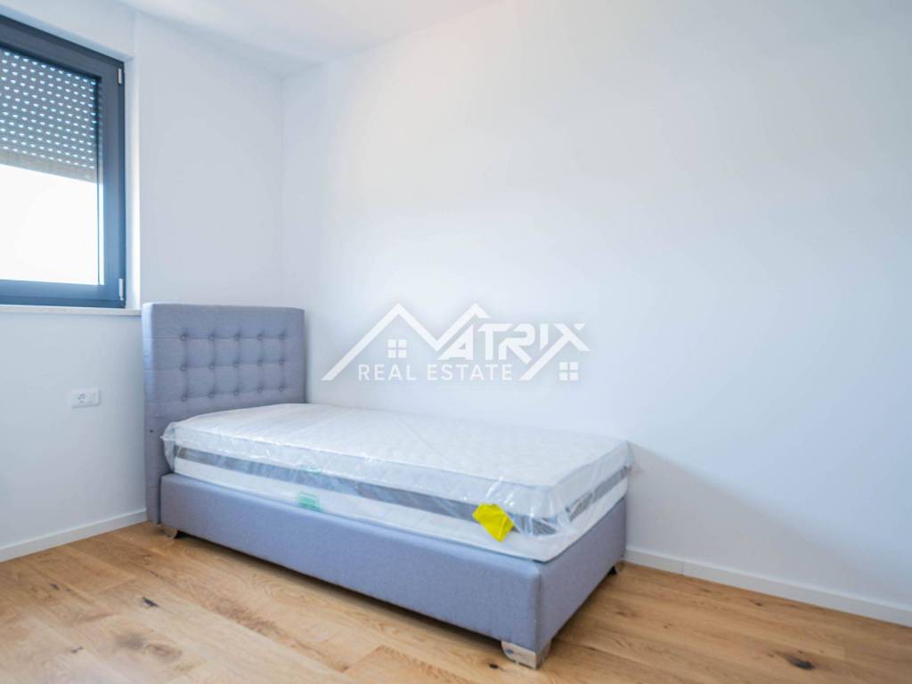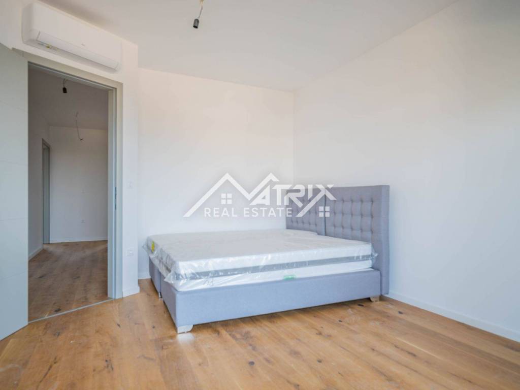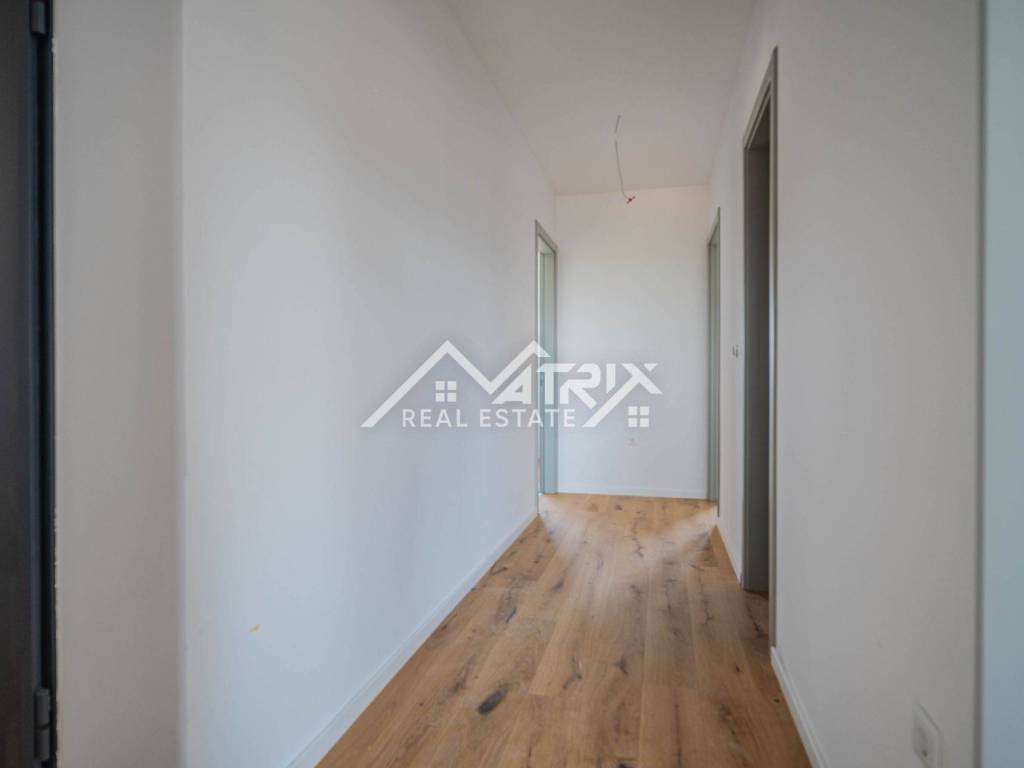 For sale is an apartment on the 2nd floor of a new-build in Pula, in a small building with a total of four apartments. The apartment’s net area is 113.14 m². It is equipped with multi-zone underfloor heating, air-conditioning for heating and cooling, and electric shutters. Oak parquet is installed in the living areas, premium ceramic tiles are fitted, and both bathrooms feature quality sanitary ware.