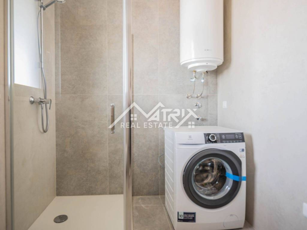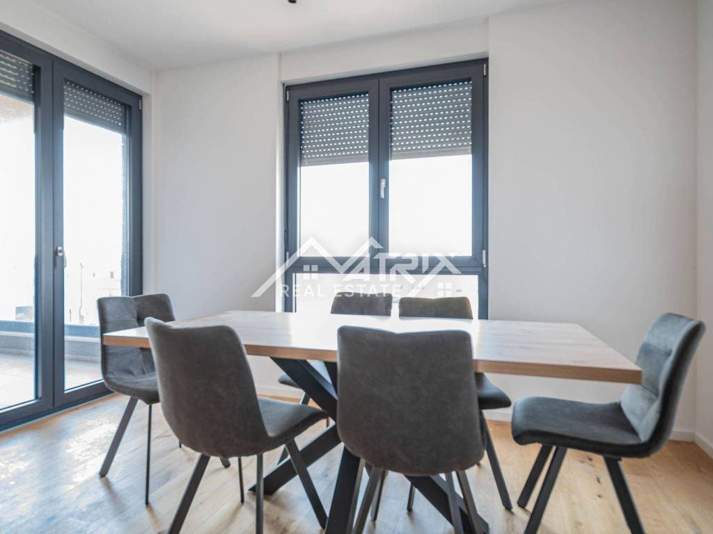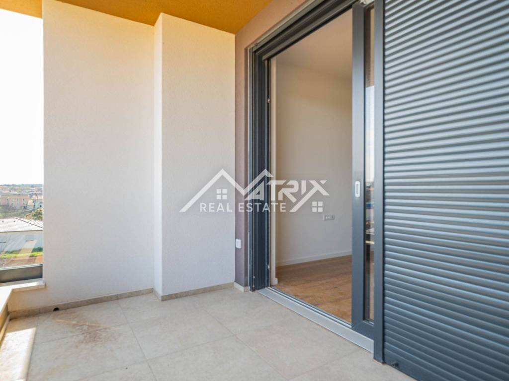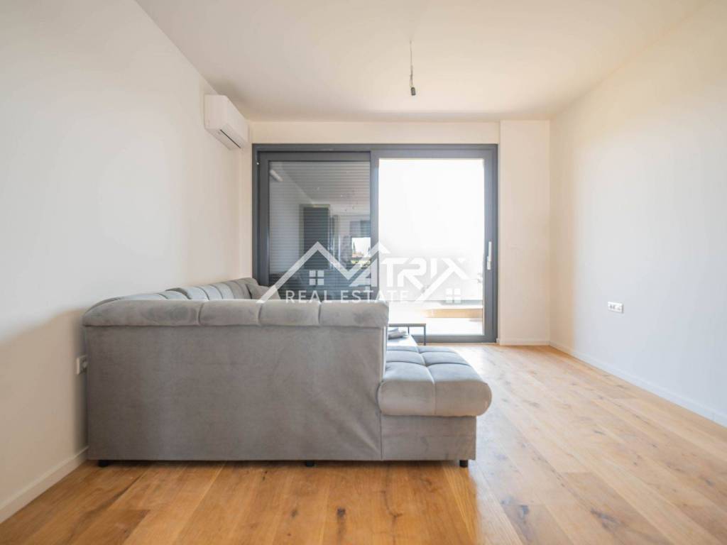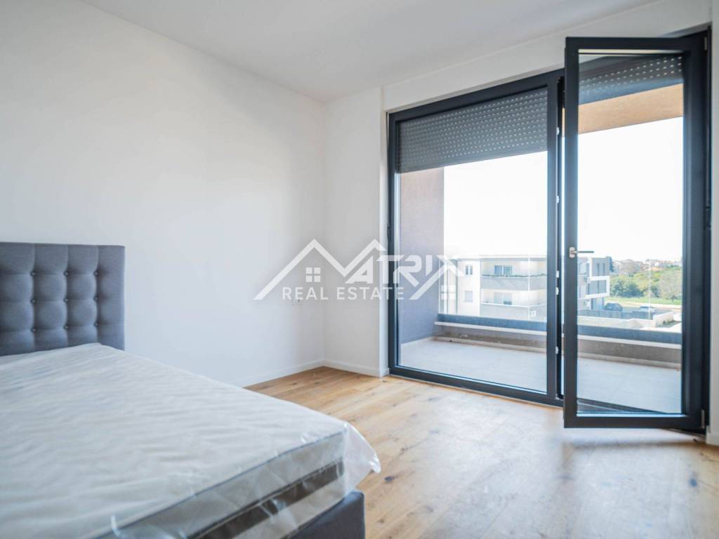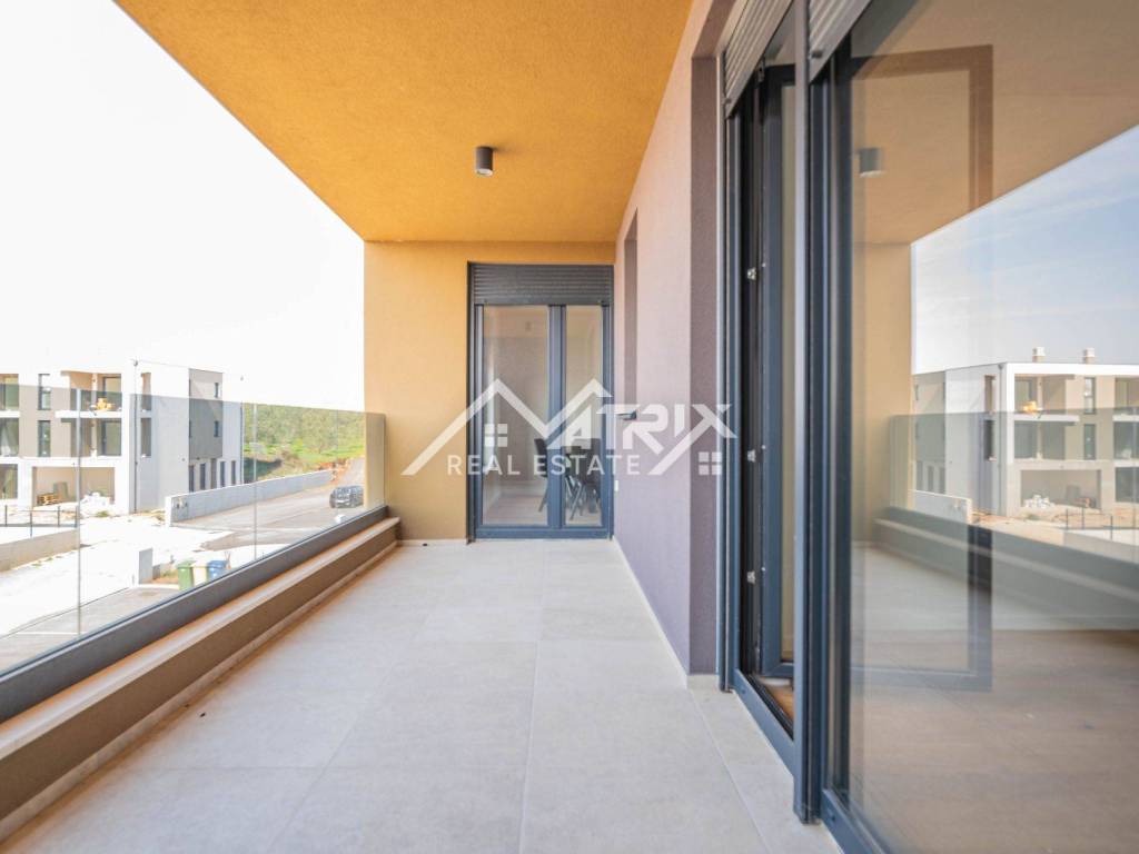 For sale is an apartment on the 2nd floor of a new-build in Pula, in a small building with a total of four apartments. The apartment’s net area is 113.14 m². It is equipped with multi-zone underfloor heating, air-conditioning for heating and cooling, and electric shutters. Oak parquet is installed in the living areas, premium ceramic tiles are fitted, and both bathrooms feature quality sanitary ware.