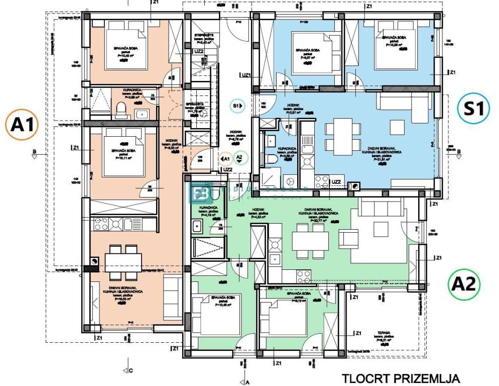 Apartment A1 with a total usable area of 72.33 m2 (living area 50.58 m2 + terrace 10.50 m2 + garden 50 m2 + parking 15 m2) is located on the ground floor. It consists of a hallway, two bedrooms, bathroom, living room with kitchen and dining room, and a terrace with access to the yard of 55 m2. The apartment has one parking space. The price is €260,000 (VAT included - the buyer is exempt from paying 3% real estate tax).