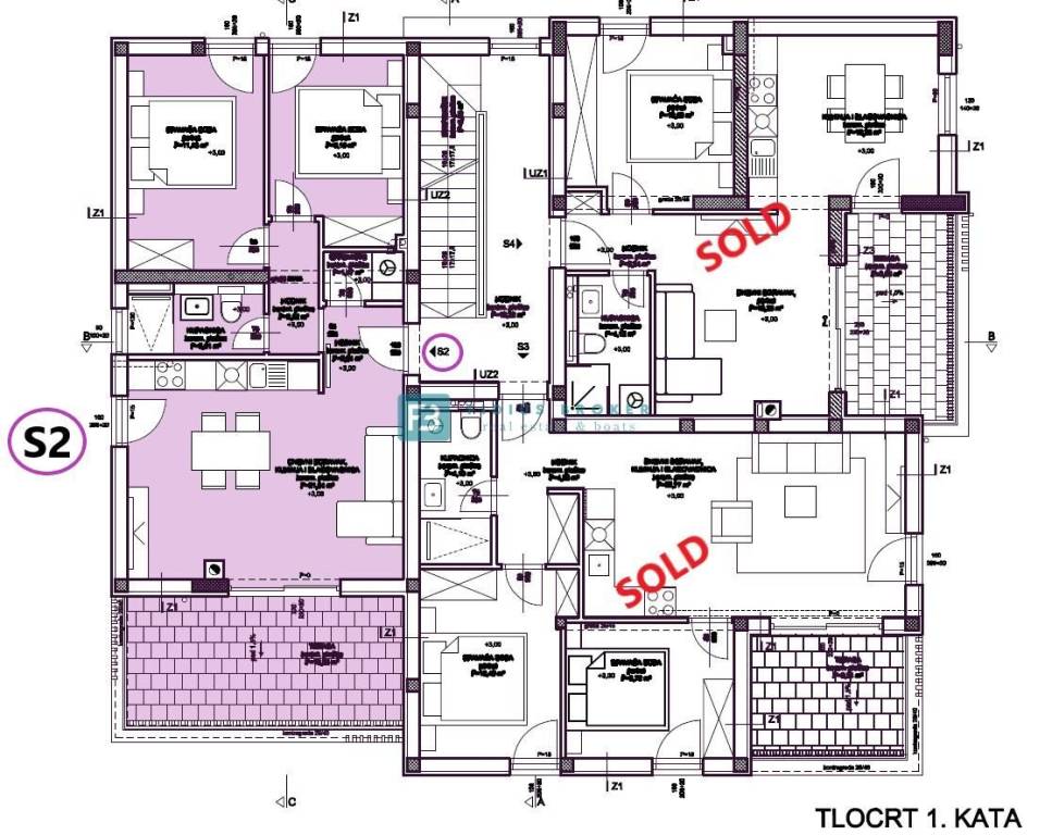 Apartment S1 with a total usable area of 67.89 m2 (living area 48.80 m2 + terrace 13.34 m2 + garden 13 m2 + parking 15 m2) is located on the ground floor. It consists of a hallway, two bedrooms, a bathroom, a living room with a kitchen and a dining room, and a terrace with access to a 13 m2 yard. The apartment has one parking space. The price is €245,000 (VAT included - the buyer is exempt from paying 3% real estate tax).