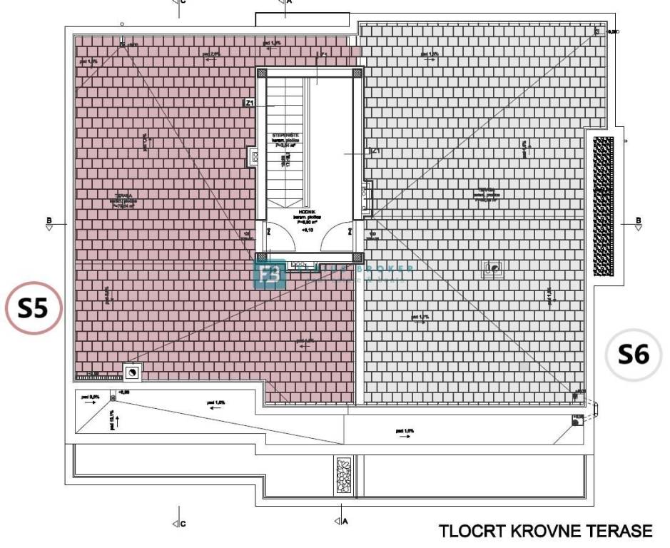 Apartment SJ5 with a total usable area of 131.50 m2 (living area 66.60 m2 + terrace 21.30 + roof terrace 79.84 m2 + parking 15 m2) is located on the 2nd floor. It consists of a hallway, three bedrooms, two bathrooms, laundry room, living room with kitchen and dining room and a terrace of 21.30 m2. An internal shared staircase leads to the 3rd floor (roof terrace) with an area of 79.84 m2, which offers a beautiful view. The apartment has one parking space.