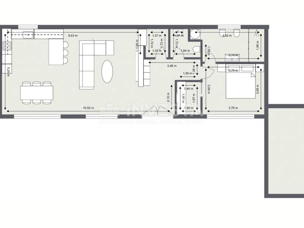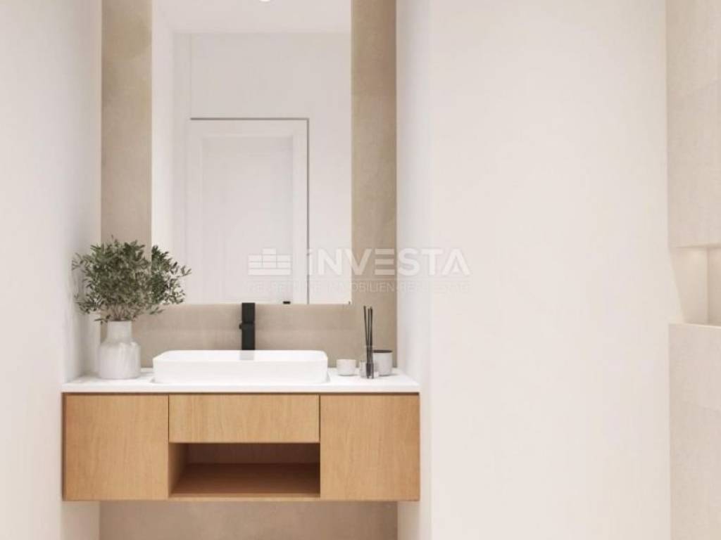 The penthouse has a net area of 129.65 m² and consists of a spacious open-plan living room, dining area, and kitchen with access to an impressive terrace of almost 100 m², offering panoramic views of the sea and surrounding nature. It also includes an entrance hall with access to a guest toilet and practical storage, and an elegant bedroom with en-suite bathroom, walk-in closet, and terrace access.