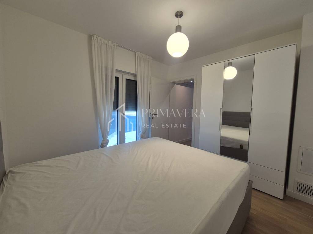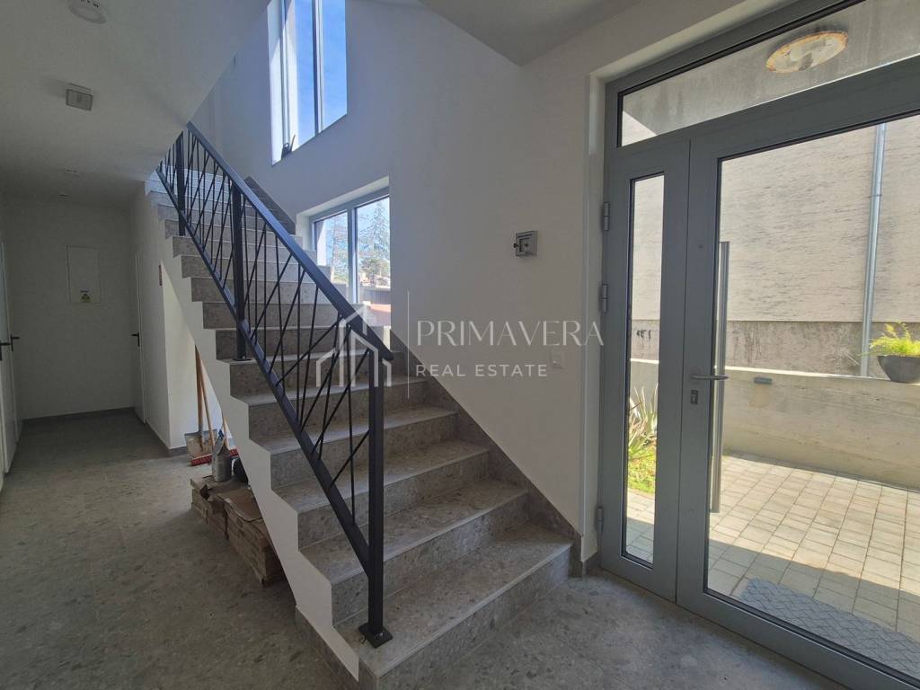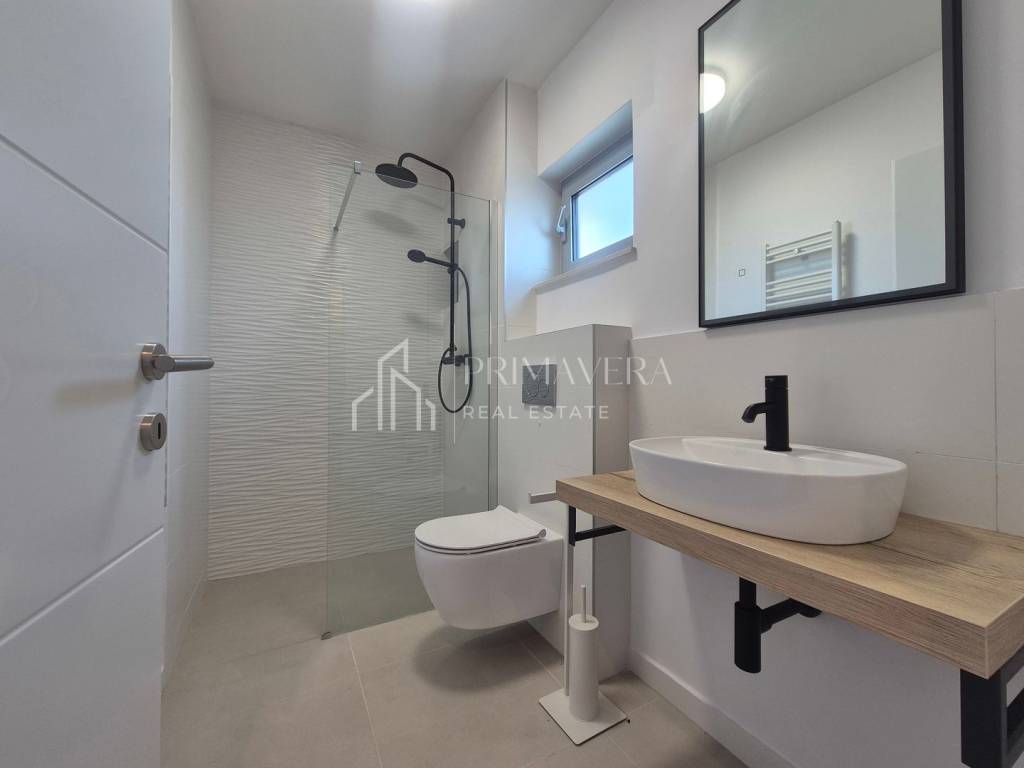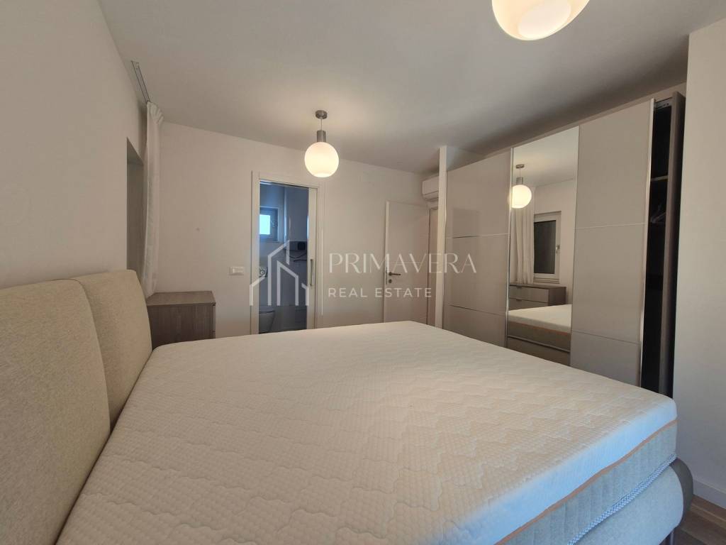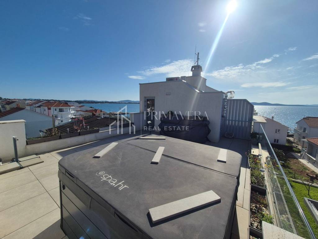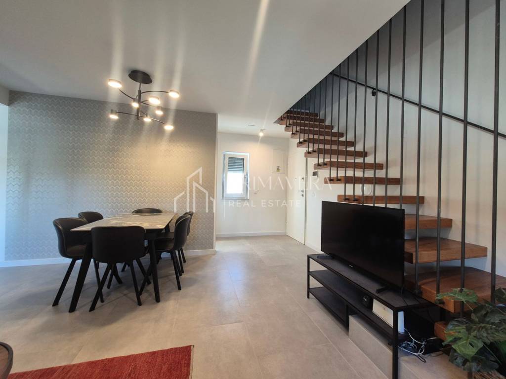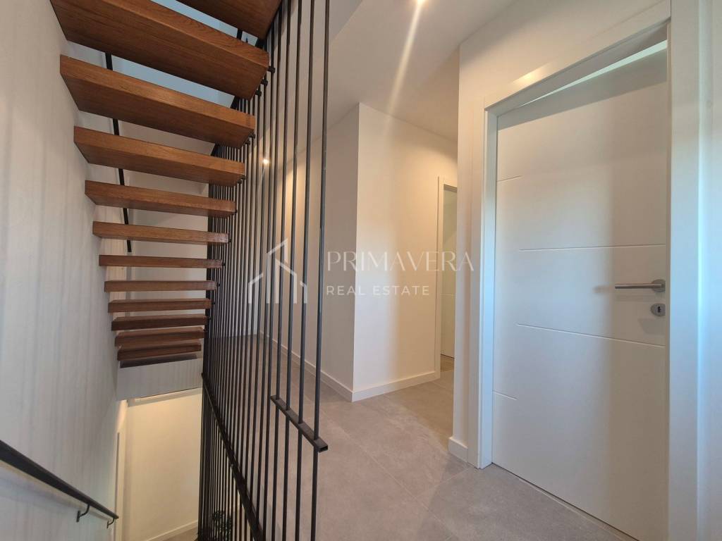 Stan je raspoređen na dvije etaže – 1. i 2. kat zgrade te ima vlastitu krovnu terasu. Na prvoj etaži stana nalazi se: dnevni boravak i blagovaonica, kuhinja, spavaća soba, wc i loggia, a na drugoj etaži smještena je spavaća soba s vlastitom kupaonicom, dvije manje sobe i kupaonica, stepenice koje vode na krovnu terasu i jacuzzijem, a s nje se pruža prekrasan pogled na more. Stanu pripadaju 2 vanjska parkirna mjesta te ostava u prizemlju. Sveukupna korisna vrijednost etažne jedinice S 4 je 105,70 m2. Zgrada je izgrađena kvalitetnim materijalima, postavljena je alu-drvo stolarija s troslojnim staklom, a fasada je obložena grafitnim stiroporom debljine 8cm. Kupaonska oprema je od renomiranih proizvođača, podovi su obloženi keramičkim pločicama prve klase u dnevnom dijelu, a u spavaćim sobama postavljen je hrastov parket prve klase. Grijanje i hlađenje osigurano je klima uređajima. Stan je potpuno namješten i opremljen te odmah useljiv.