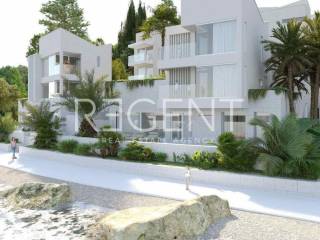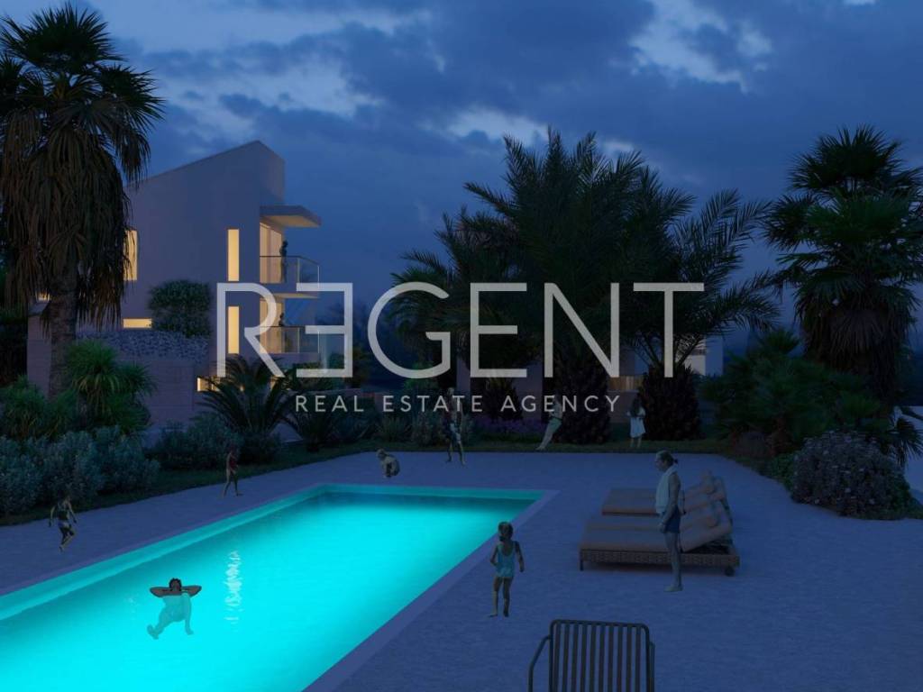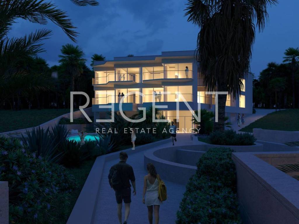 The modern luxury villa is located in the first row to the sea, along a landscaped promenade in the peaceful and sought-after part of Seget Donji. Thanks to the open panoramic view of the sea and islands and the layout on four floors, this property represents an exceptional opportunity for luxurious family living, but also for investment in high-category tourist rental. The villa extends through the basement, ground floor, first and second floor, and each space is carefully designed to provide maximum comfort and privacy. The basement has a private wellness and recreation area which includes a fitness area of 36.34 m², a sauna, a wellness zone, a bathroom, a laundry room, an entrance hall and a staircase with a corridor. The ground floor consists of the main living area with a spacious living room of 37.28 m², an entrance area with a staircase, a bathroom, an additional toilet and one bedroom. From the living room you exit onto a spacious terrace of 47.99 m² with a swimming pool, which offers an unobstructed view of the sea and is ideal for staying outdoors. On the first floor there are stairs, a bathroom, a spacious room of 24.23 m² and a loggia of 6.73 m² with an open view. The second floor follows the layout of the first and includes stairs, a bathroom, a room of 24.91 m² and a loggia of 6.73 m², also with a panoramic view of the sea and islands. The property is equipped with underfloor heating, air conditioning and security doors, and the villa also has a garage, which further increases the level of practicality and comfort. Located right by the sea and promenade, the villa offers peace and privacy, while at the same time it is excellently connected by transport. In the immediate vicinity is the historical center of Trogir, while Split is only a short drive away. The proximity of all important facilities, restaurants, shops and the airport further emphasizes the attractiveness of this location. Payment is organized in construction phases: 30% upon signing, 30% during construction, 30% before completion and 10% upon completion and handover. For more information or to arrange a viewing of this exclusive villa in the first row to the sea, feel free to contact us.