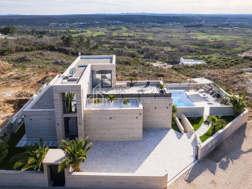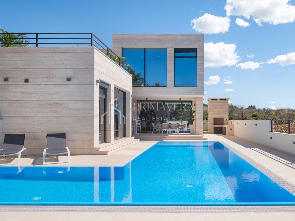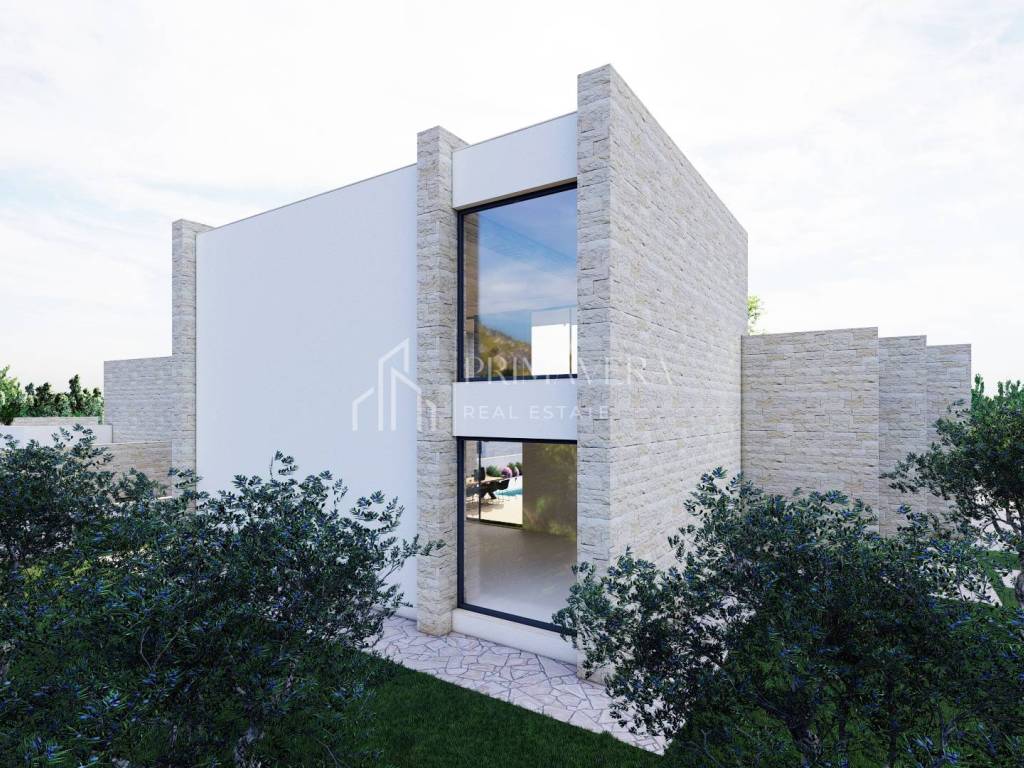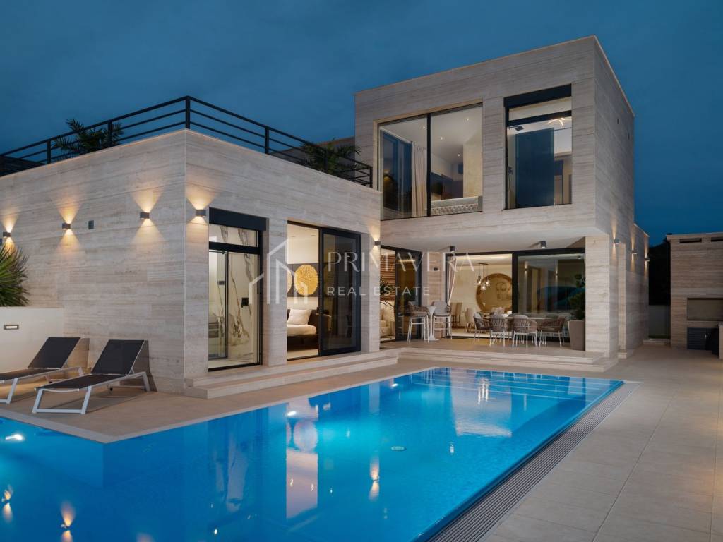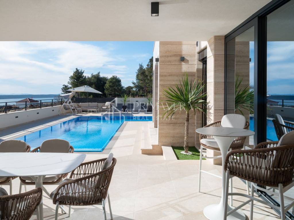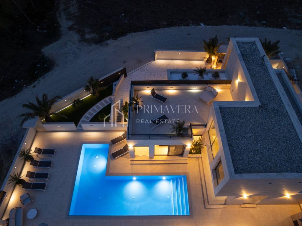 Vila se sastoji od prizemlja i kata. Prizemlje sadrži hodnik, praonicu, toalet, spavaću soba s garderobom i vlastitom kupaonicom, prostrani dnevni boravak s kuhinjom i blagovaonicom te izlazom na natkrivenu terasu s koje se pristupa sunčalištu i bazenu, odakle se pruža prekrasan otvoreni pogled na more. Na katu su smještene još dvije spavaće sobe s vlastitim kupaonicama i garderobama, te natkrivena i nenatkrivena terasa. Sa vile se pruža predivan pogled na more! Na posjedu se nalaze dva parkirna mjesta, grijani preljevni bazen i punionica za električno vozilo. Ova moderna vila izgrađena je od vrhunskih materijala, uključujući talijanski travertin, prirodni kamen i keramičke pločice, a odlikuje se elementima od prirodnog drva i luksuznim vanjskim prostorima. Sadržaji uključuju podno grijanje u svim prostorijama, klimatizaciju, video nadzor, sustav za bežično upravljanje, grijani bazen, vanjski tuš, roštilj s ljetnom kuhinjom i još mnogo toga.