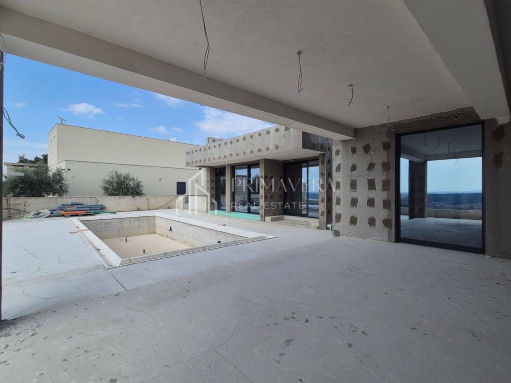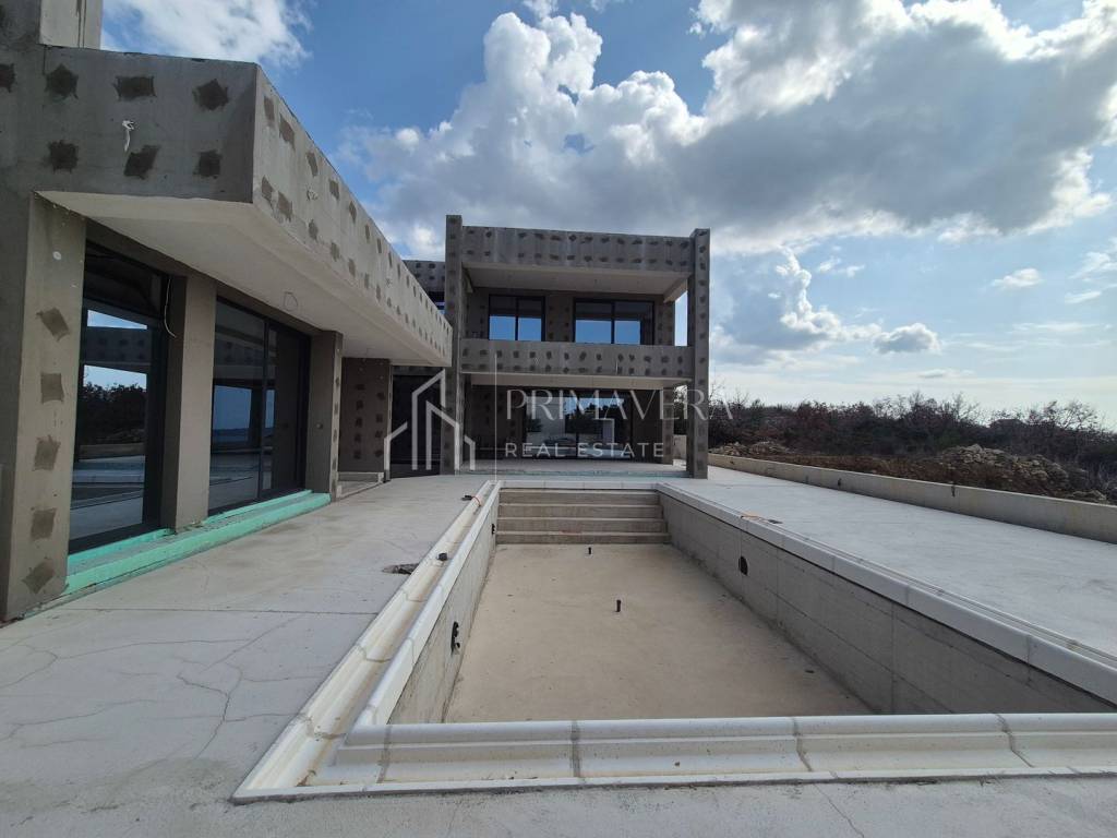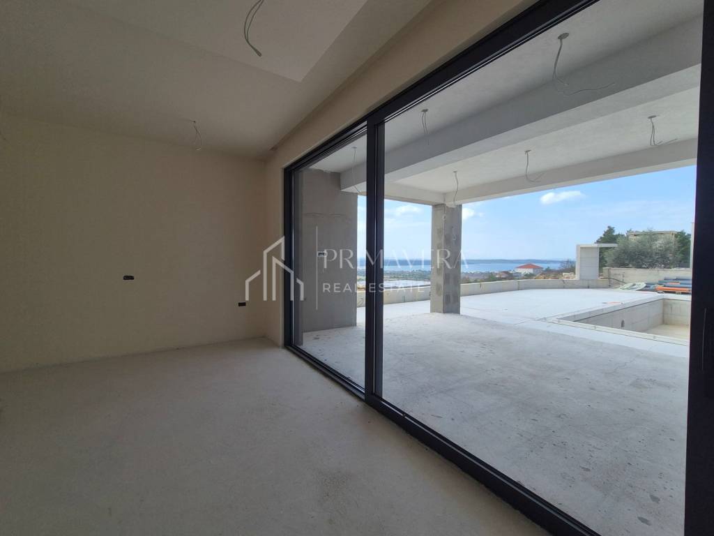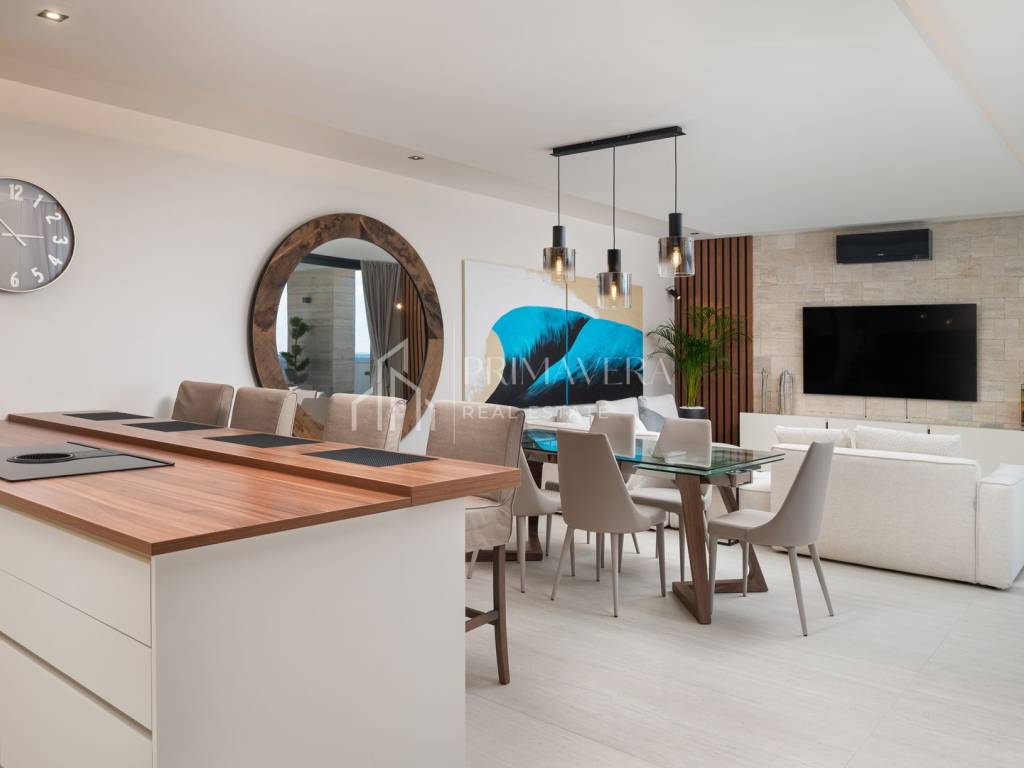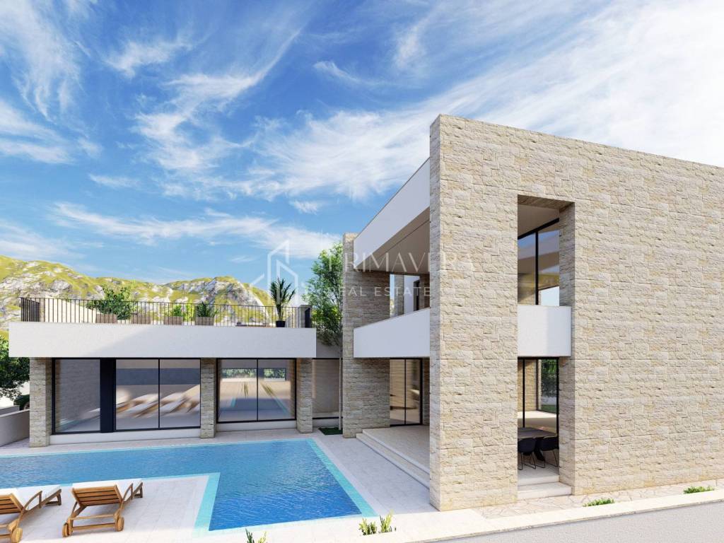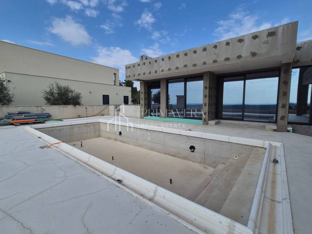 Vila se sastoji od prizemlja i kata. Prizemlje sadrži hodnik, praonicu, toalet, spavaću soba s garderobom i vlastitom kupaonicom, prostrani dnevni boravak s kuhinjom i blagovaonicom te izlazom na natkrivenu terasu s koje se pristupa sunčalištu i bazenu, odakle se pruža prekrasan otvoreni pogled na more. Na katu su smještene još dvije spavaće sobe s vlastitim kupaonicama i garderobama, te natkrivena i nenatkrivena terasa. Sa vile se pruža predivan pogled na more! Na posjedu se nalaze dva parkirna mjesta, grijani preljevni bazen i punionica za električno vozilo. Ova moderna vila izgrađena je od vrhunskih materijala, uključujući talijanski travertin, prirodni kamen i keramičke pločice, a odlikuje se elementima od prirodnog drva i luksuznim vanjskim prostorima. Sadržaji uključuju podno grijanje u svim prostorijama, klimatizaciju, video nadzor, sustav za bežično upravljanje, grijani bazen, vanjski tuš, roštilj s ljetnom kuhinjom i još mnogo toga.