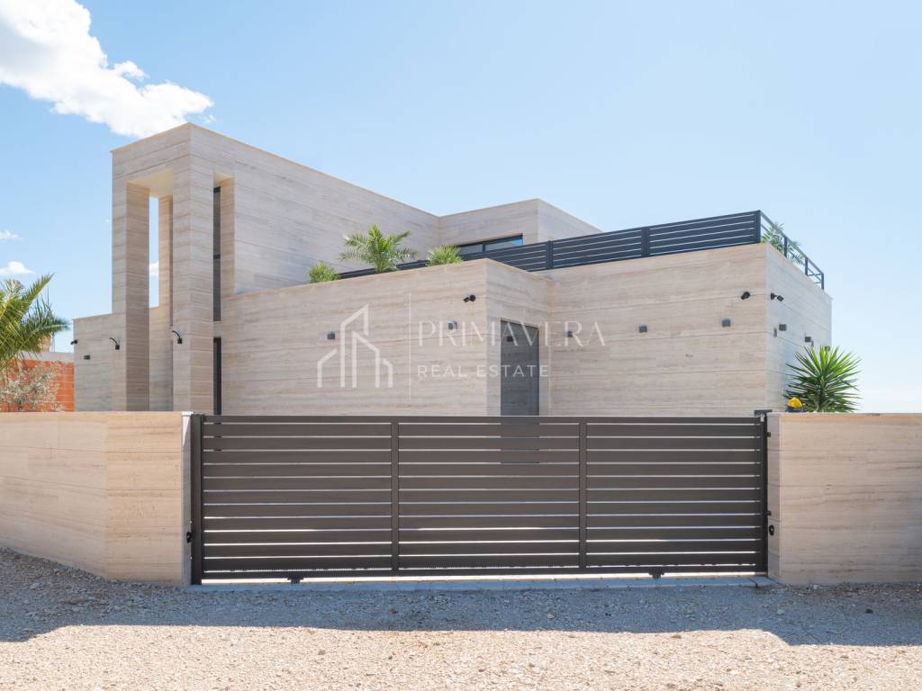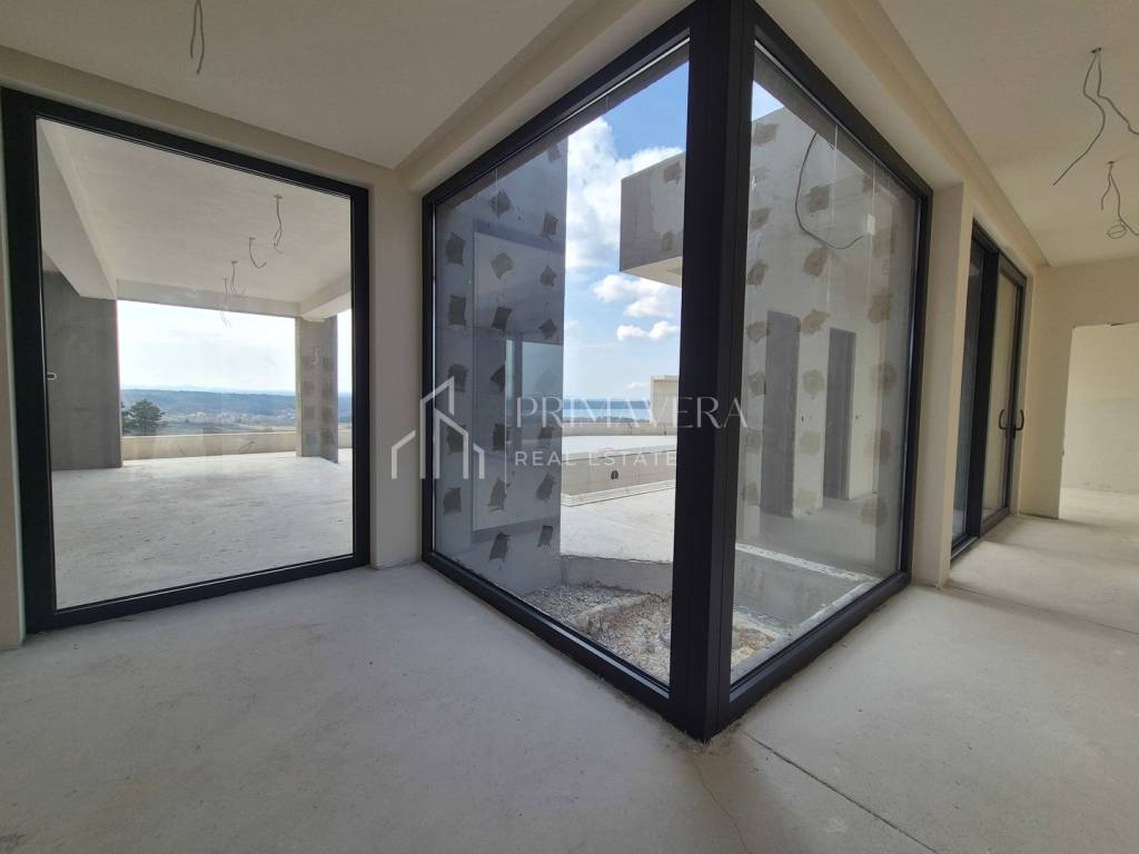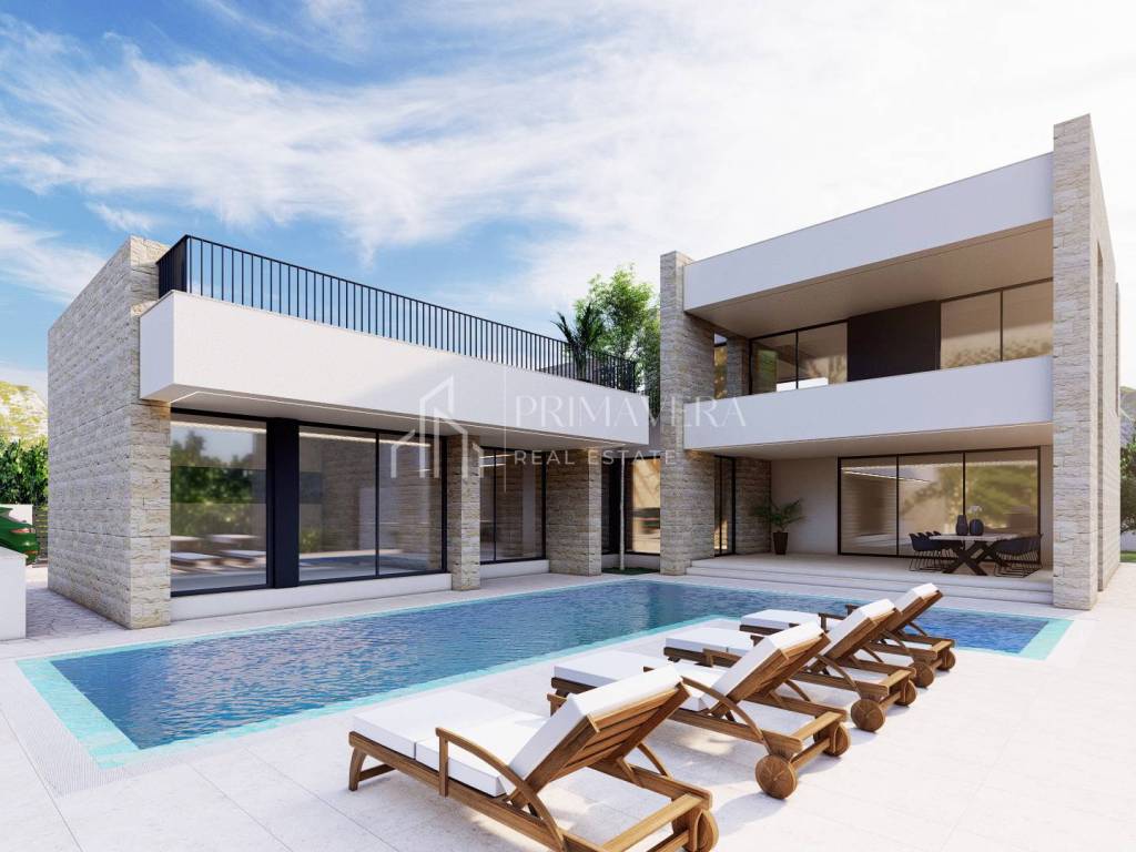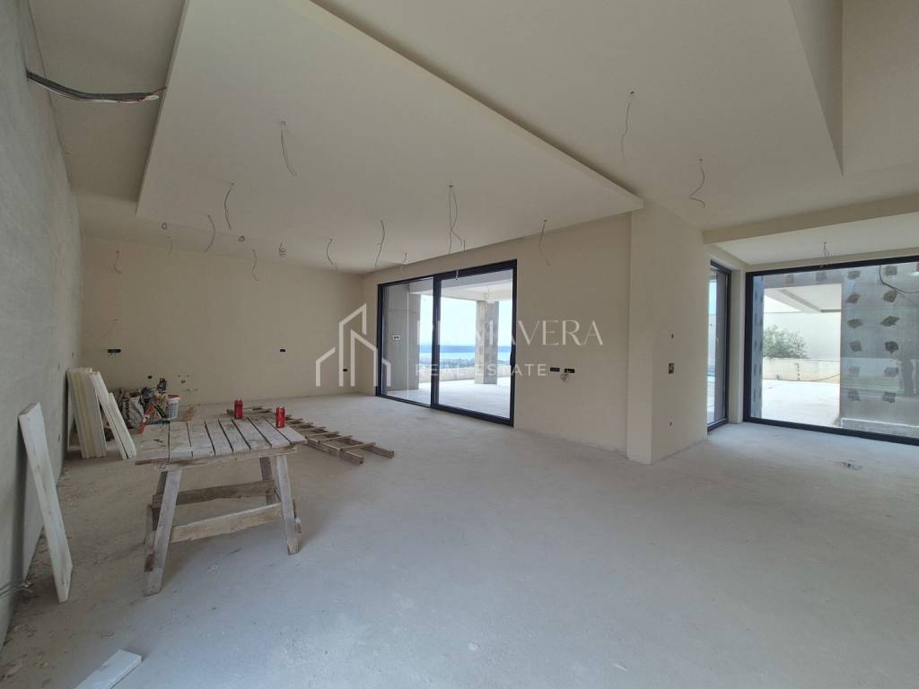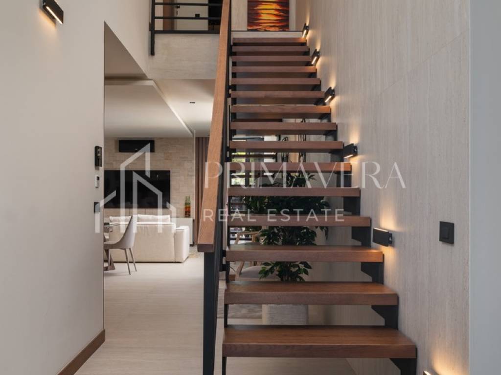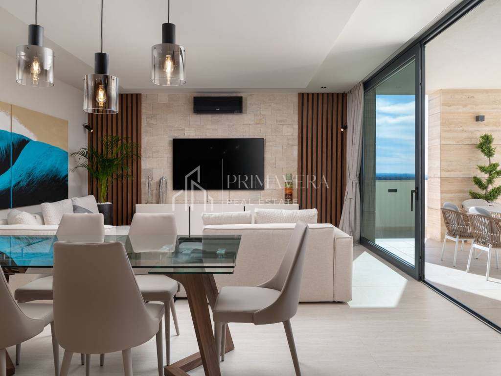 Vila se sastoji od prizemlja i kata. Prizemlje sadrži hodnik, praonicu, toalet, spavaću soba s garderobom i vlastitom kupaonicom, prostrani dnevni boravak s kuhinjom i blagovaonicom te izlazom na natkrivenu terasu s koje se pristupa sunčalištu i bazenu, odakle se pruža prekrasan otvoreni pogled na more. Na katu su smještene još dvije spavaće sobe s vlastitim kupaonicama i garderobama, te natkrivena i nenatkrivena terasa. Sa vile se pruža predivan pogled na more! Na posjedu se nalaze dva parkirna mjesta, grijani preljevni bazen i punionica za električno vozilo. Ova moderna vila izgrađena je od vrhunskih materijala, uključujući talijanski travertin, prirodni kamen i keramičke pločice, a odlikuje se elementima od prirodnog drva i luksuznim vanjskim prostorima. Sadržaji uključuju podno grijanje u svim prostorijama, klimatizaciju, video nadzor, sustav za bežično upravljanje, grijani bazen, vanjski tuš, roštilj s ljetnom kuhinjom i još mnogo toga.
