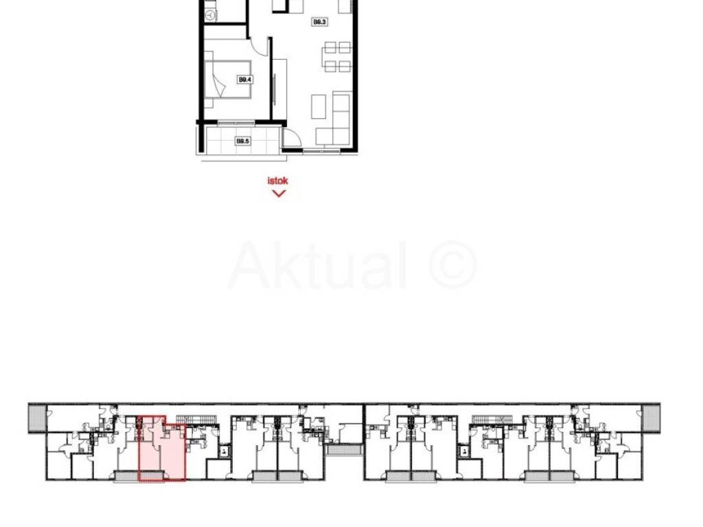 Stan oznake B9 nalazi se na I-katu zgrade, ukupne površine 47.73 m2 a sastoji se od ulaznog prostora/hodnika, kuhinje sa blagovaonicom i dnevnim boravkom, sobe, kupaonice i loggie.